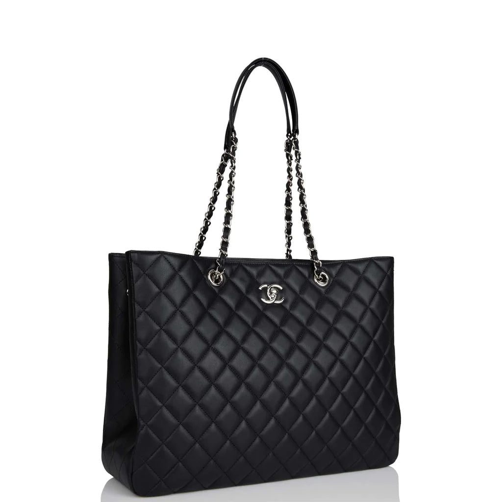 This Timeless tote bag is made of black calfskin with silver-tone hardware; Features the CC signature clasp, rear exterior slip pocket, and interwoven silver tone chain link, and black leather shoulder straps.