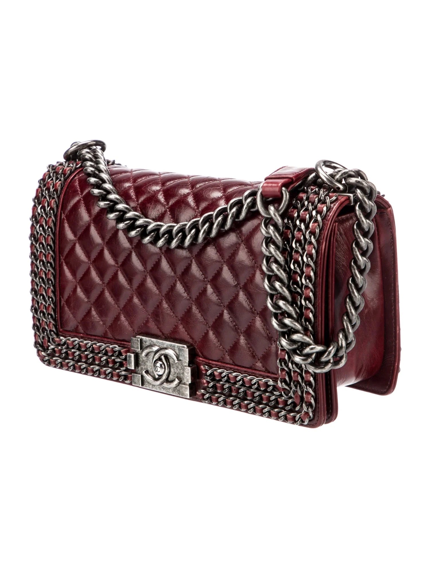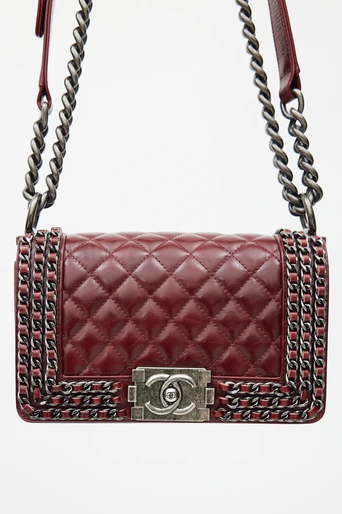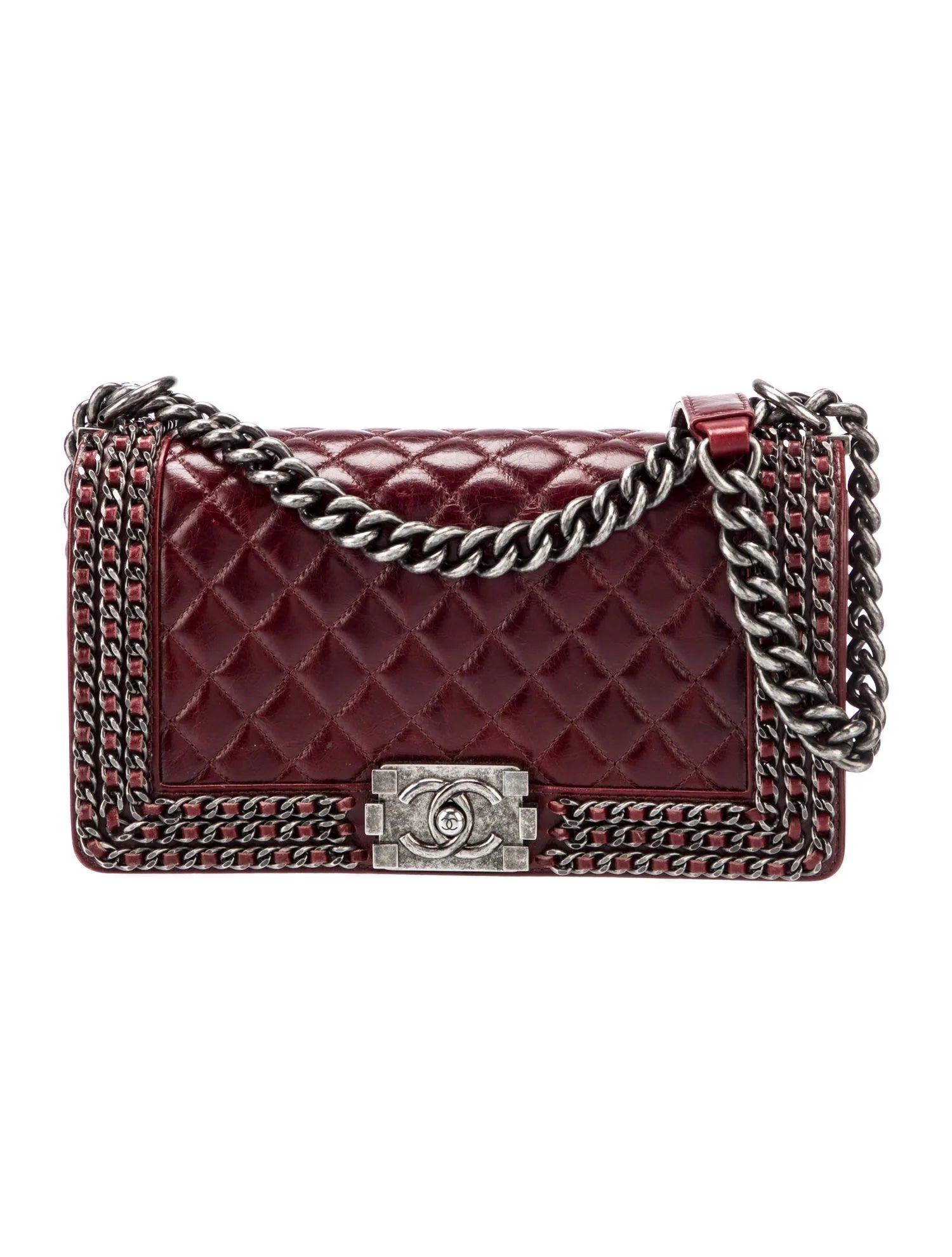 This Chanel Stunning Burgundy Boy shoulder bag featuring quilted leather, aged gunmetal hardware, braided chain trim at top flap, push lock closure with CC logo, adjustable shoulder strap, one lined compartment, and slip pocket inside. Comes with original dust bag.