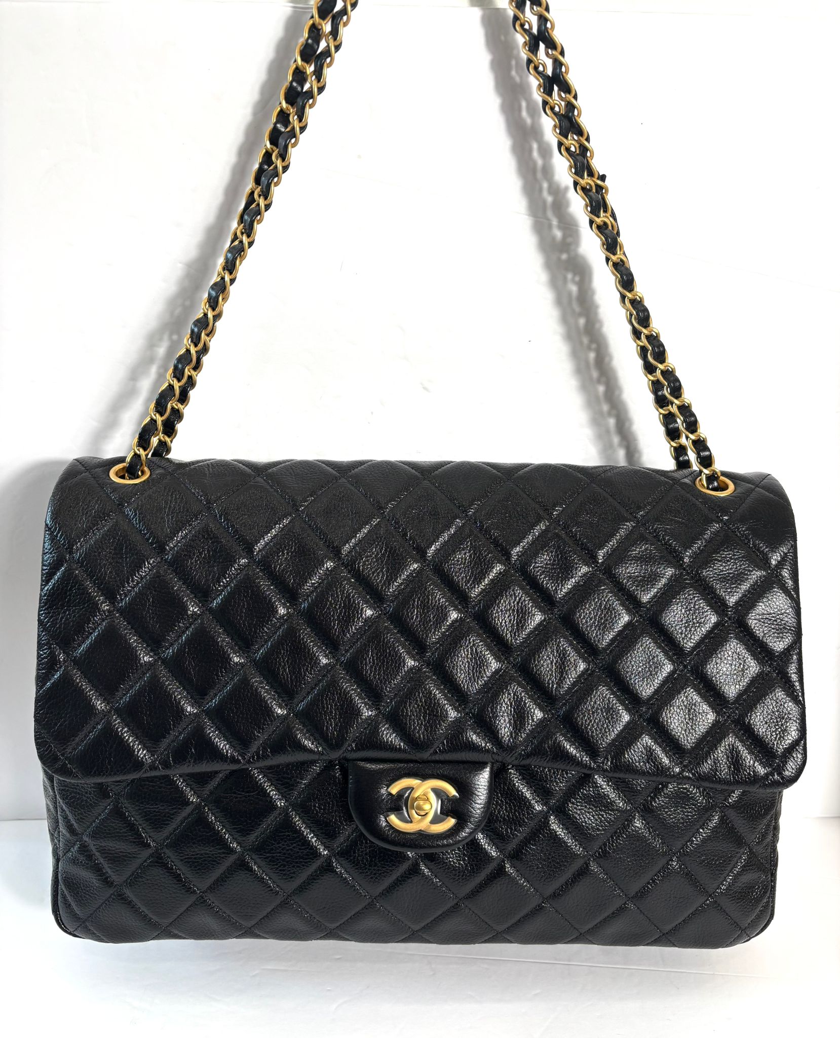 Travel in timeless style with this luxurious Chanel travel bag, expertly crafted from black quilted calfskin leather. The design features a gold-tone chain-link shoulder strap interwoven with black leather, a rear slip pocket for easy access, and signature gold hardware throughout.