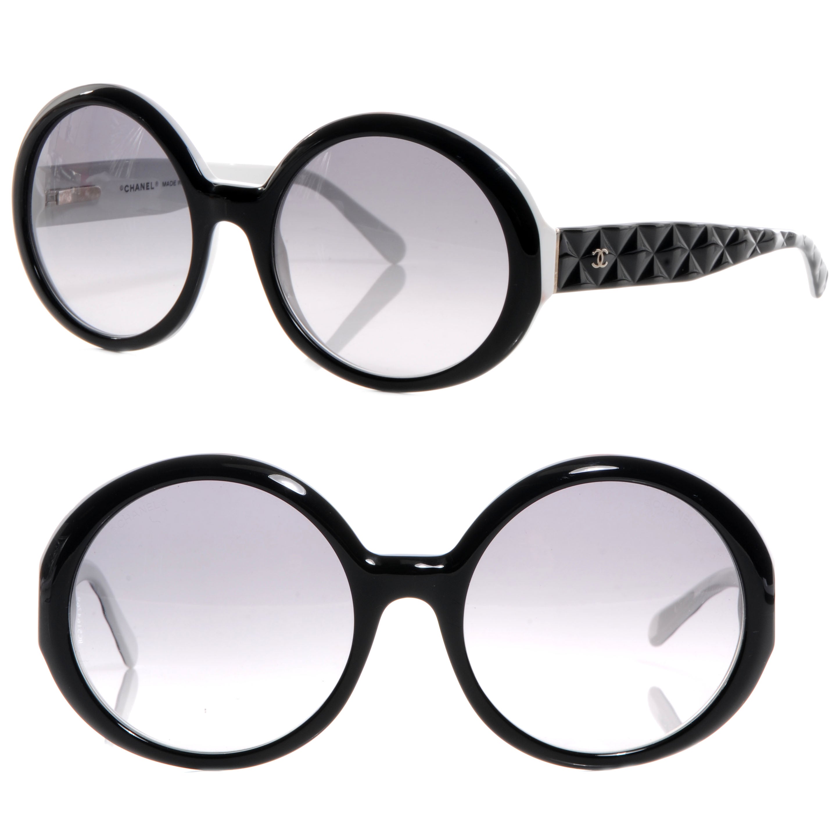 These stylish sunglasses feature black frames with a white border and large round rims and lenses with a faint gradient violet grey tint. Each hinge has a small signature Chanel CC logo in silver and the arms are a faux quilt.Â