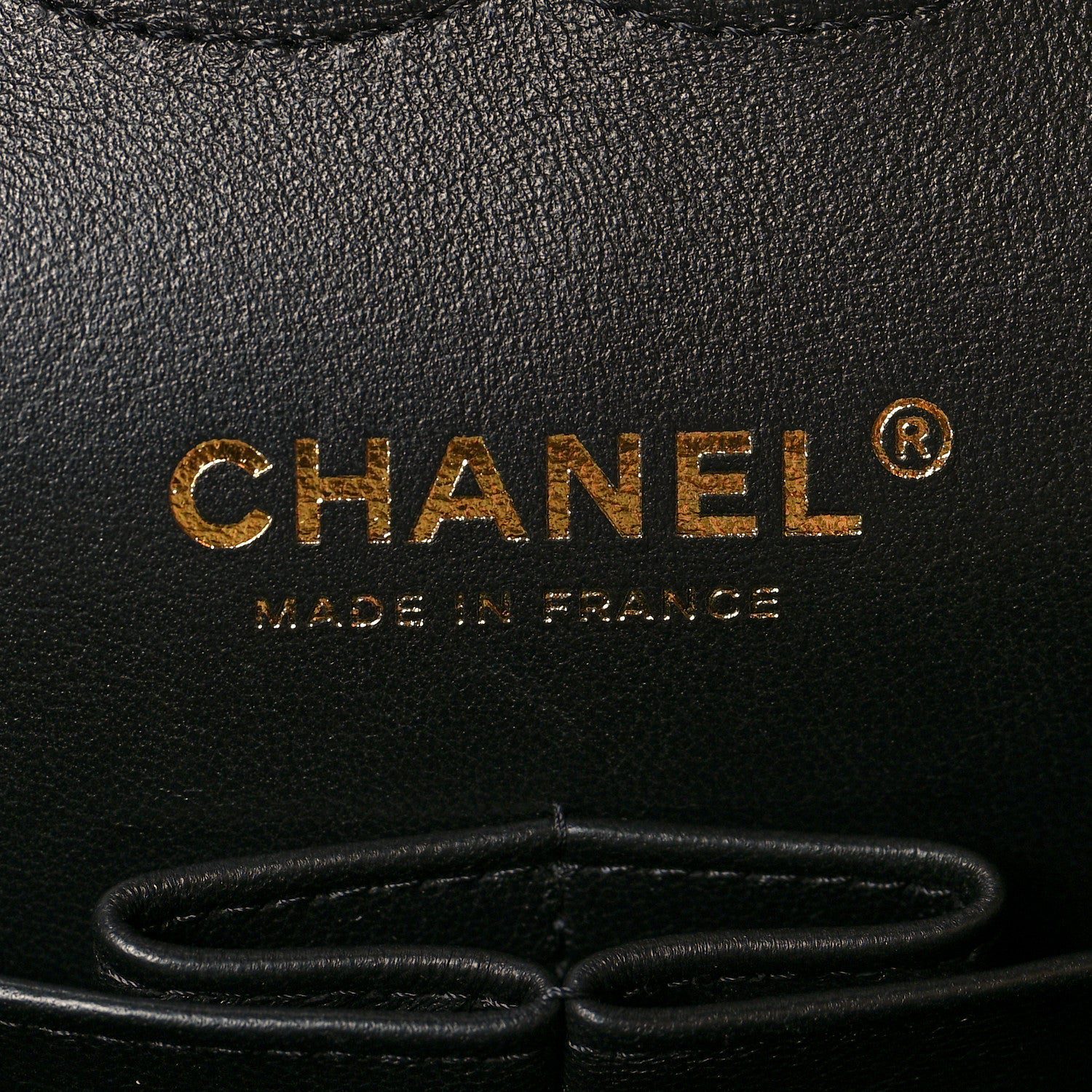 This classic style is beautifully crafted of soft black diamond quilted lambskin leather. This bag features a polished gold chain link shoulder straps threaded with black leather, an exterior flat pocket, and a front flap with a gold Chanel CC turn lock. The front flap opens to an inner flap and a black leather interior with patch pockets.