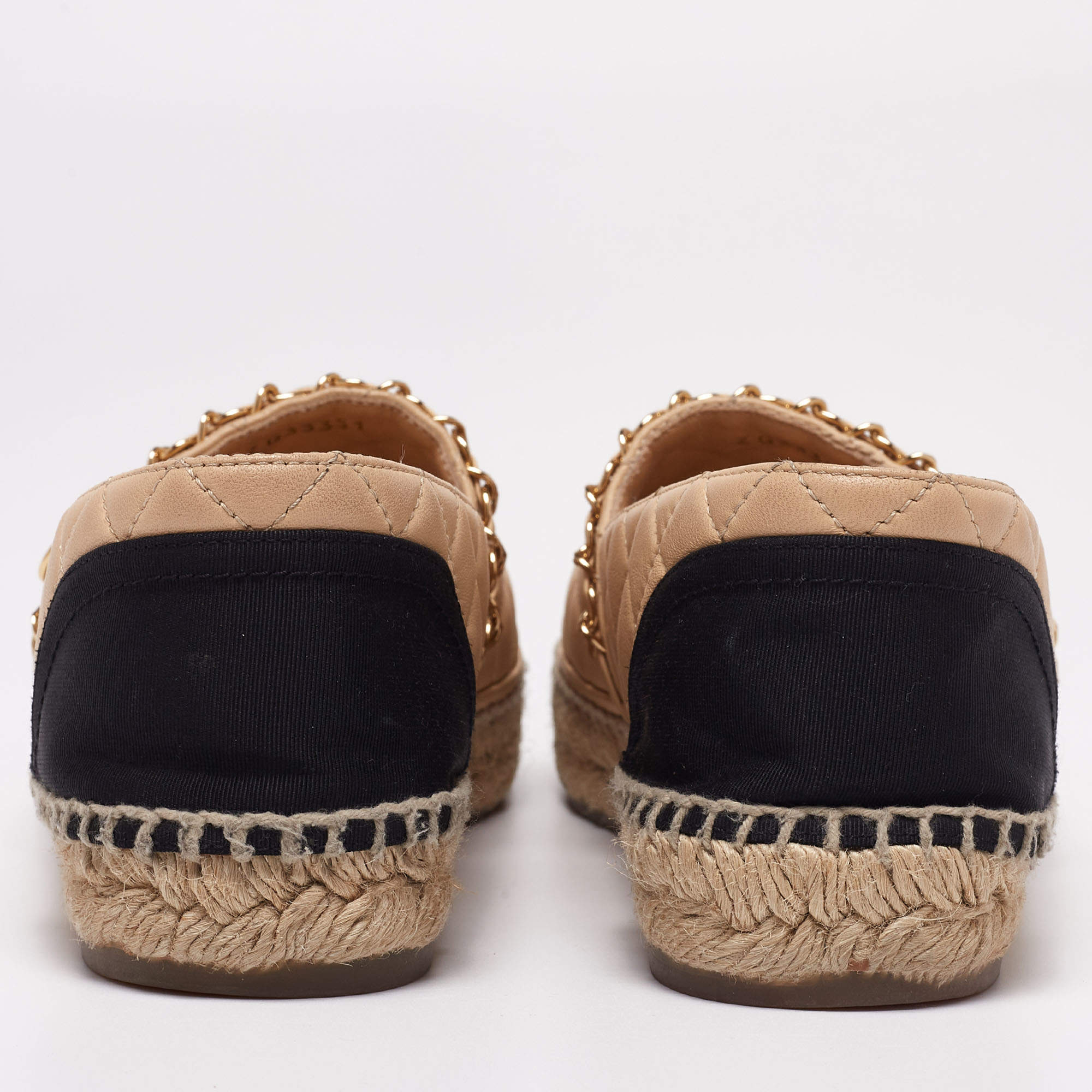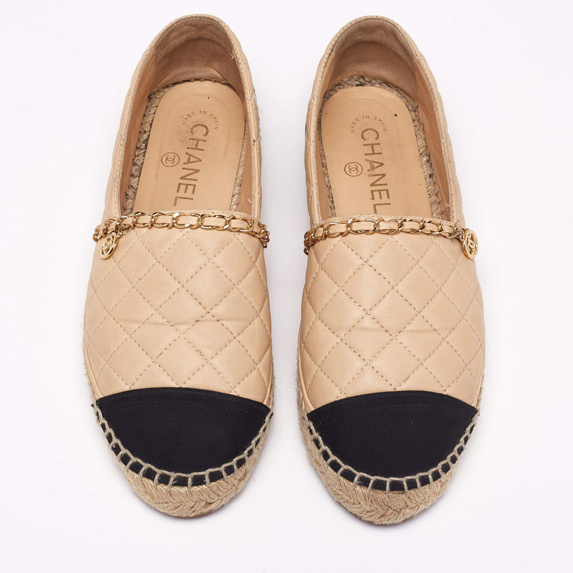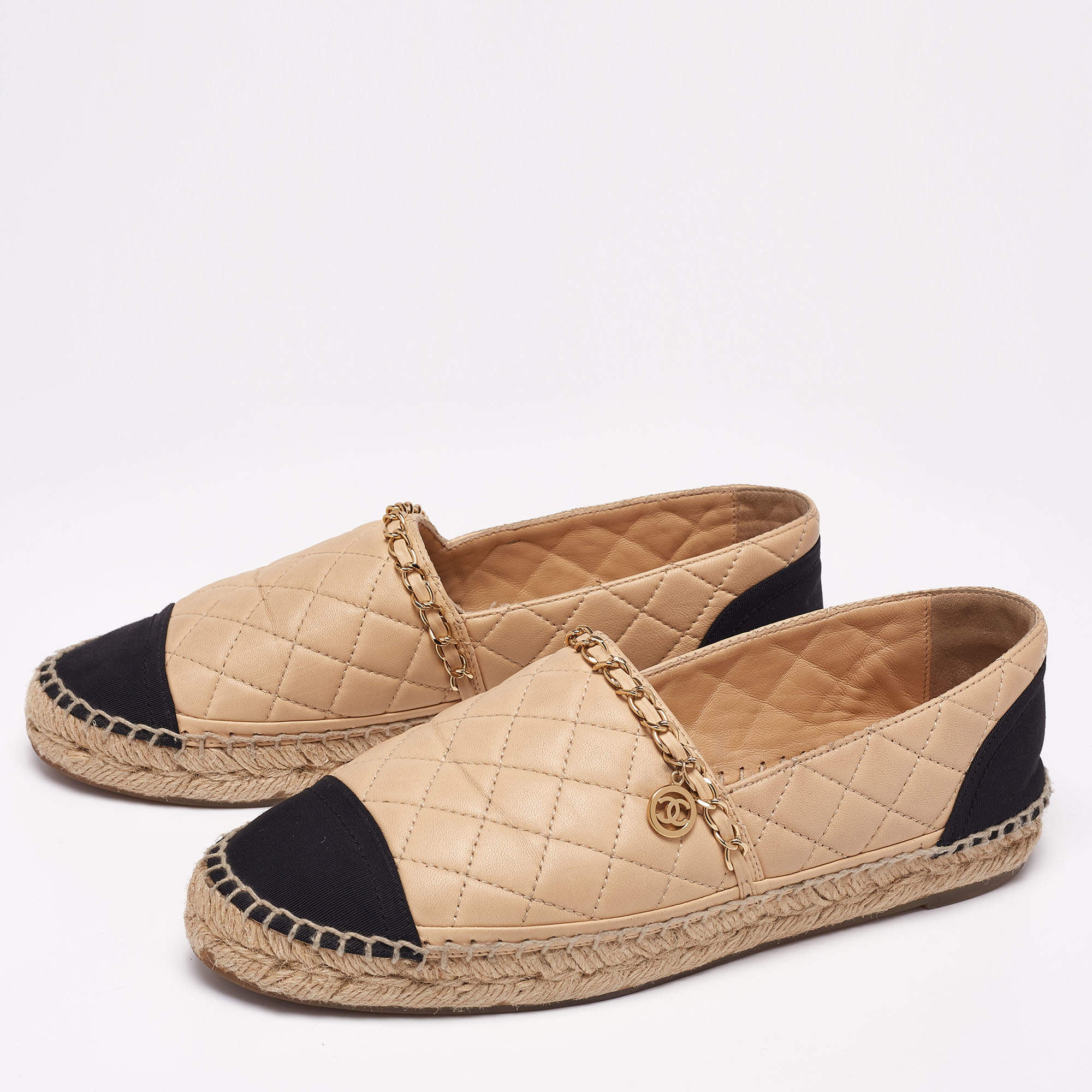 These flats feature braided midsoles with beige quilted uppers, a leather weaved chain detail with the CC logo, and black cap toes & counters.