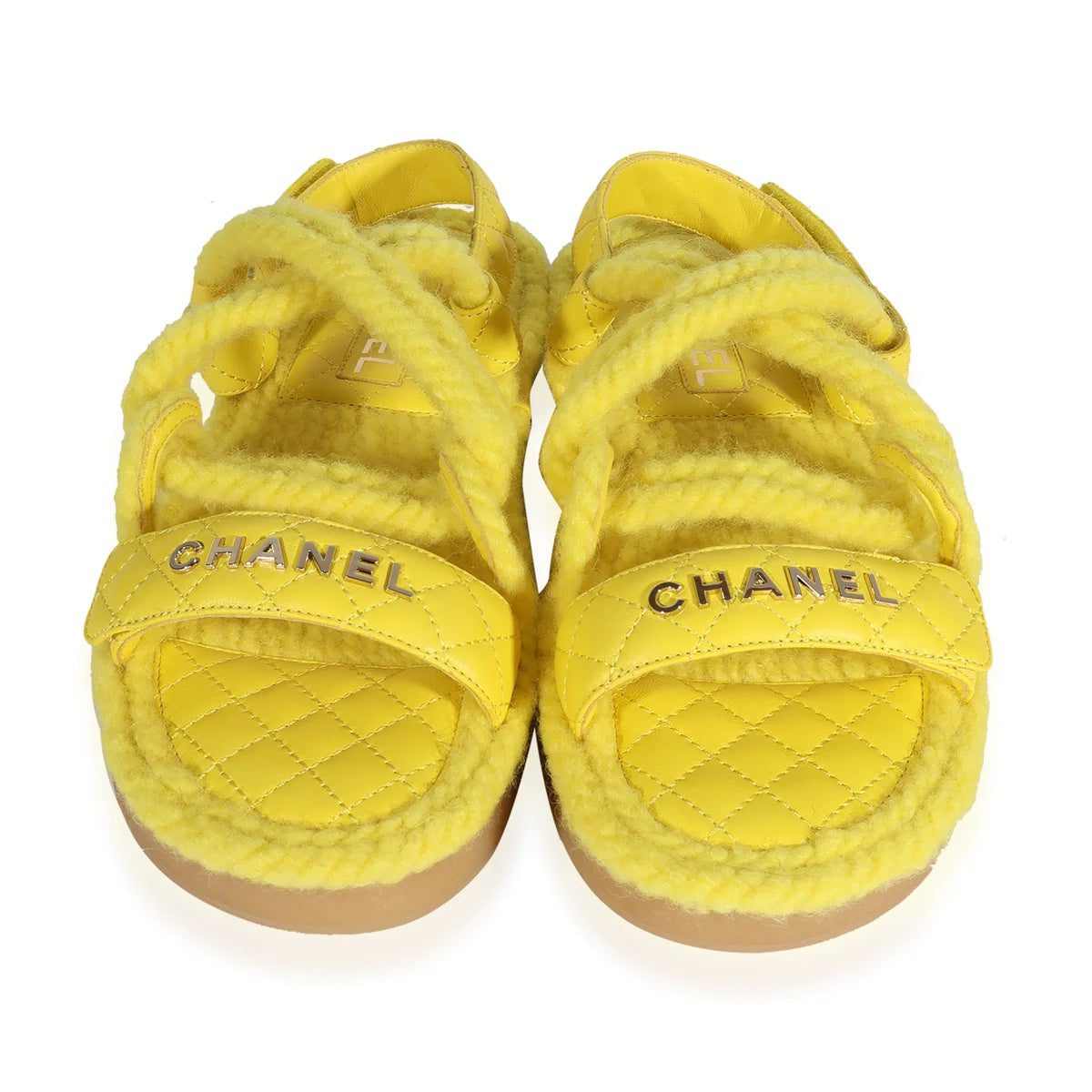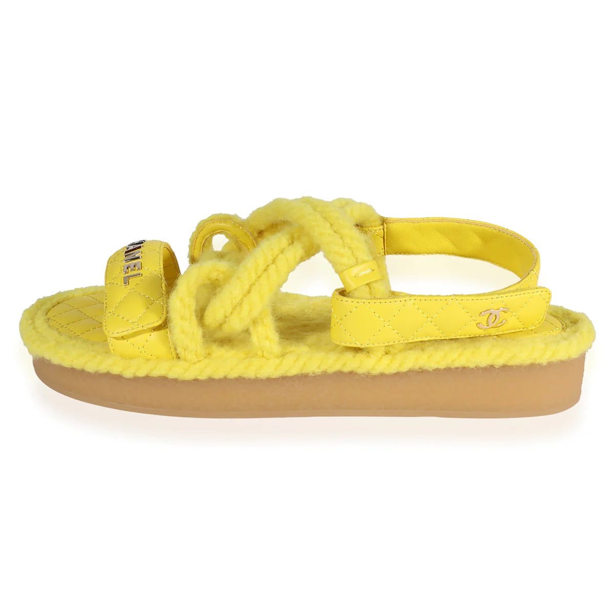 These casual yet chic yellow woven sandals feature a quilted lambskin leather footbed in yellow, and a crossover strap embellished with a gold Chanel logo.