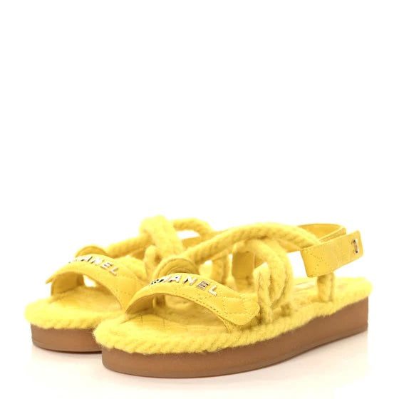 CHANEL Cord Lambskin Quilted Logo Slingback Sandals Yellow.