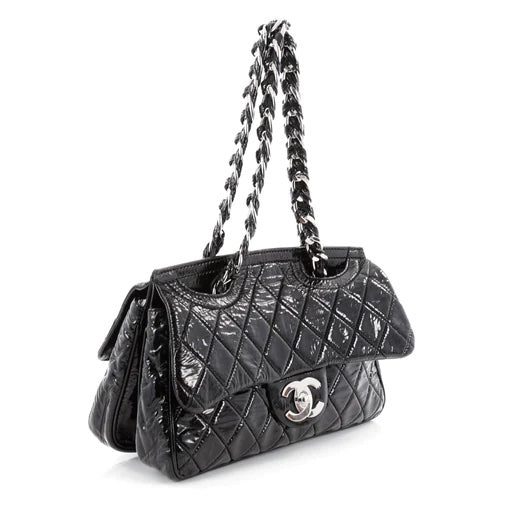 This stunning shoulder bag from Chanel is crafted from black patent leather. The bag features celebrated House codes, a double-sided flap closure, a shoulder chain link, and fabric lining. This creation is easy to carry on any day.