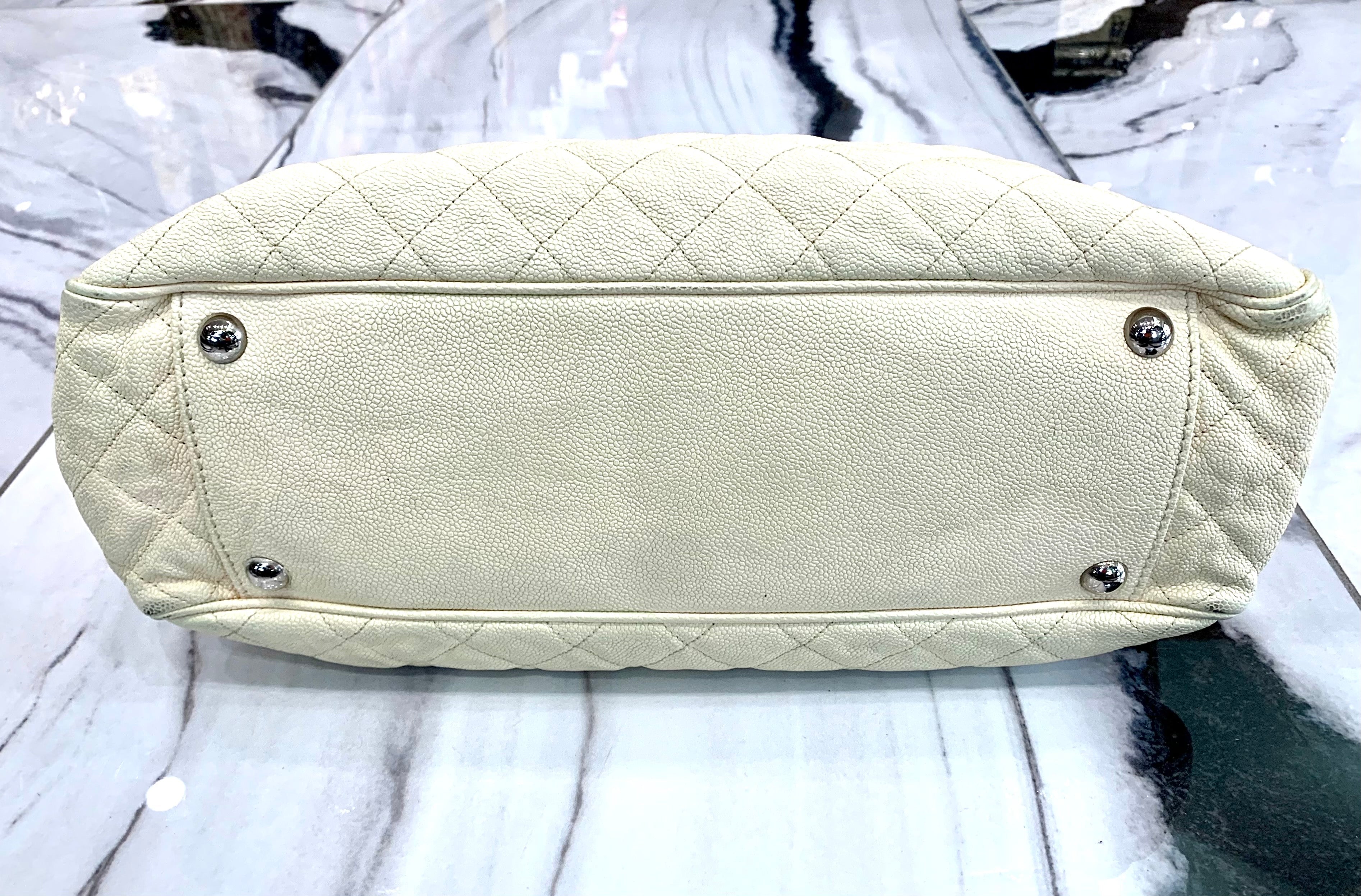 CHANEL Cream Quilted Caviar Shopping Tote Bag