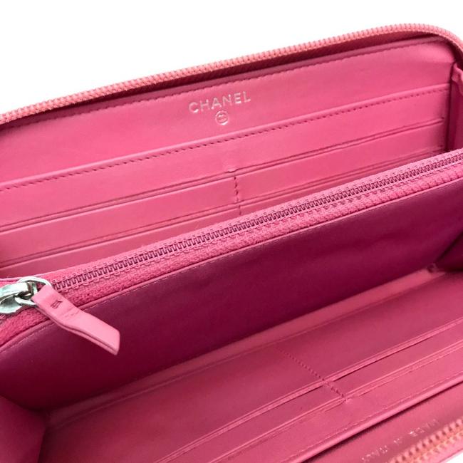 This clutch wallet is crafted of camellia abstract patterned embossed lambskin leather in pink and features a gold-tone CC logo on the front with a gold-tone wrap-around zipper. The wallet opens to a leather interior with card slots and patch pockets on each side, as well as a center zip compartment.
