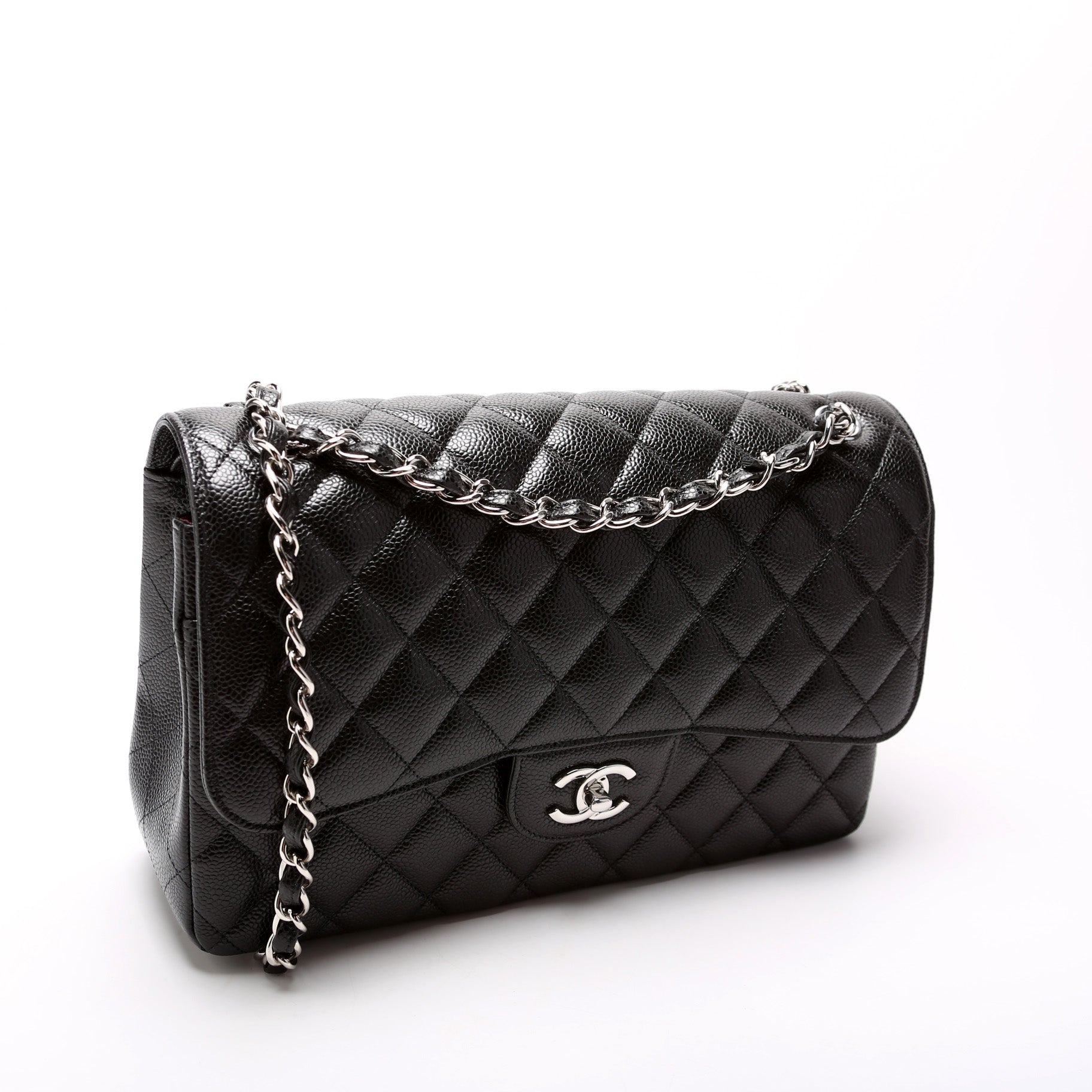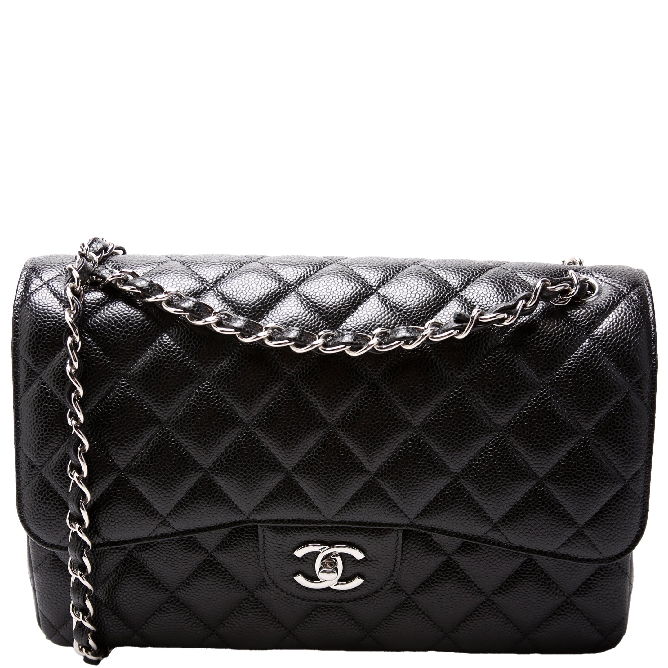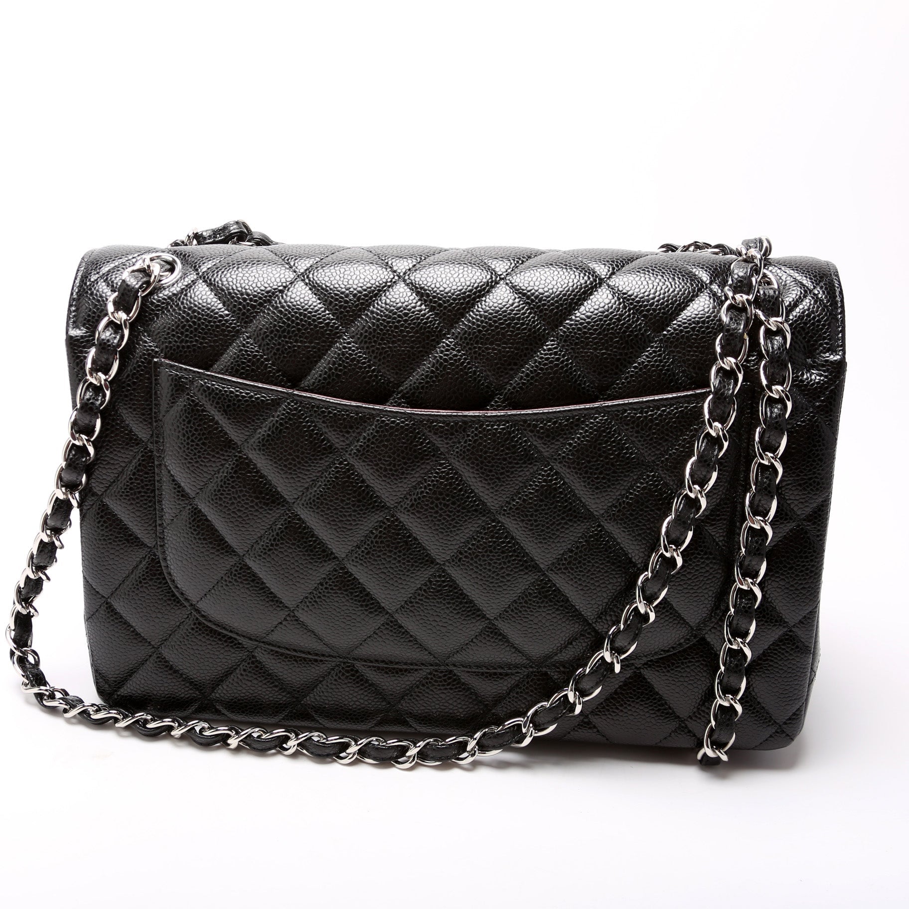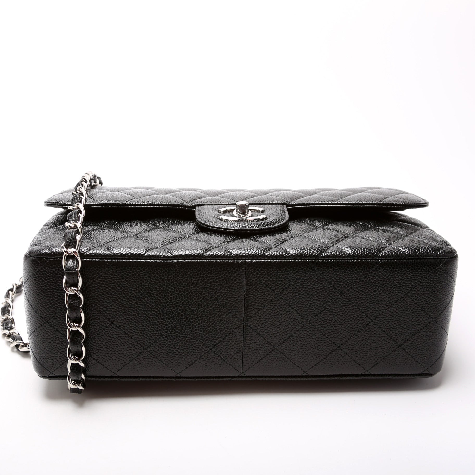 Chanel Classic Flap Jumbo. The exterior is in the classic Chanel Caviar leather. Â