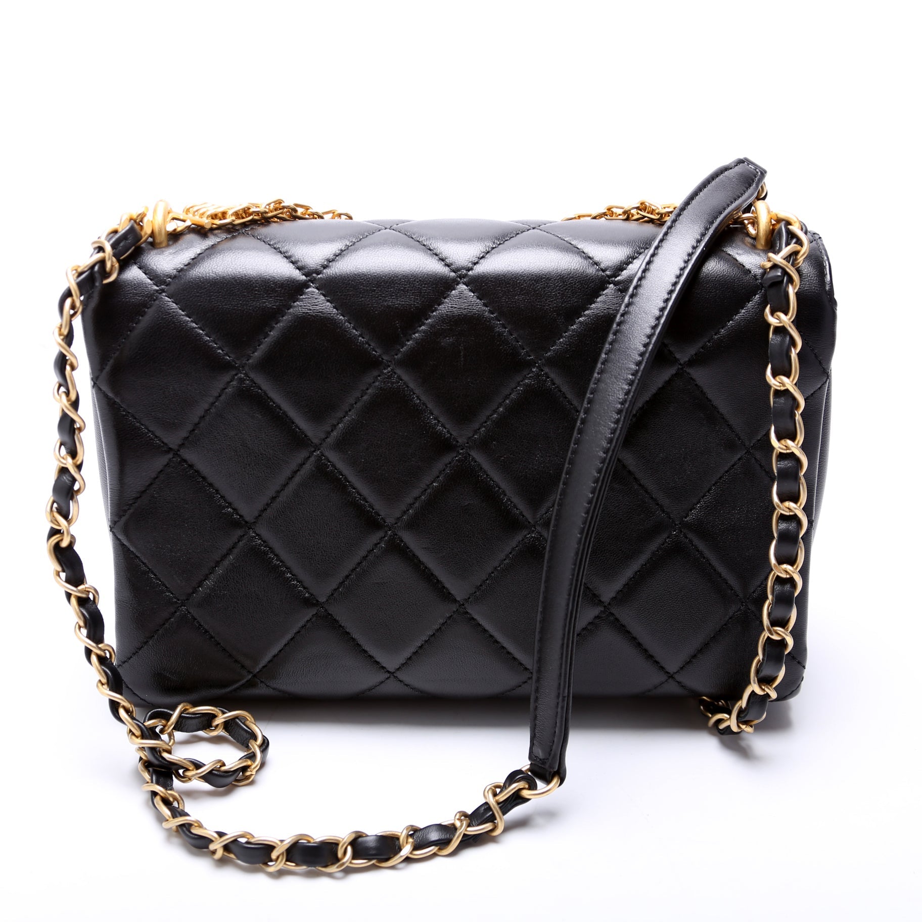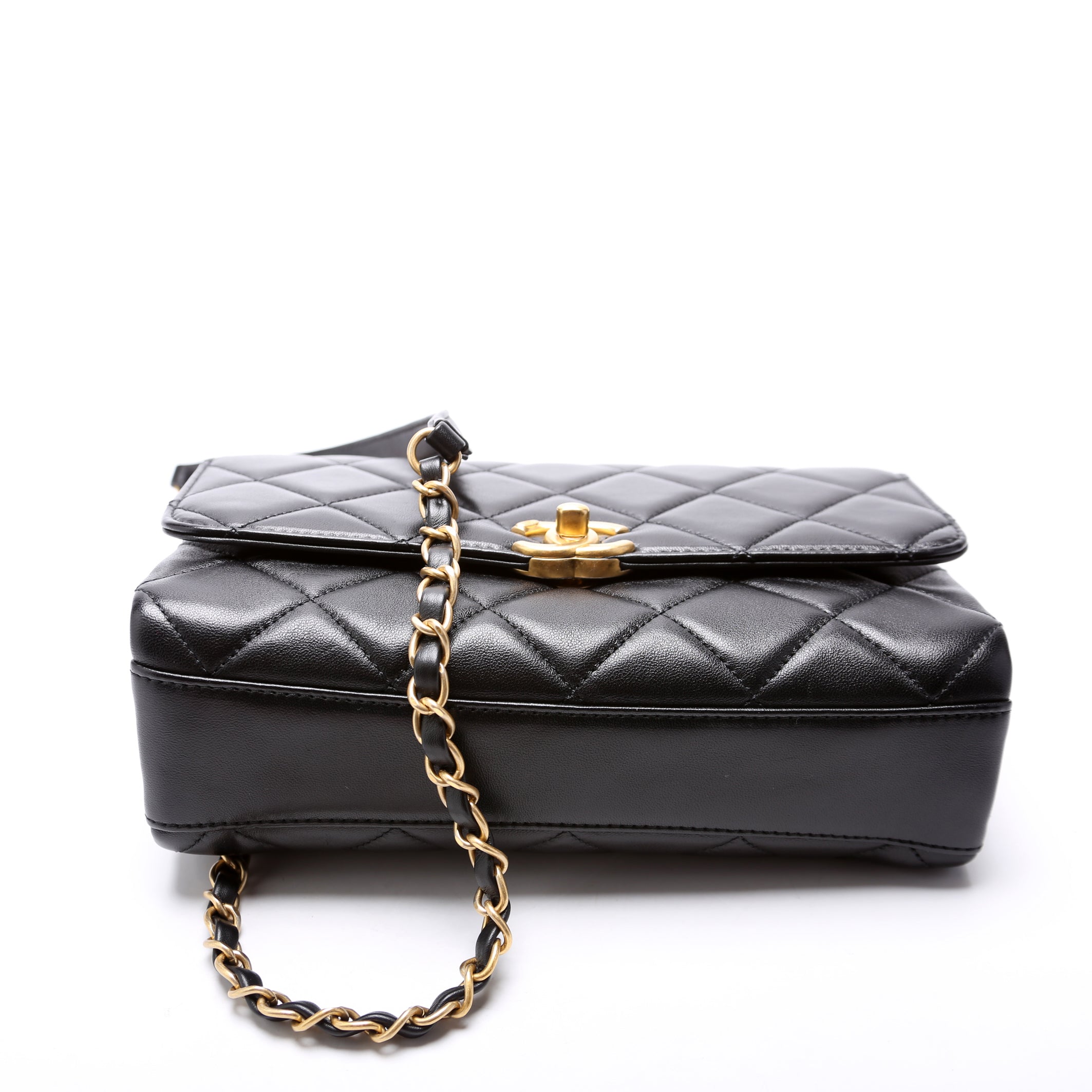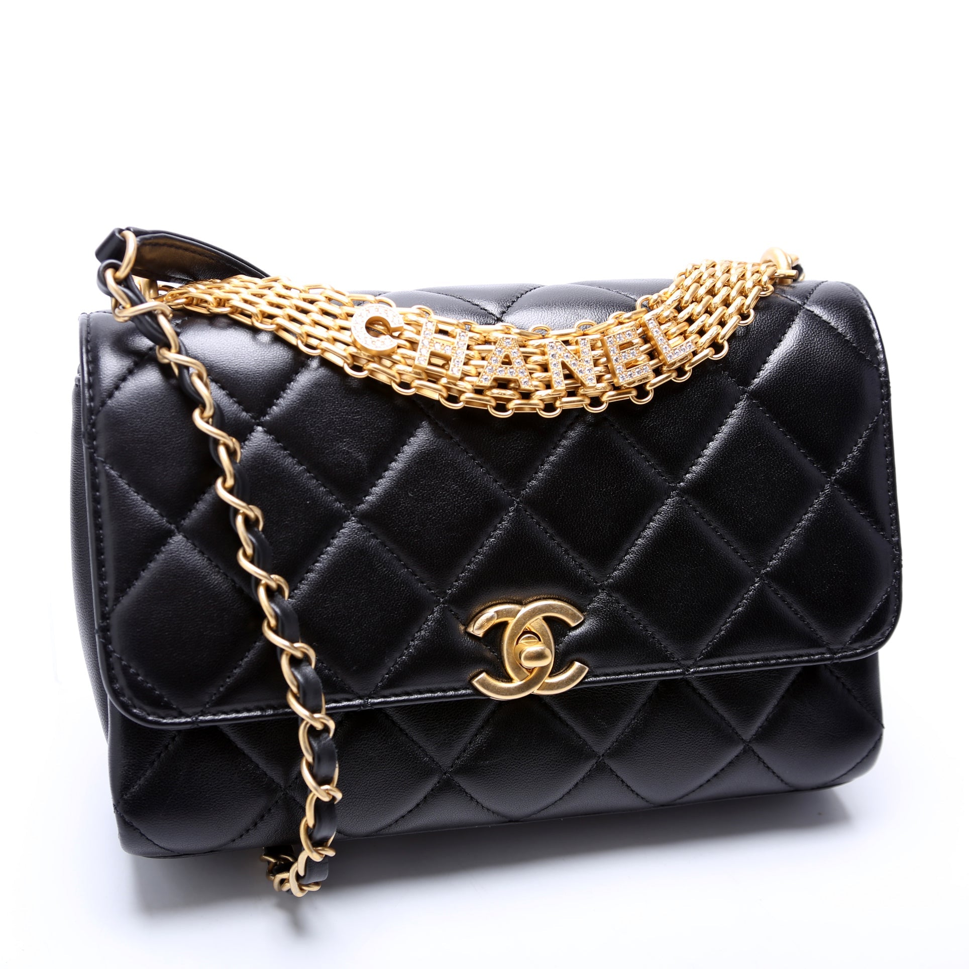 Chanel Crystal Logo Chain Top Handle Flap Bag Small. The exterior is in the classic Chanel quilted lambskin.Â