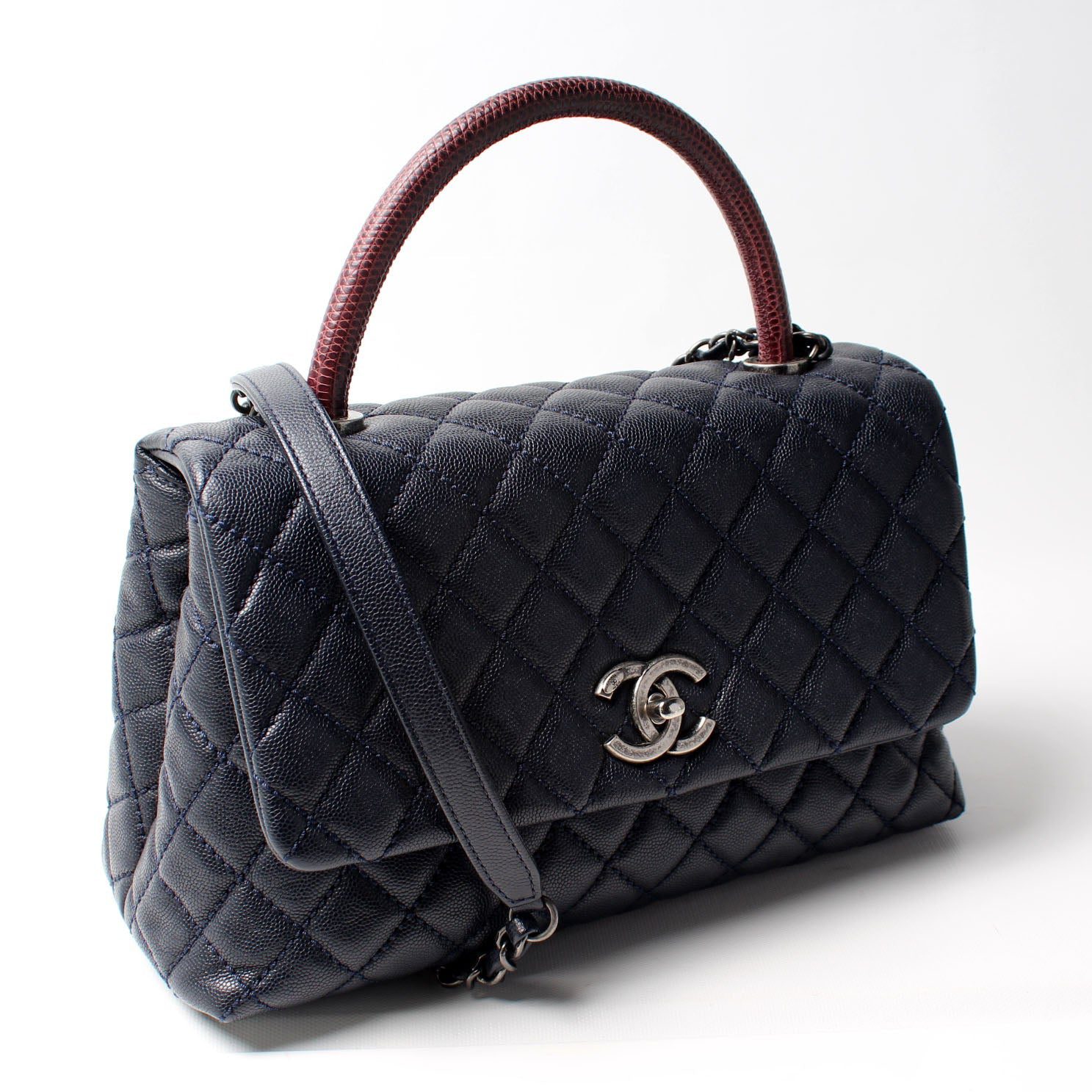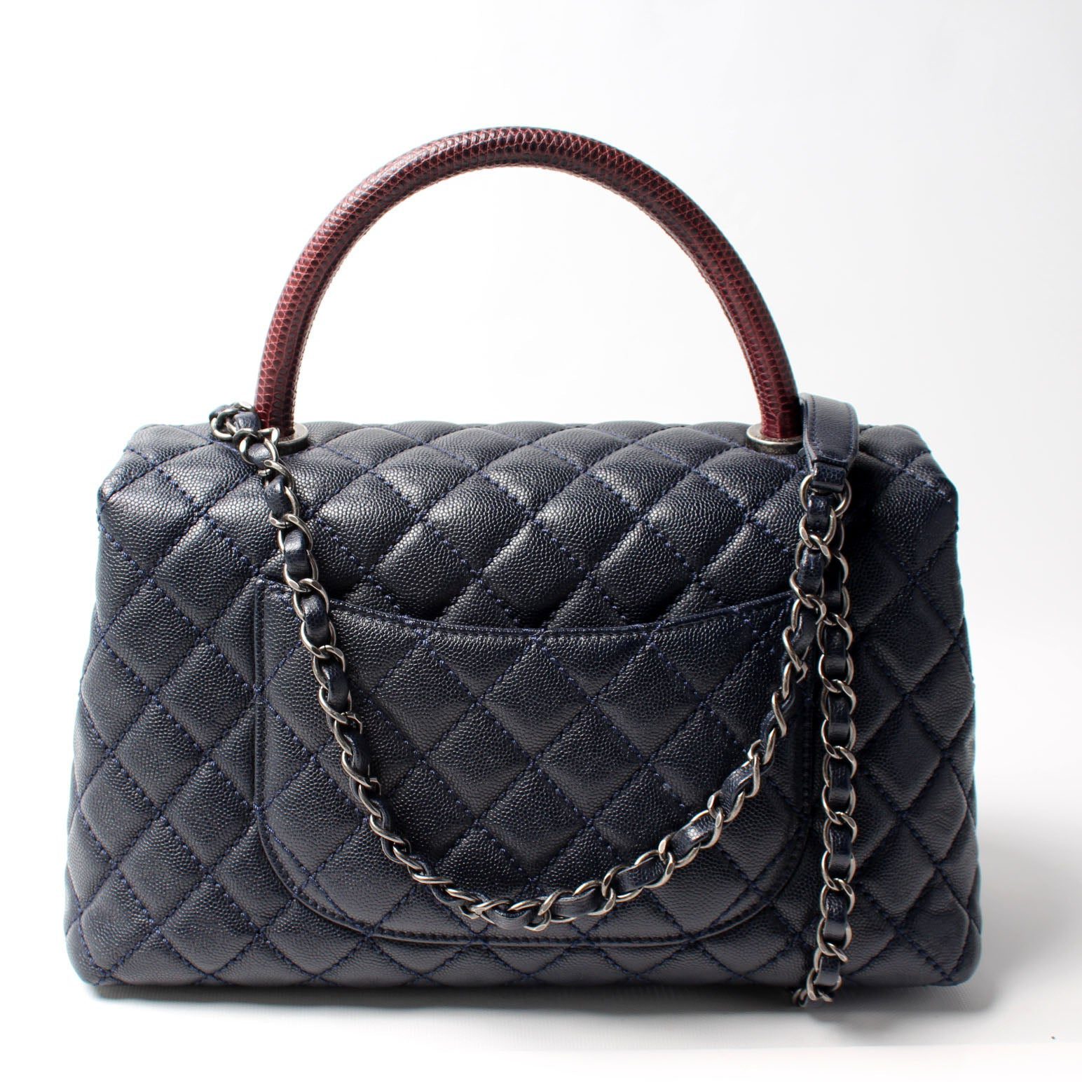 Chanel Flap Bag Lizard Embossed Top Handle. The exterior is in the Chanel Caviar leather.Â