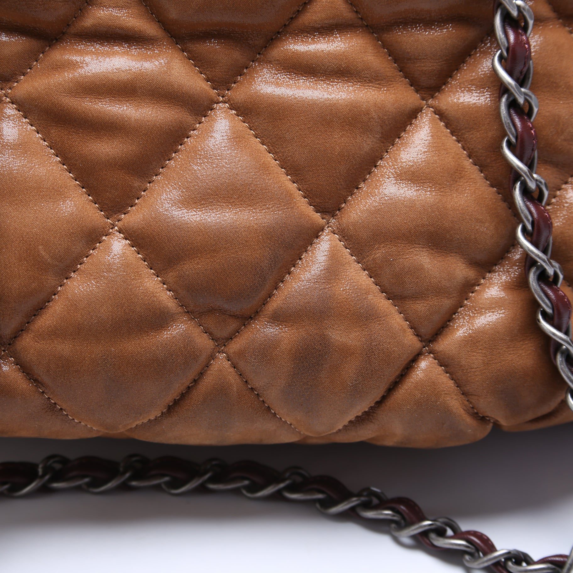 Exterior: The exterior leather shows minor wear and slight discoloration. Scuffing can be found near the top of the bag. The corners show discoloration and wear.Â