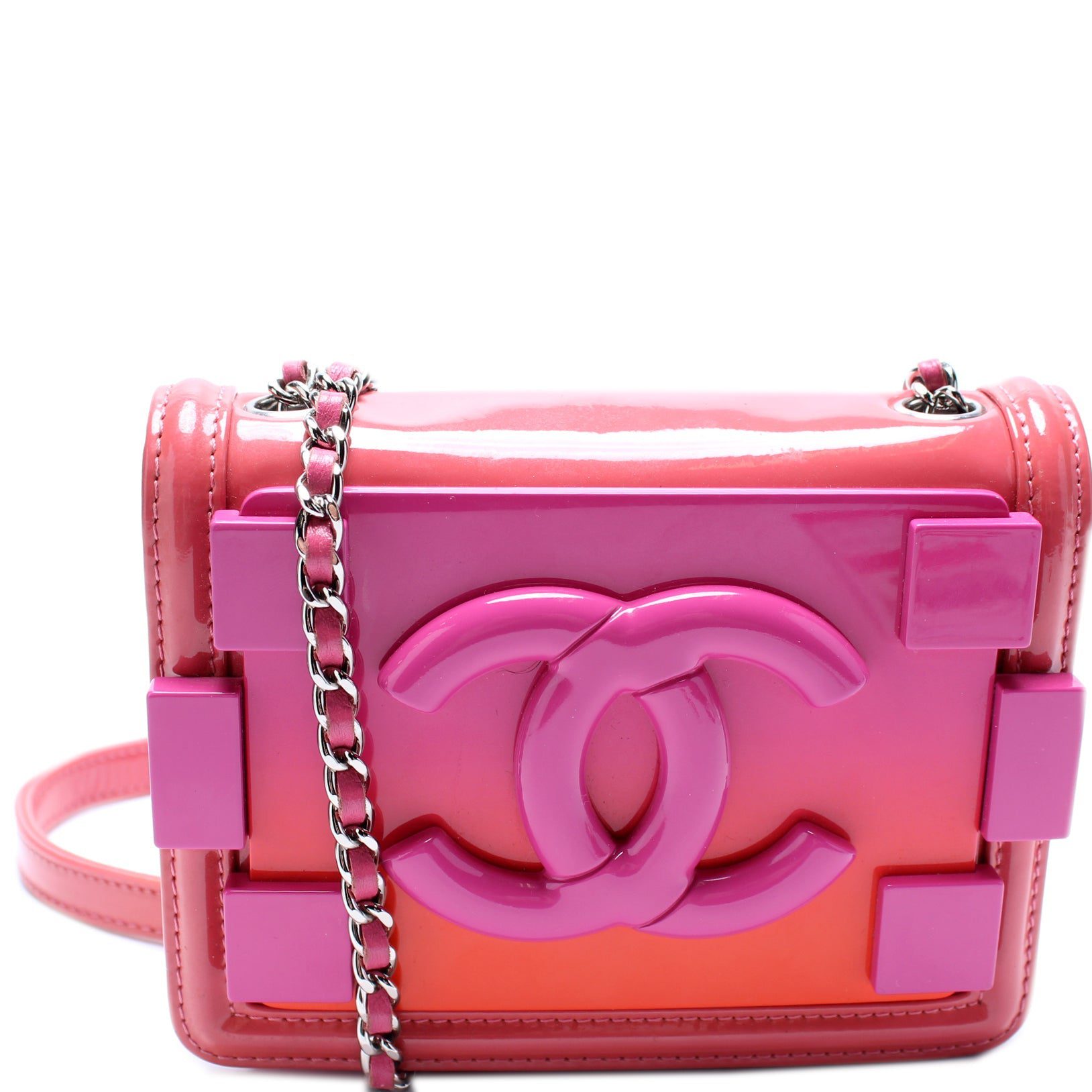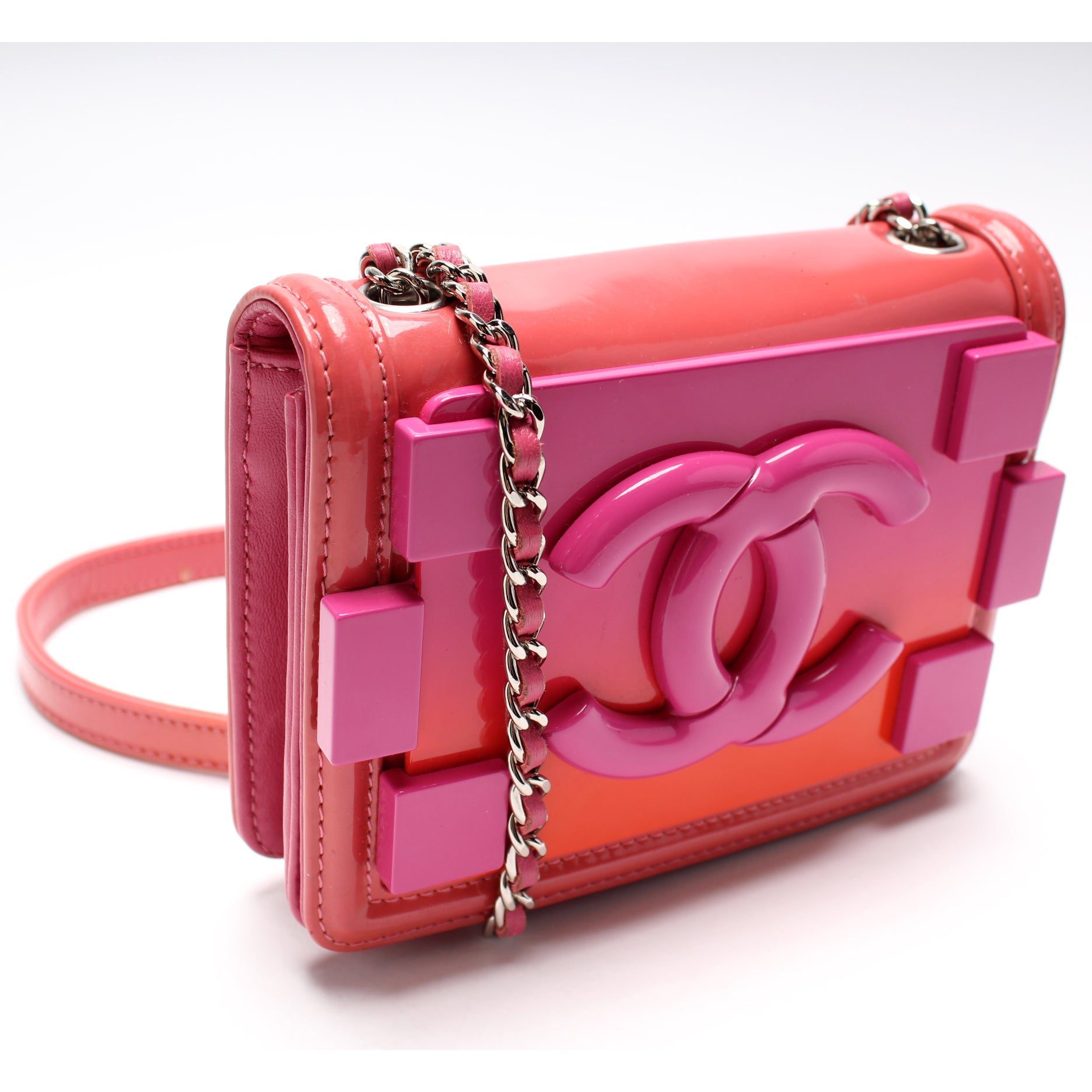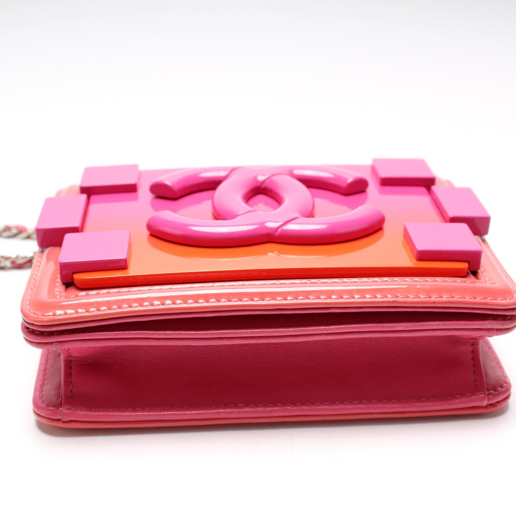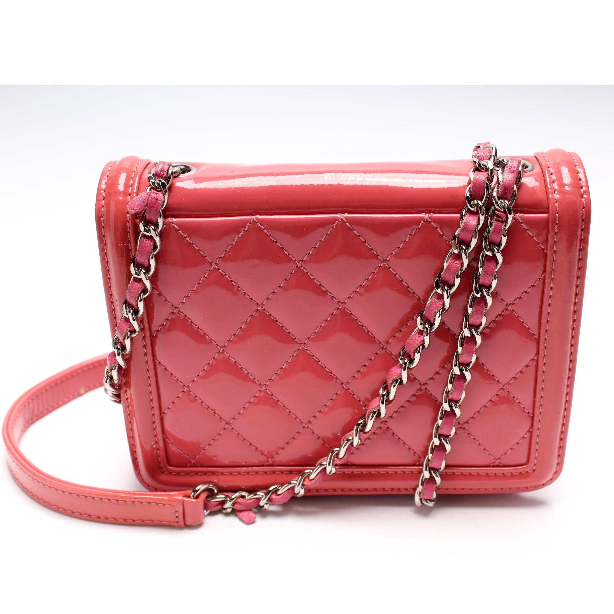 Exterior: The exterior patent leather has minor discoloration to the back of the bag. The exterior features one open pocket. The corners show minor wear.