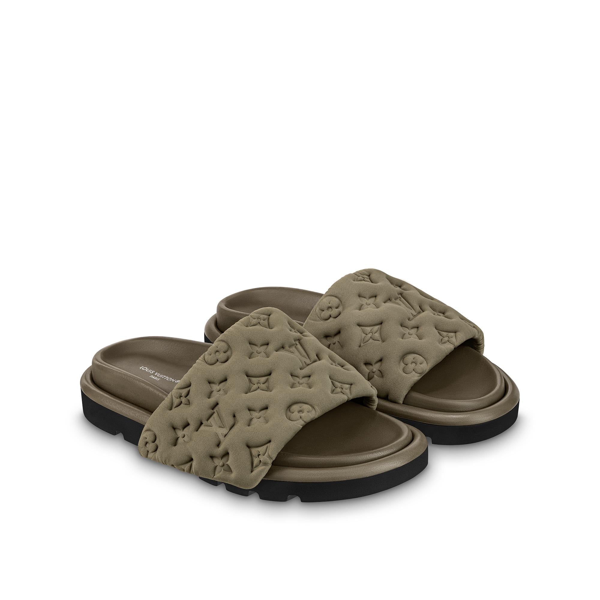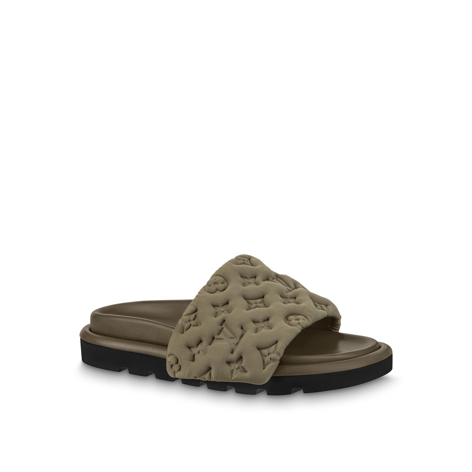 The Pool Pillow flat comfort mule is reinterpreted in technical textile with a high-frequency-embossed Monogram pattern.