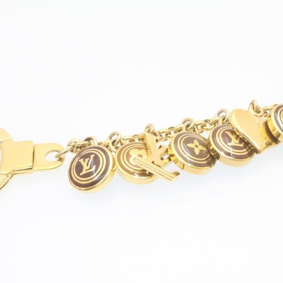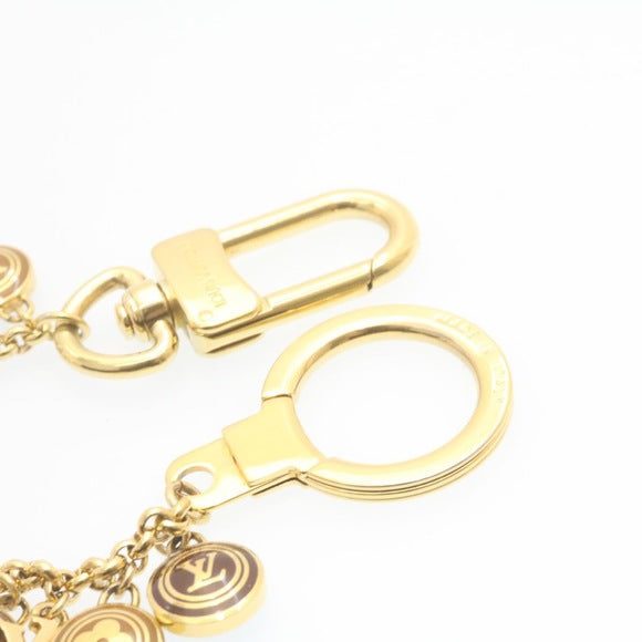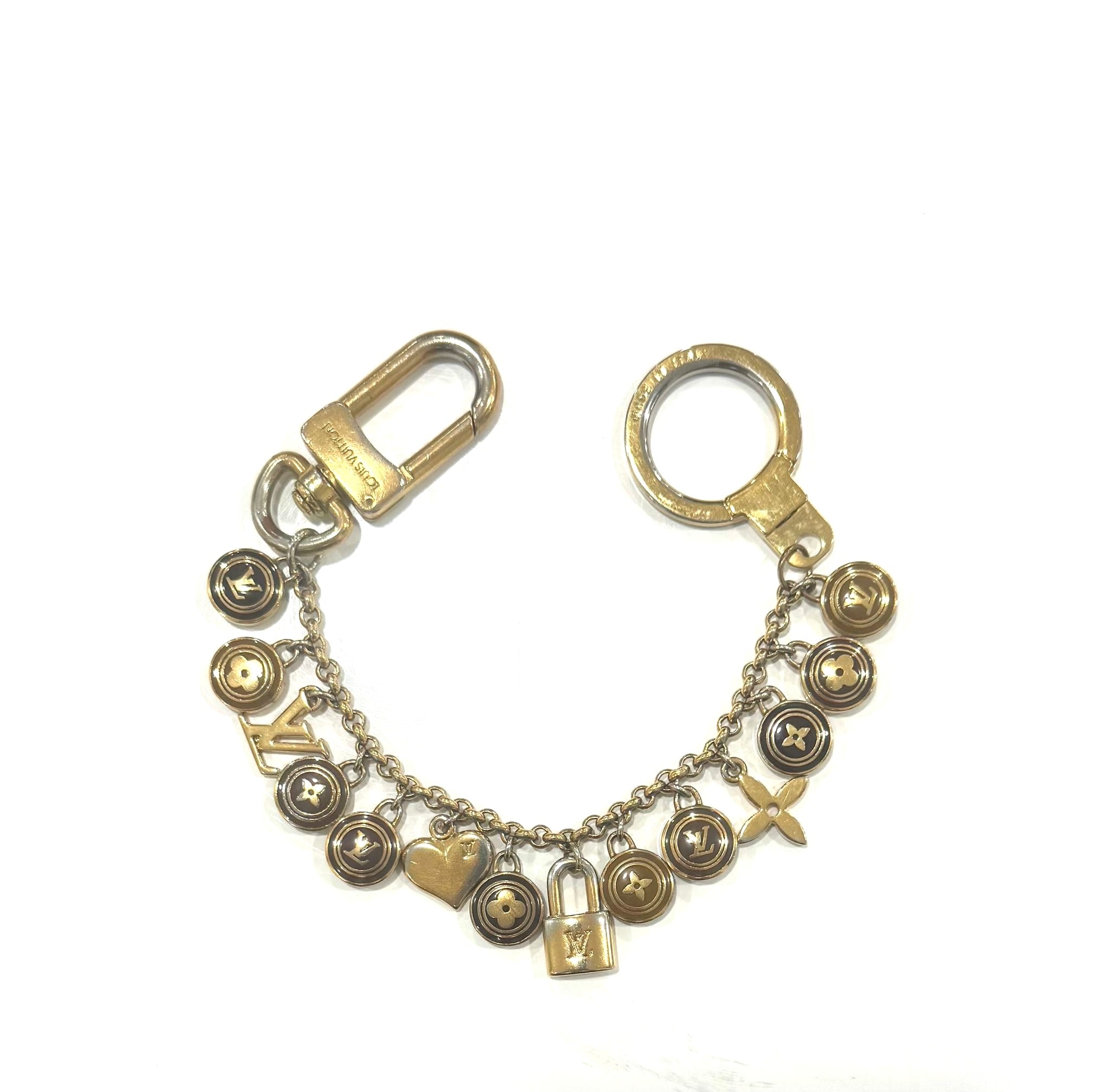 This Elegant Bag Charm is Crafted from Gold-plated brass and features round enameled Louis Vuitton Monogram symbols, accented by four iconic charms: padlock, heart, Monogram flower, and LV logo.