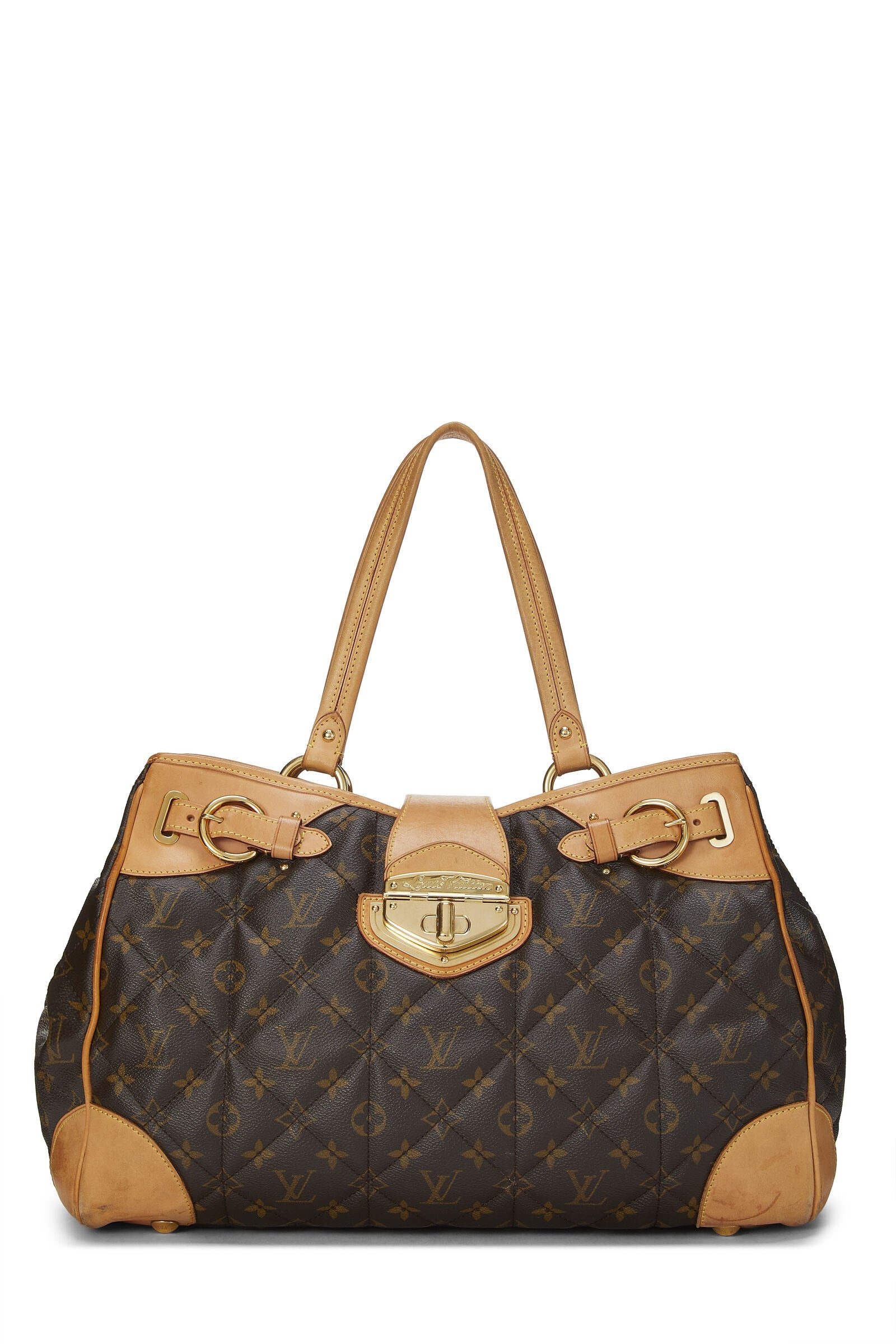 This stylish bag is crafted of unique quilted brown monogram-coated canvas with a Vachetta cowhide leather trim and top handles. It features polished brass hardware and a cross-over top strap with a brass turn-lock clasp. The interior is lined with a light beige microfiber fabric with zipper and patch pockets.