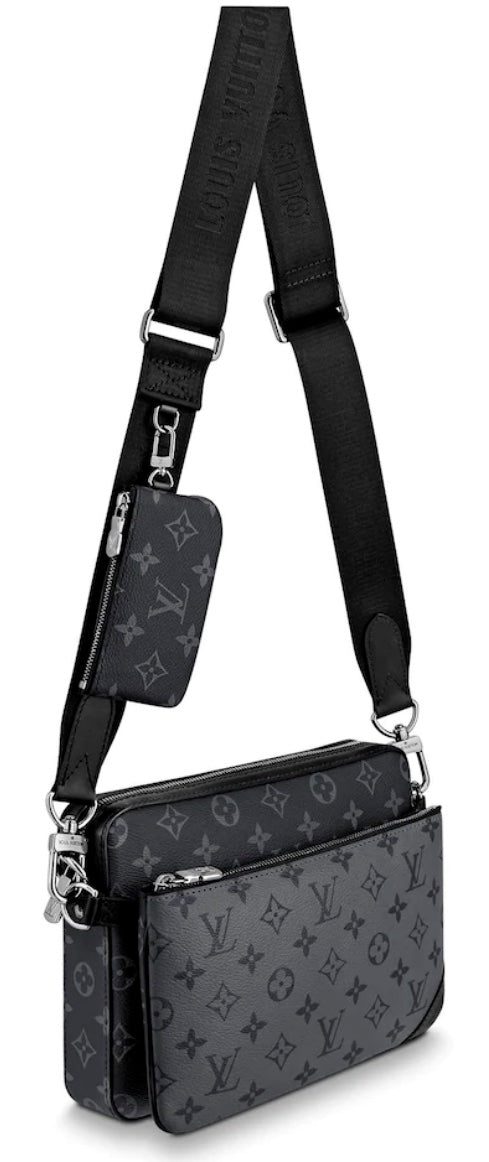 The Trio Messenger bag for is crafted from Monogram Eclipse canvas and its mirror twin, Monogram Eclipse Reverse. The iconic motif in tone-on-tone shades of gray complements the lines of this functional hybrid. More than a traditional cross-body bag, it has a removable zipped pocket and a removable coin purse attached to the strap