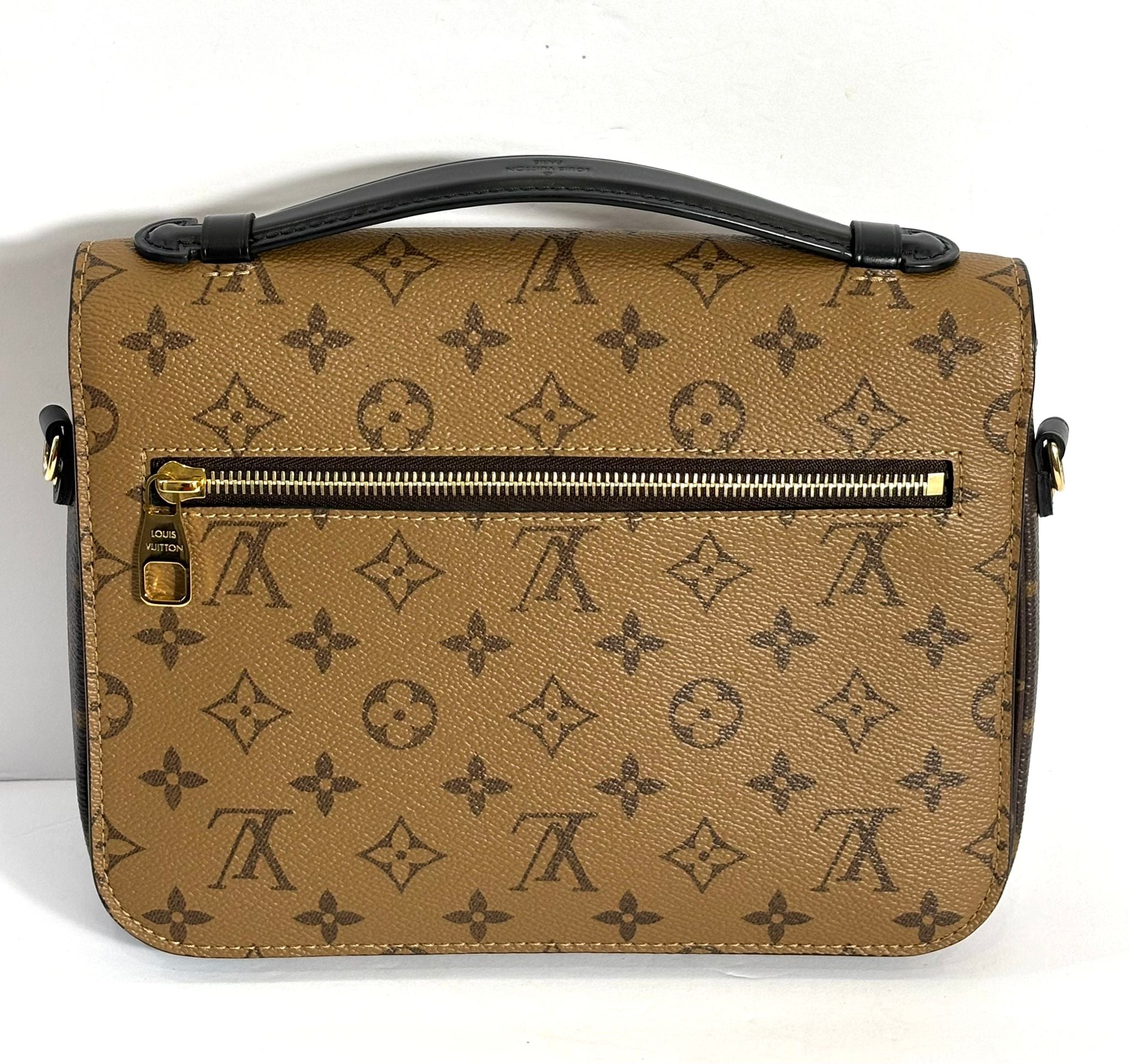 The bag features a rear zipper pocket, a sleek black leather top handle, and a removable, adjustable shoulder strap in reverse monogram canvas, offering versatile carrying optionsâfrom hand-held to crossbody wear.