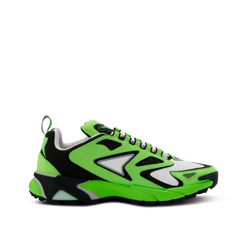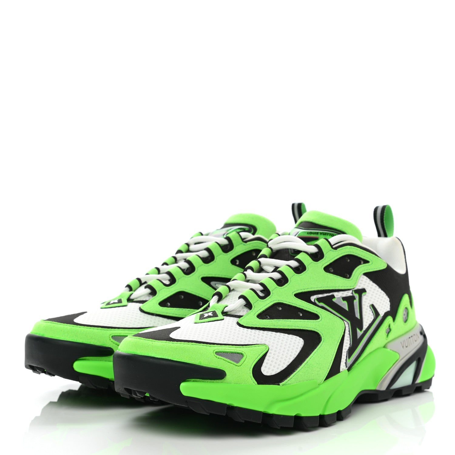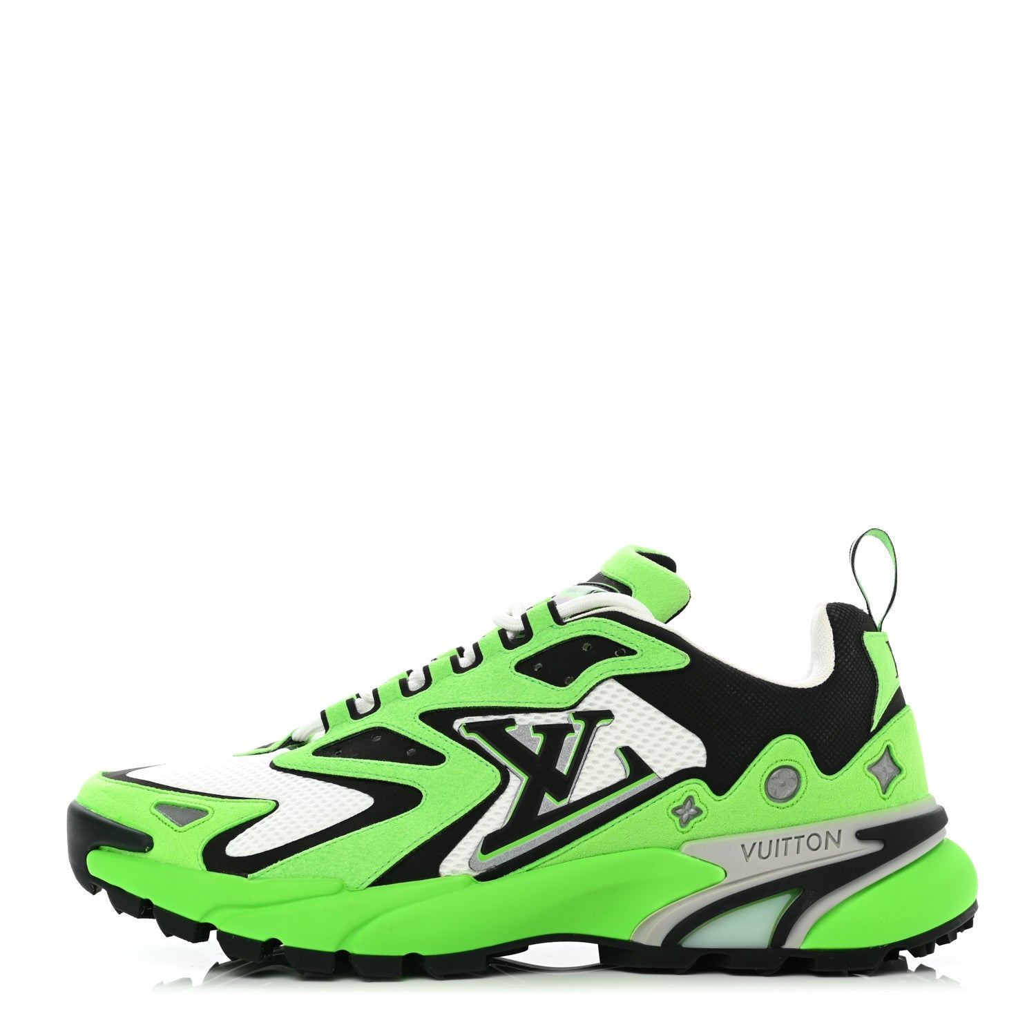 The Louis Vuitton “Runner Tactic” takes inspiration from running shoes and is crafted from a mix of materials, such as mesh textile and suede calf leather. Finished in a predominantly green upper, the design features reflective Monogram Flowers and LV initials on the sides, with additional LV branding at the tongue. The pair is finished with a padded collar and a lightweight rubber outsole, stamped with a Vuitton signature.Â