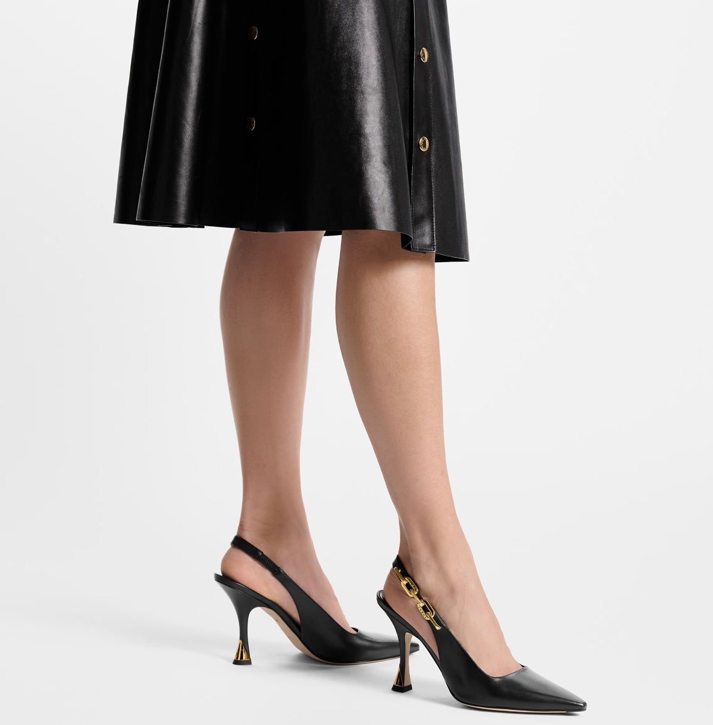 Sophisticated and striking, the Louis Vuitton Sparkle Slingback Pumps are crafted from smooth black calf leather, offering an elegant silhouette with a modern edge. This refined design showcases a pointed toe and a distinctive flared heel that adds both height and statement style.