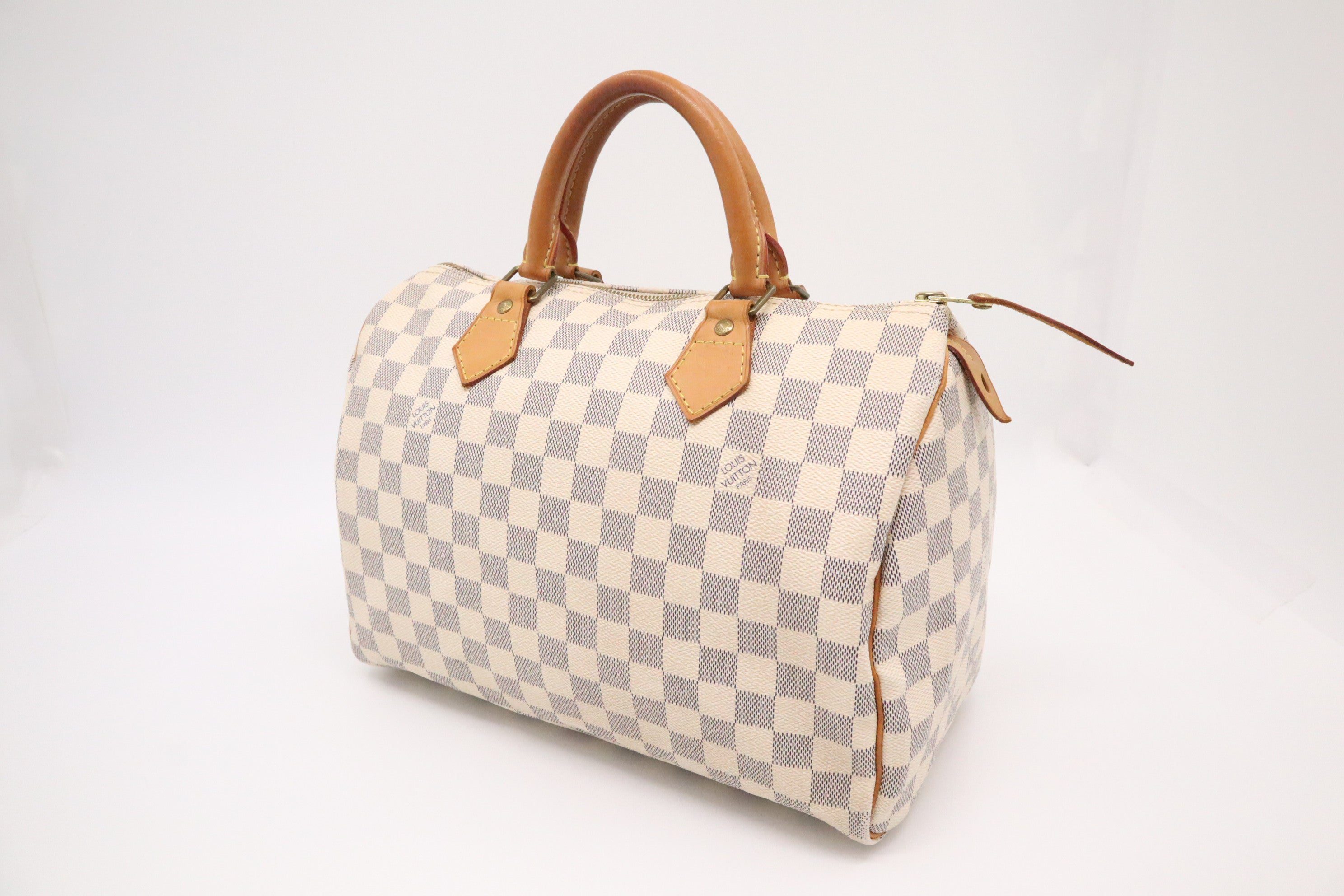 The Louis Vuitton Damier Azur Speedy 30 is a stylish and iconic handbag. It features the signature checkered pattern, damier azur and a natural cowhide leather trim, which has developed a patina over time, adding character and uniqueness to the bag. The Louis Vuitton Damier Azur Speedy 30 is a stylish and iconic handbag. It features the signature checkered pattern, damier axur and a natural cowhide leather trim, which developed a patina over time, adding character and uniqueness to the bag. The Speedy 30 offers a roomy interior, making it practical for carrying daily essentials and more. The Damier Azur pattern is both classic and contemporary, offering a fresh and light look that is perfect for spring and summer.