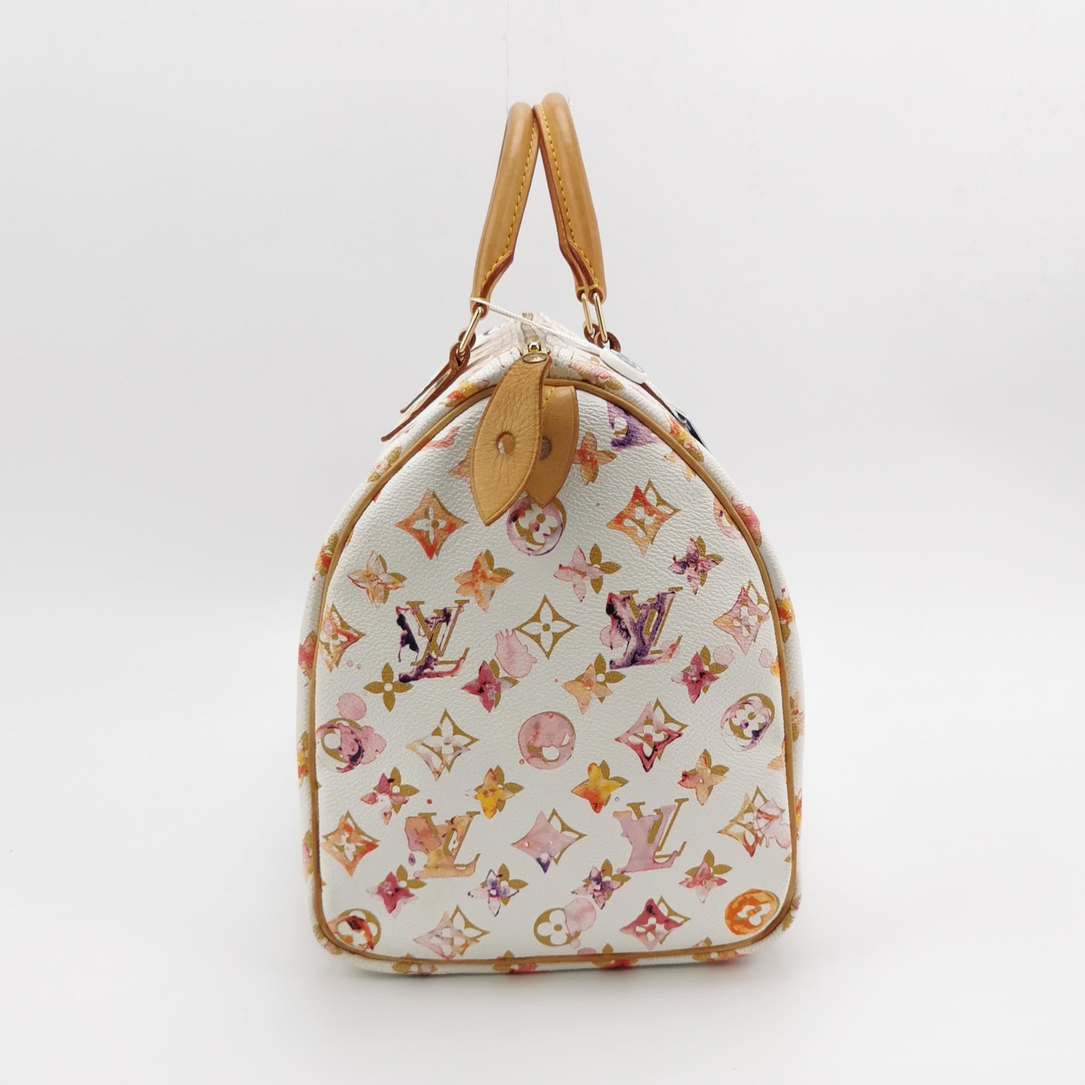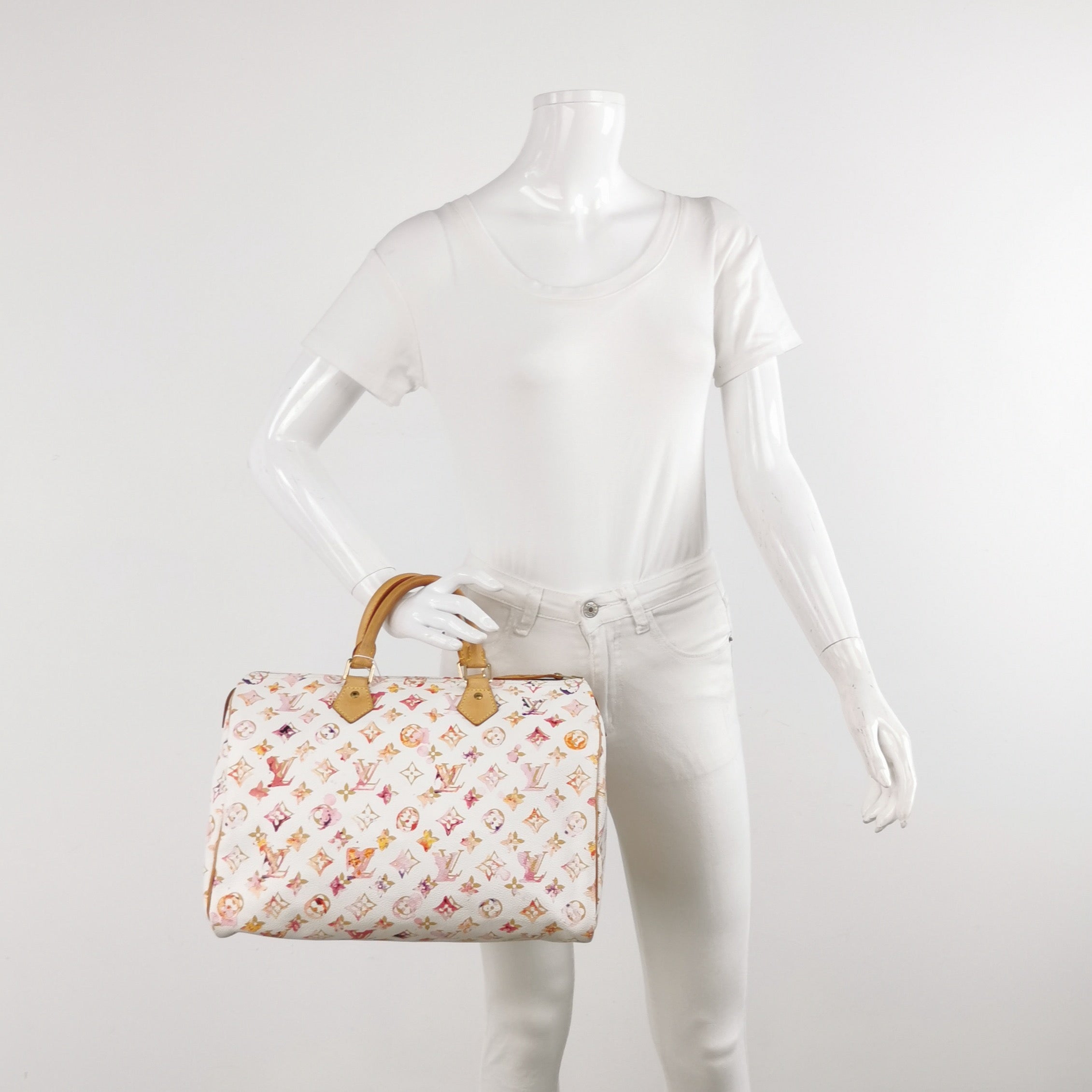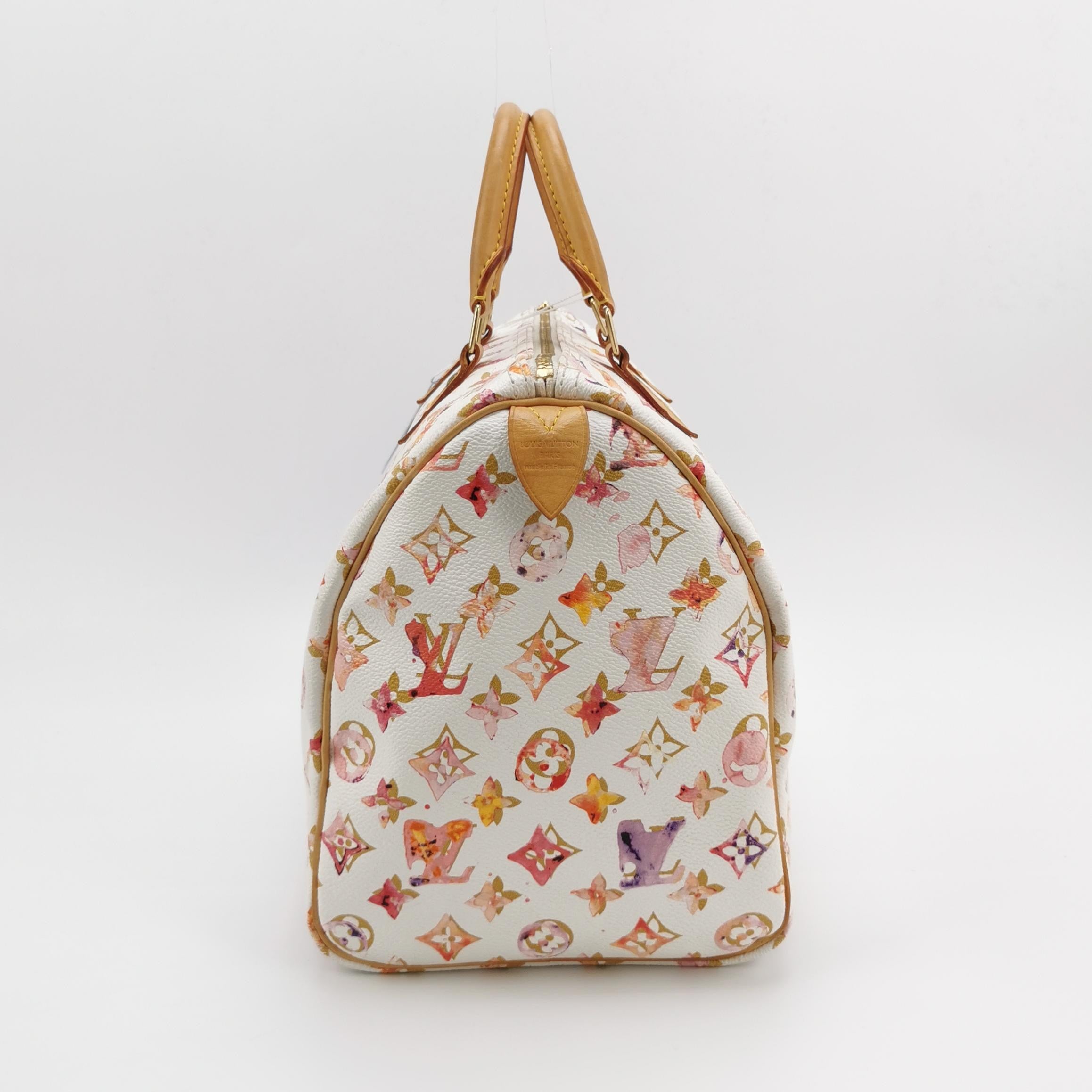 Seize the opportunity to own this exceptional limited edition from Louis Vuittonâs Spring/Summer 2008 runway collection. The Speedy 30 Monogram Watercolor Pink handbag offers generous space and urban sophistication. Crafted from the iconic monogram canvas, it features vibrant watercolor LV motifs created by contemporary artist Richard Prince. This rare piece, showcasing a palette of 17 striking colors on white canvas, is highly sought after by collectors and no longer available elsewhere. It represents a unique fusion of Louis Vuitton heritage and Princeâs artistic vision.