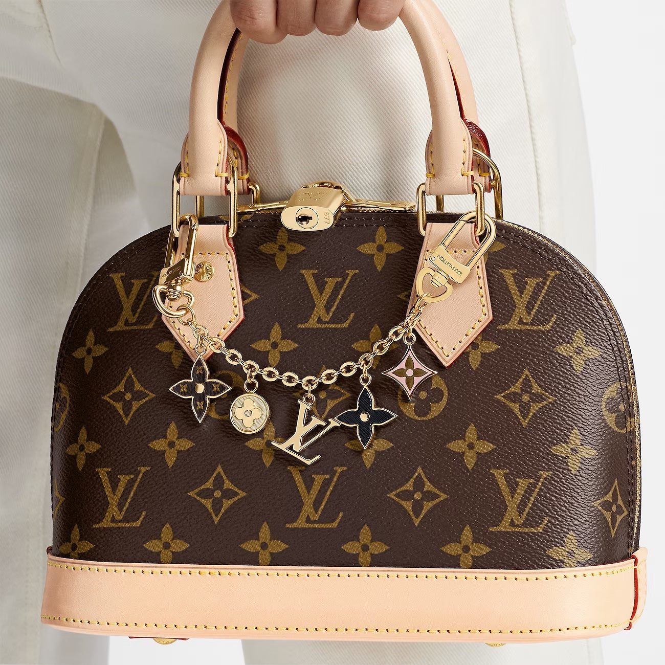 A mixture of finishes and shapes lend the Spring Street chain bag charm an eye-catching look. This versatile piece showcases iconic VUITTON’S House motifs in miniature form, including Monogram Flowers and the LV Initials. Pops of pale pink lend it a feminine note while Monogram canvas accents ensure signature appeal. The design is finished with Louis Vuitton signature engravings.