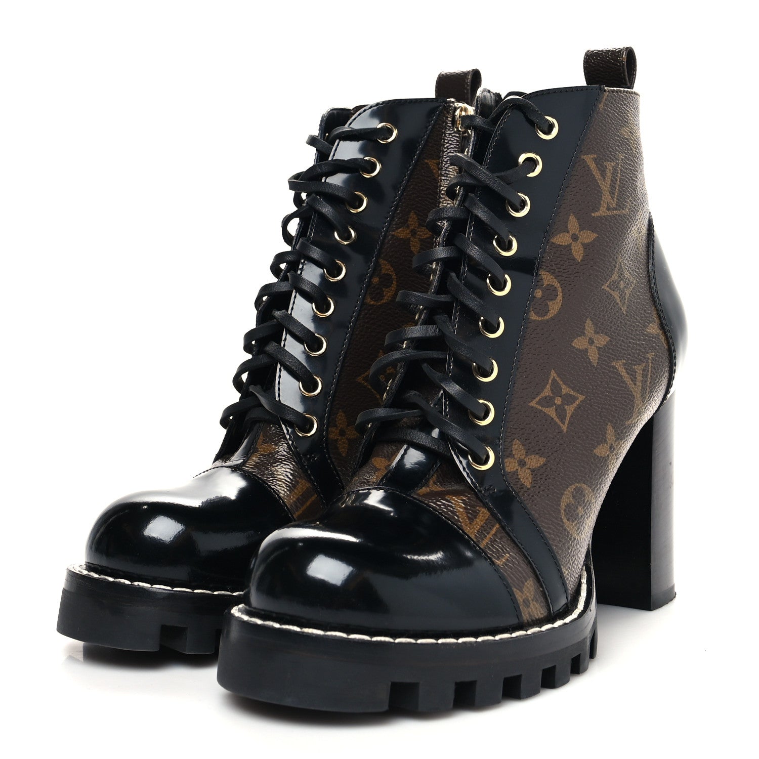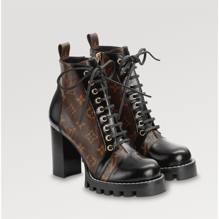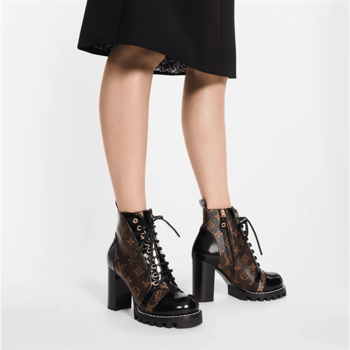 The Star Trail ankle boot, one of Louis Vuitton’s most instantly recognizable designs, is interpreted in patent Monogram canvas for a truly iconic look. Black calf leather trim brings a chic twist to this army-inspired style with its leather laces and rugged platform sole.
