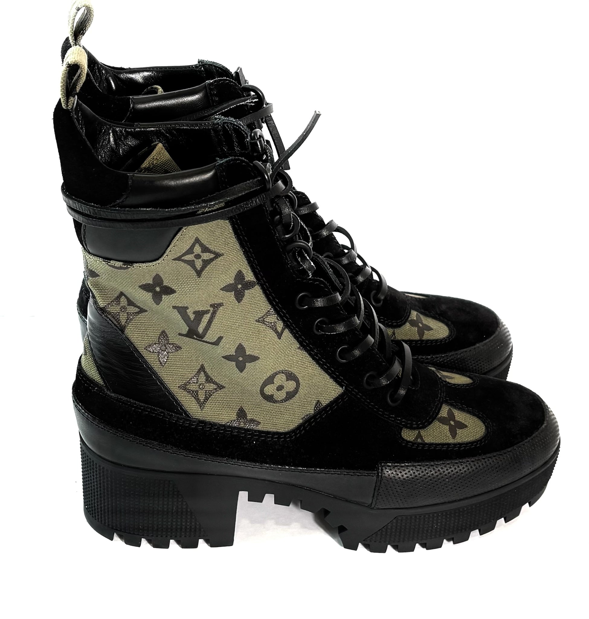 With its wrap-around leather laces, platform construction and treaded rubber outsole, the Laureate desert boot is one of Louis Vuitton’s most recognizable styles. Crafted from soft suede calf leather with trim in iconic Monogram canvas, this version combines a go-anywhere spirit with true fashion appeal.