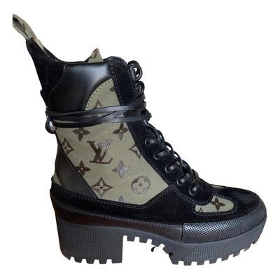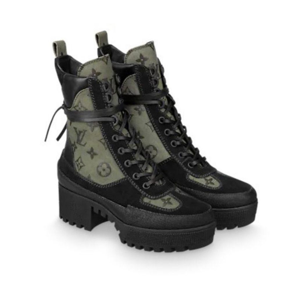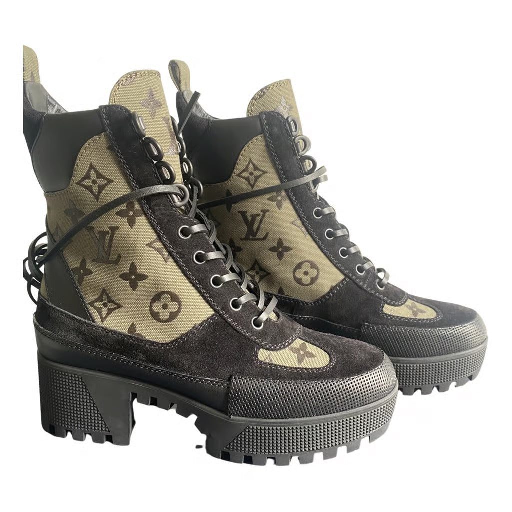 With its wrap-around leather laces, platform construction and treaded rubber outsole, the Laureate desert boot is one of Louis Vuitton’s most recognizable styles. Crafted from soft suede calf leather with trim in iconic Monogram canvas, this version combines a go-anywhere spirit with true fashion appeal.