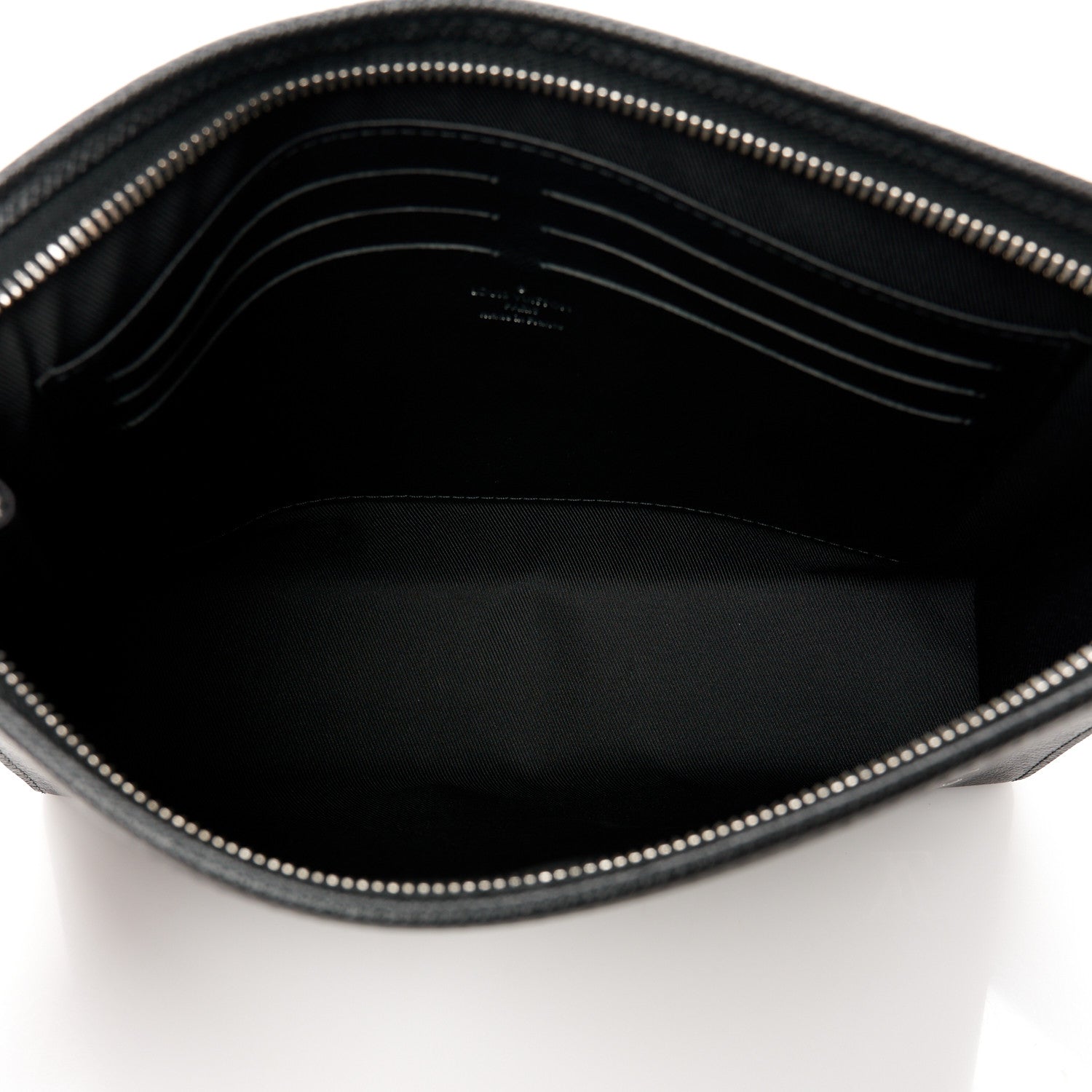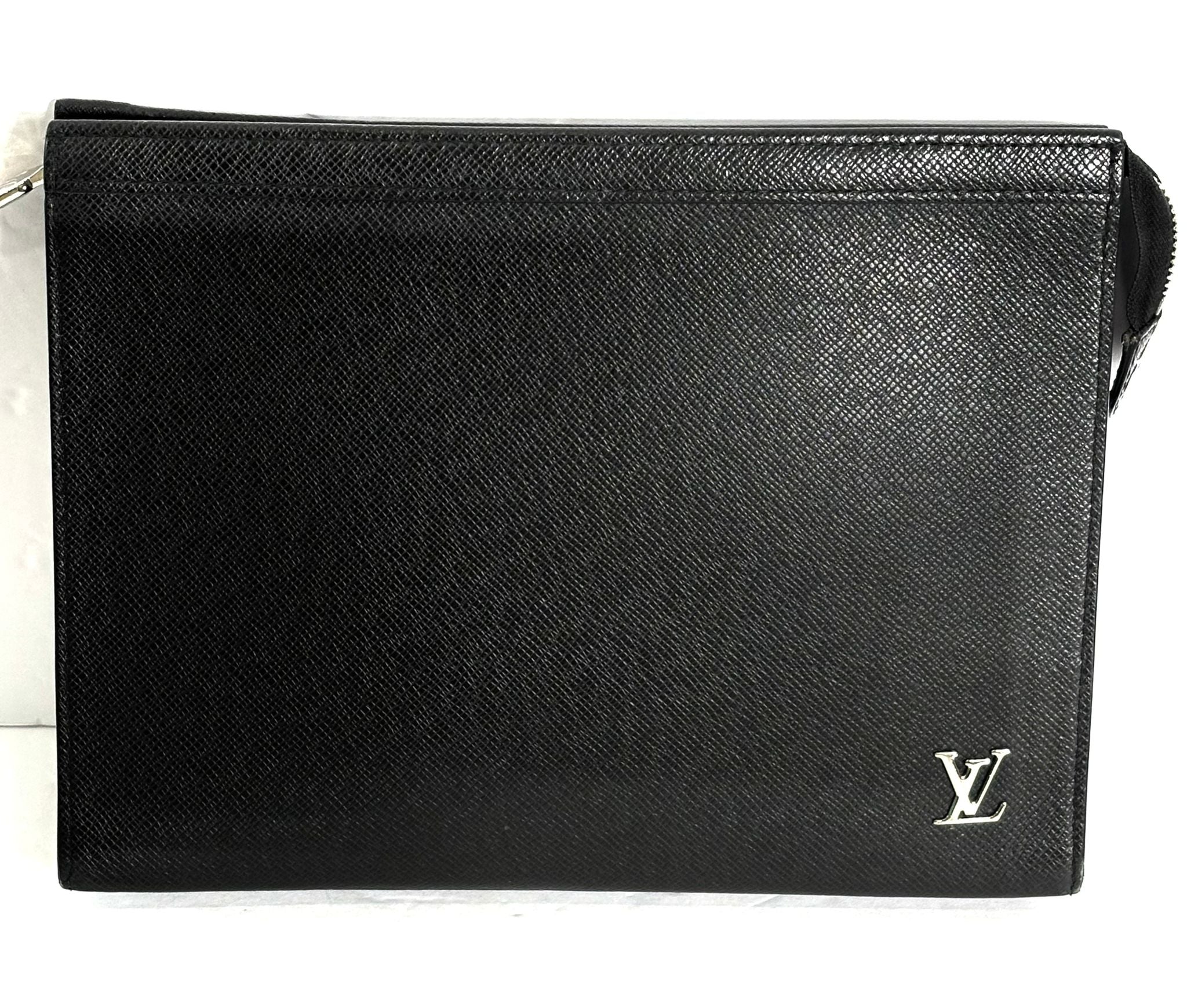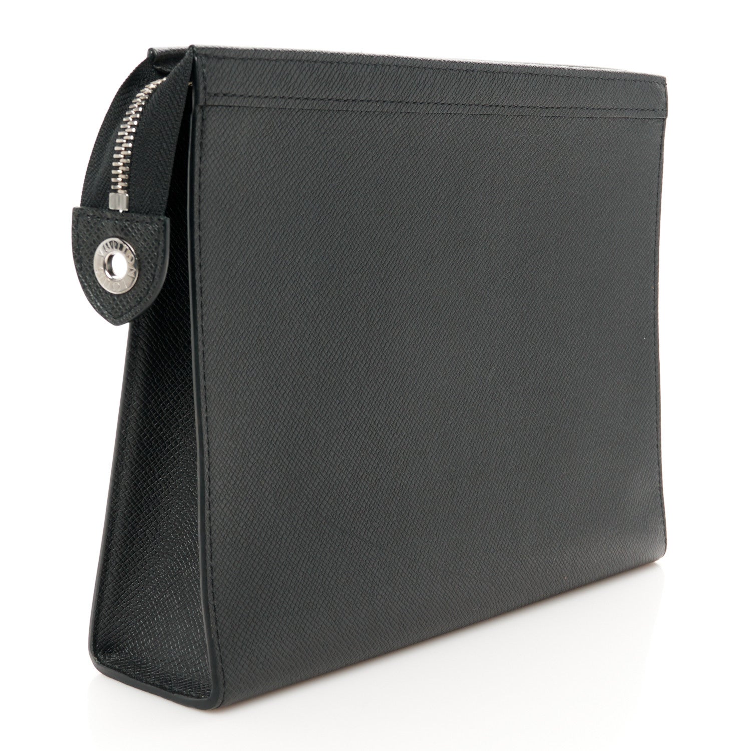 The LOUIS VUITTON Taiga Pochette Voyage MM in Black is a sleek and modern clutch crafted from signature Taiga textured leather, offering both durability and understated elegance. It features a polished silver-tone top zipper that opens to a black fabric-lined interior, complete with a large leather patch pocket and built-in card slots for effortless organization. Sophisticated and functional, this piece is perfect for carrying essentials in styleâwhether used on its own or as an organizer inside a larger bag.