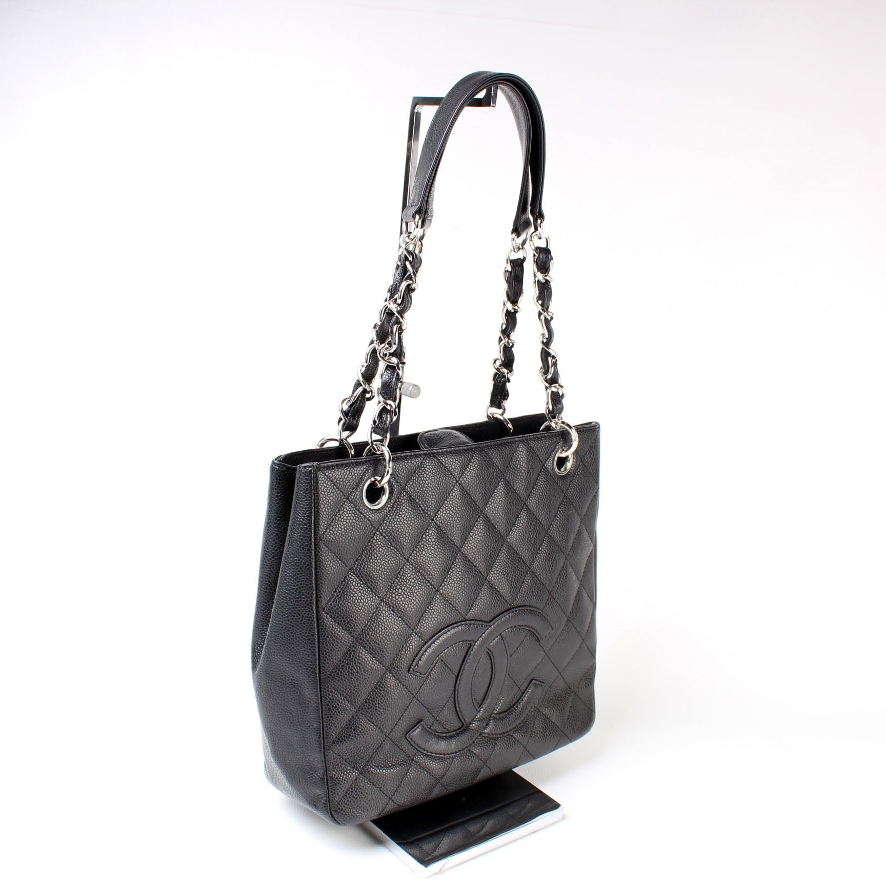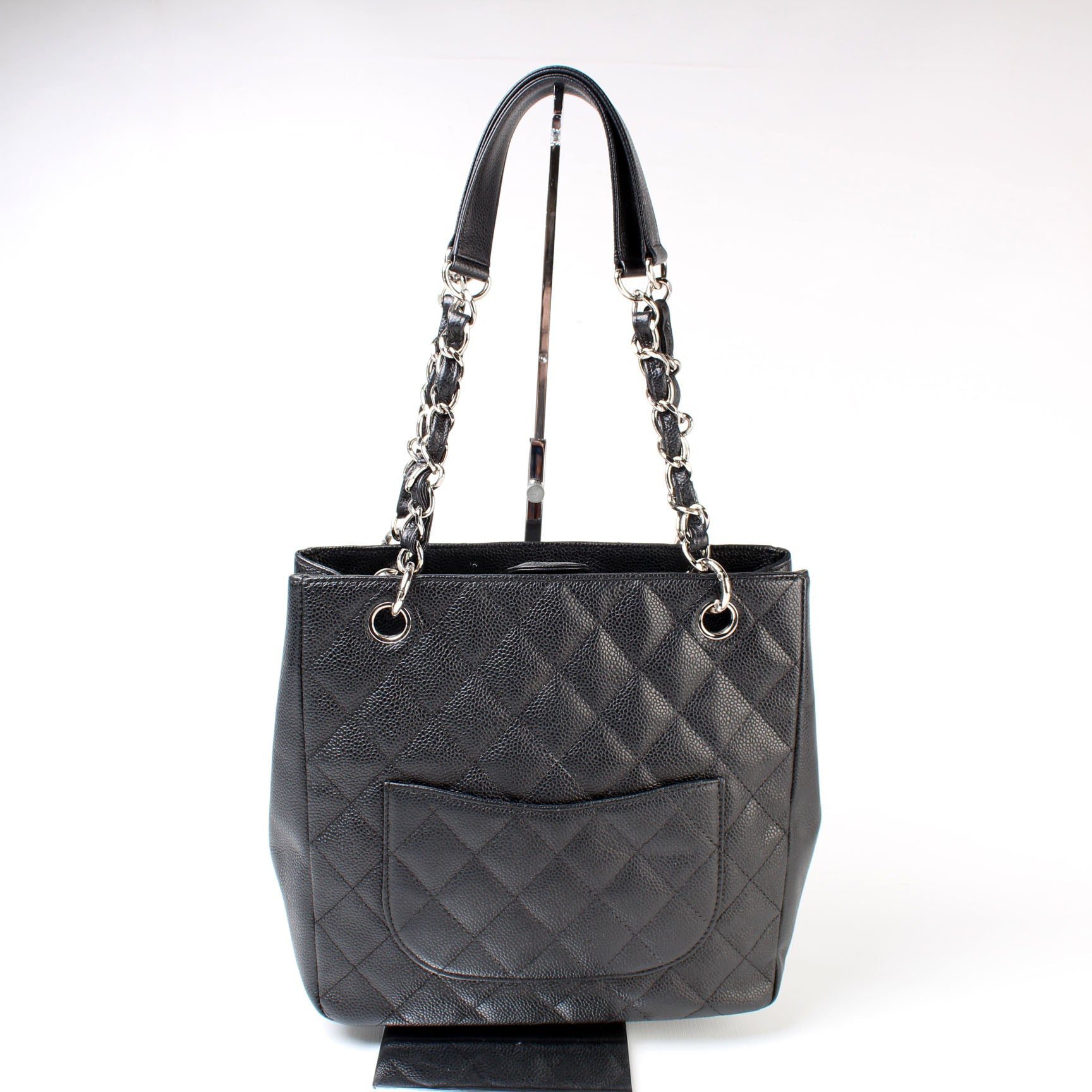 This Chanel Petite Shopping Tote. The exterior is in the classic Lambskin Leather. Â Â