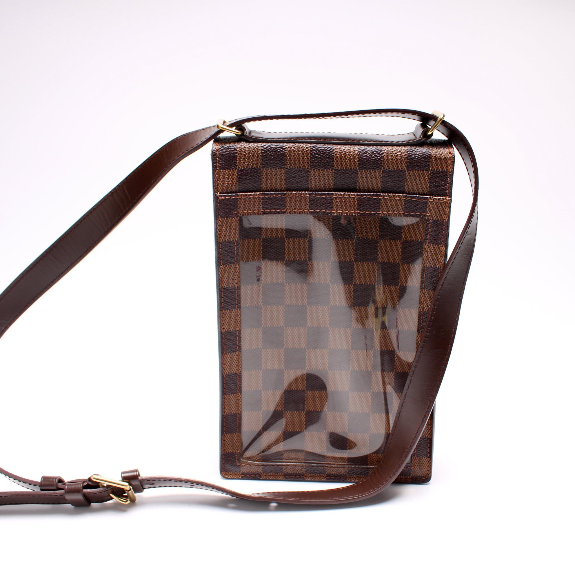 Exterior: The exterior coated canvas shows no signs of wear. The leather shows light scratches. The exterior features one transparent pocket.