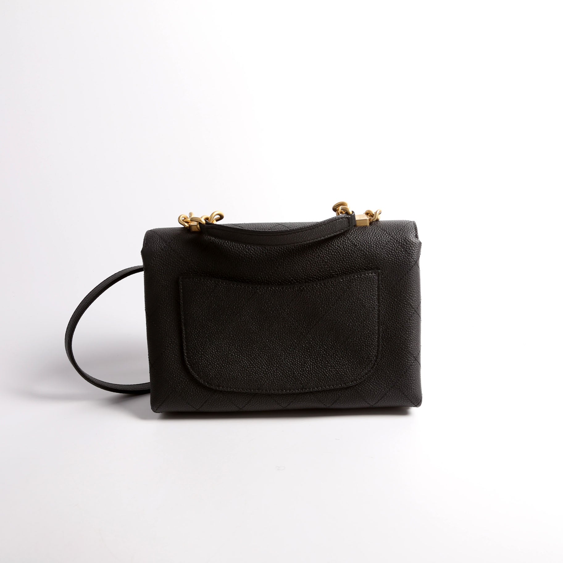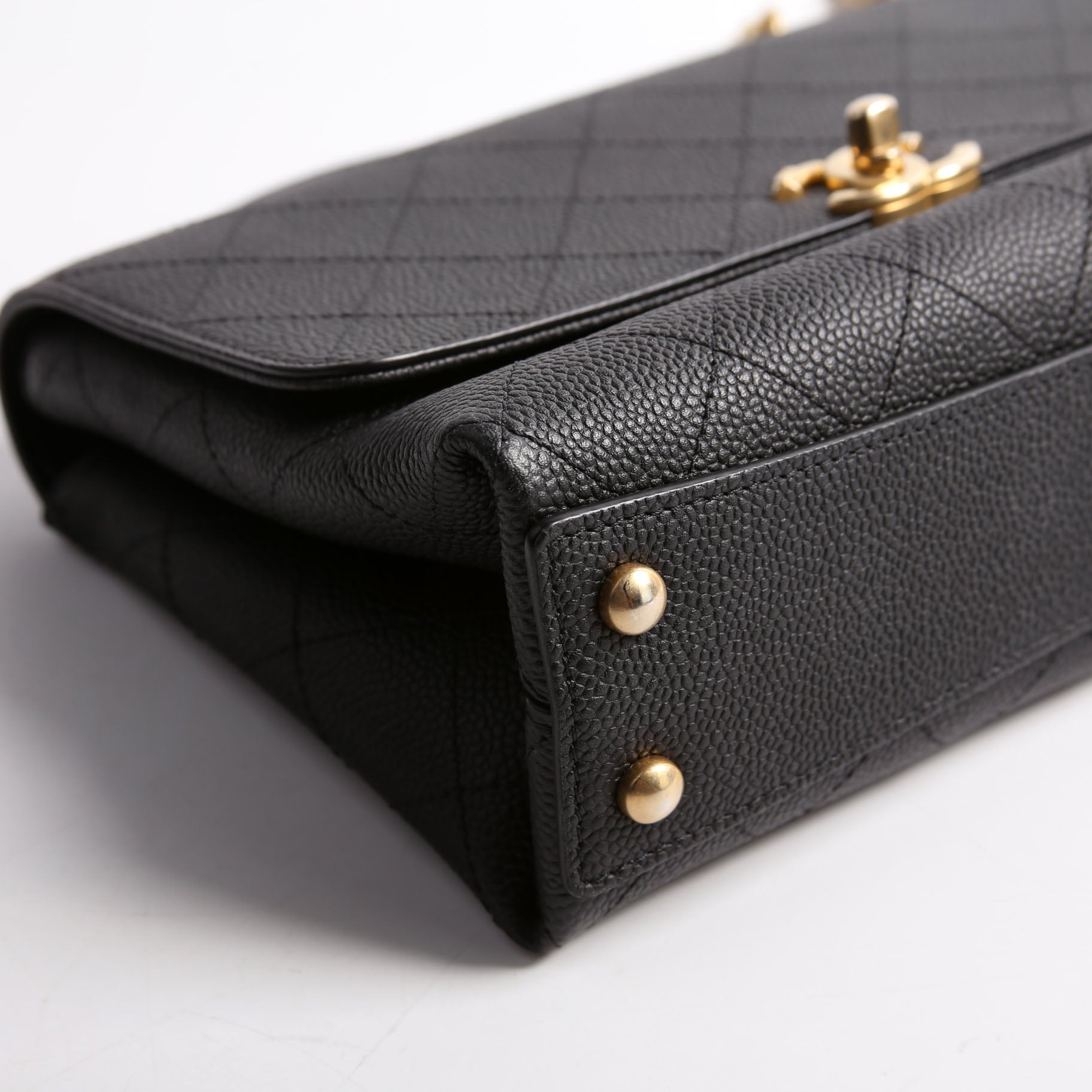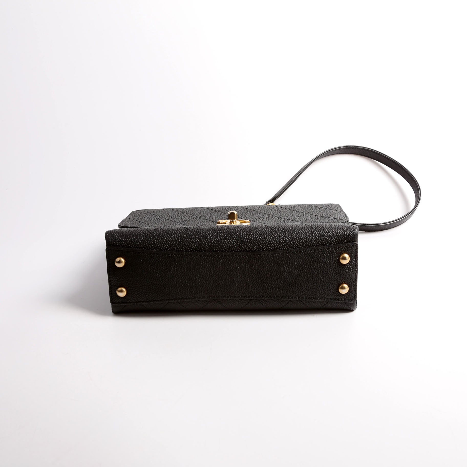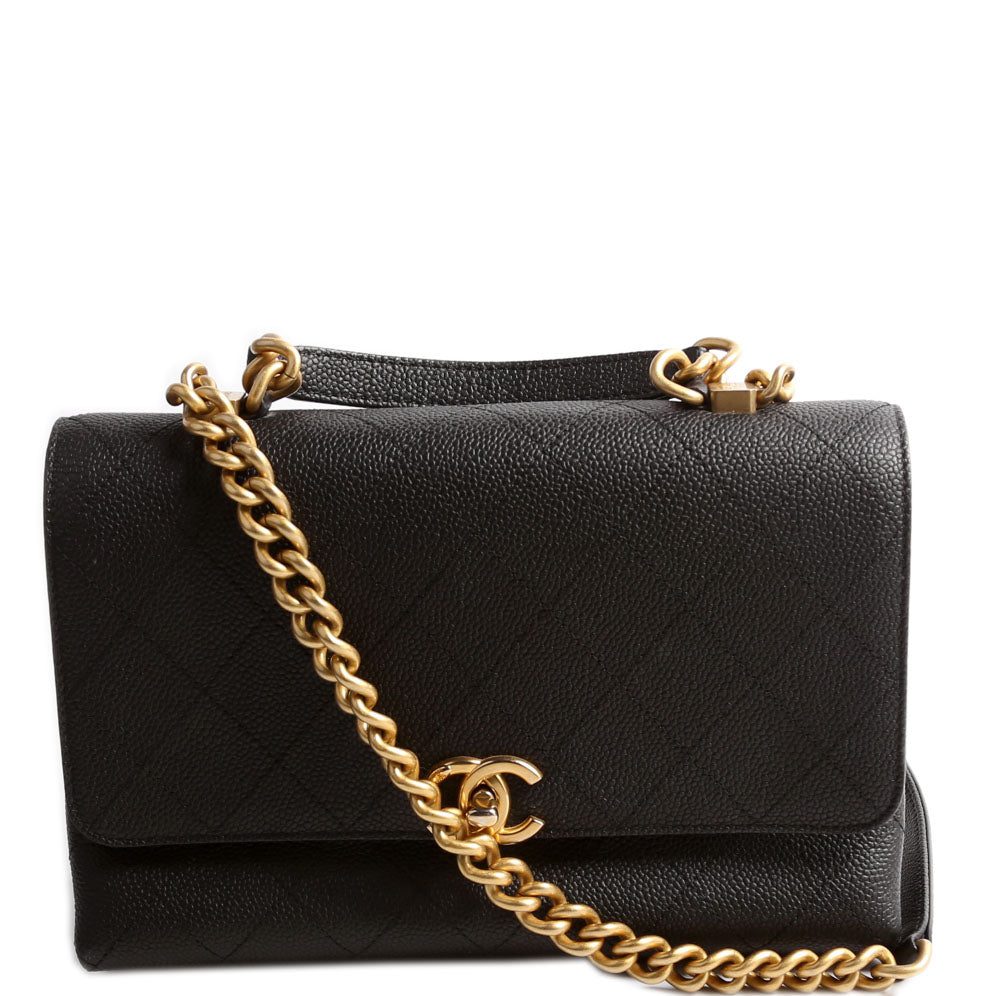 Chanel Quilted Caviar Diamond Top Handle Flap Bag. The exterior is in the classic Chanel Caviar leather.Â