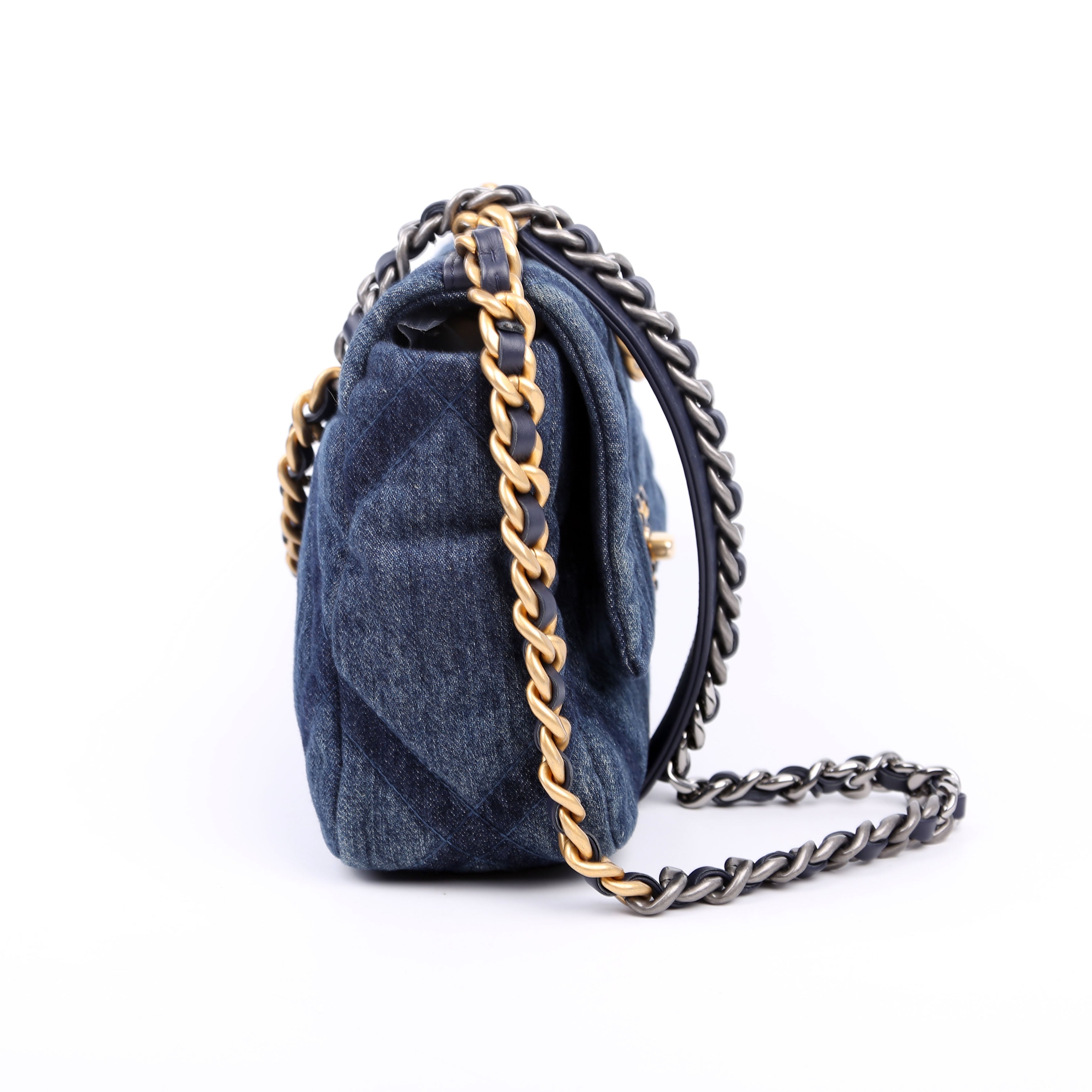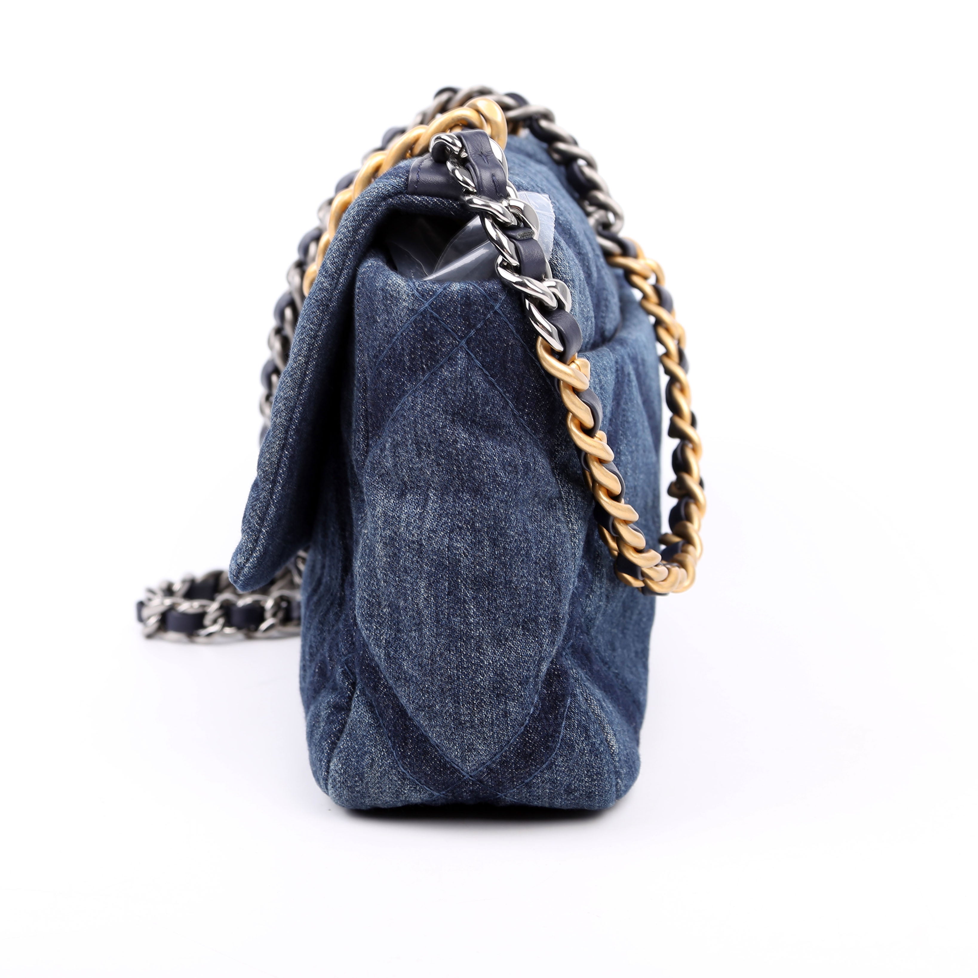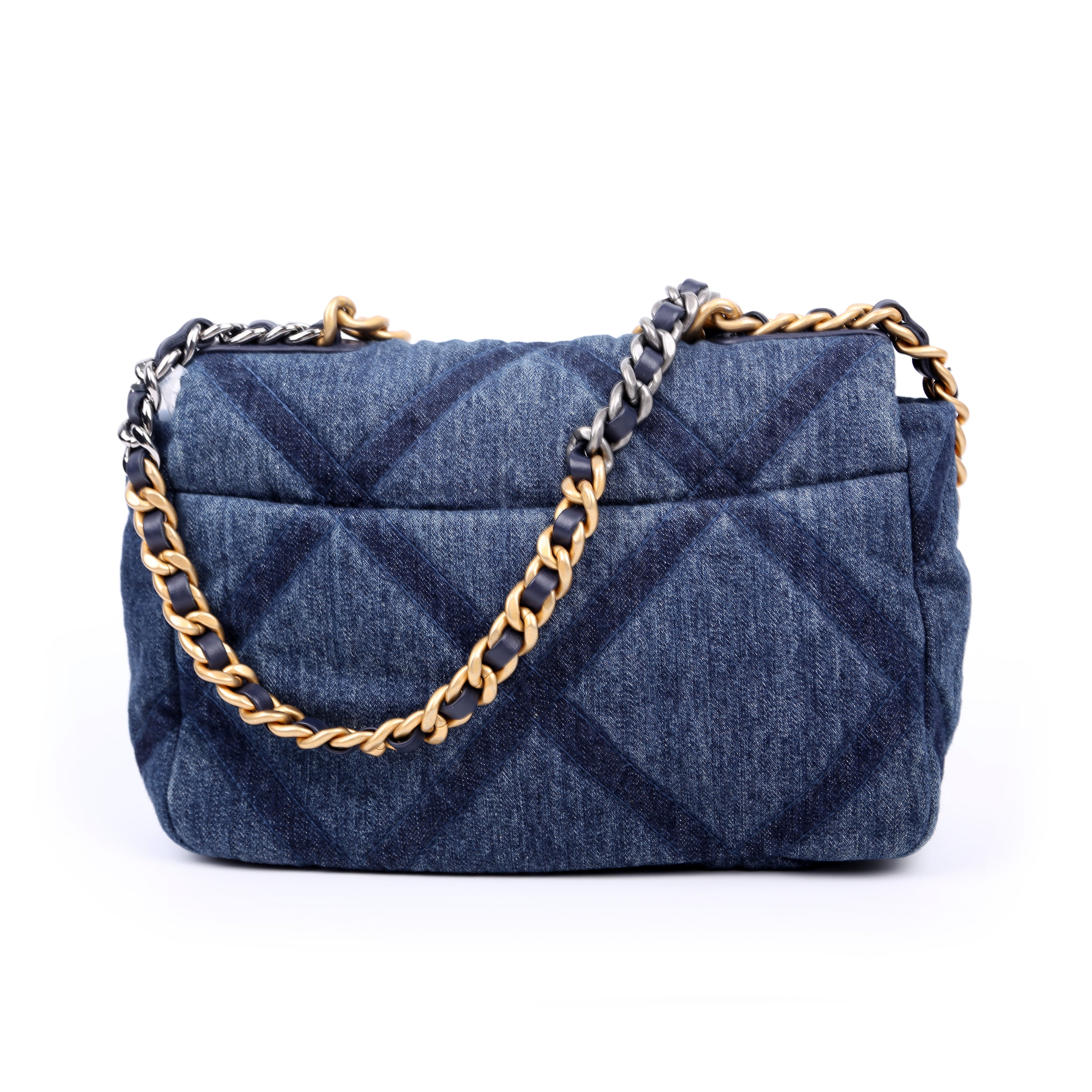 Chanel Quilted Denim 19 Small�. The exterior is in the classic Chanel Quilted Denim.