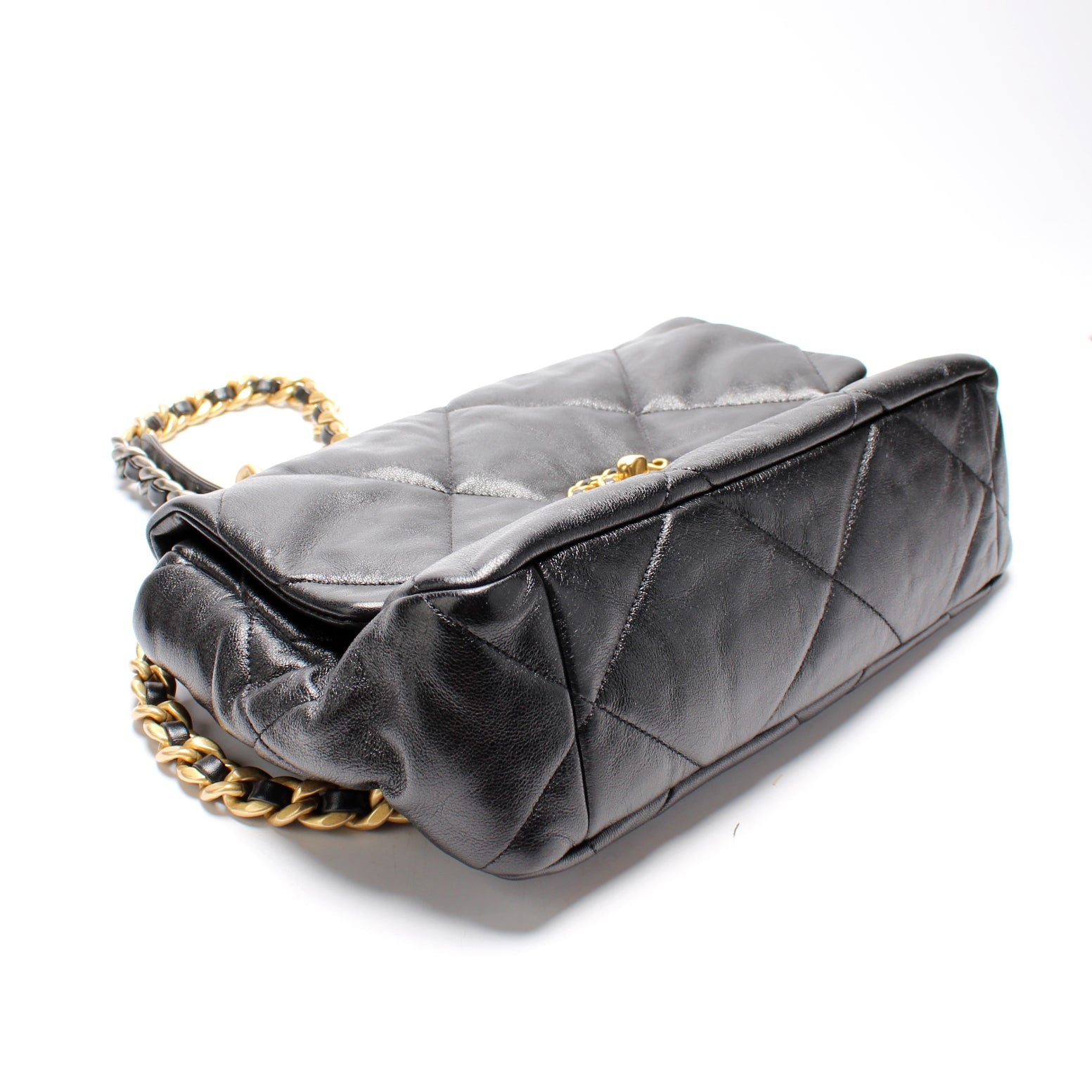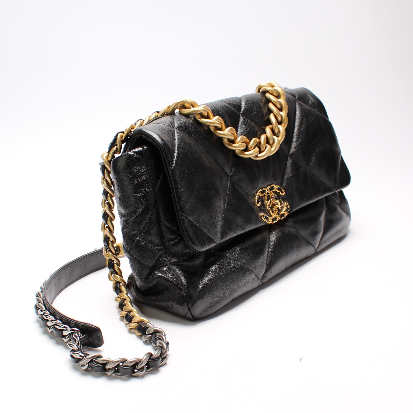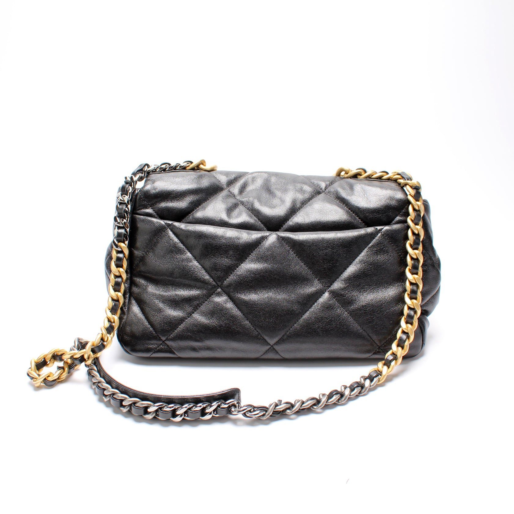 Chanel 19 Large Flap. The exterior is in the classic Chanel Quilted goatskin.Â