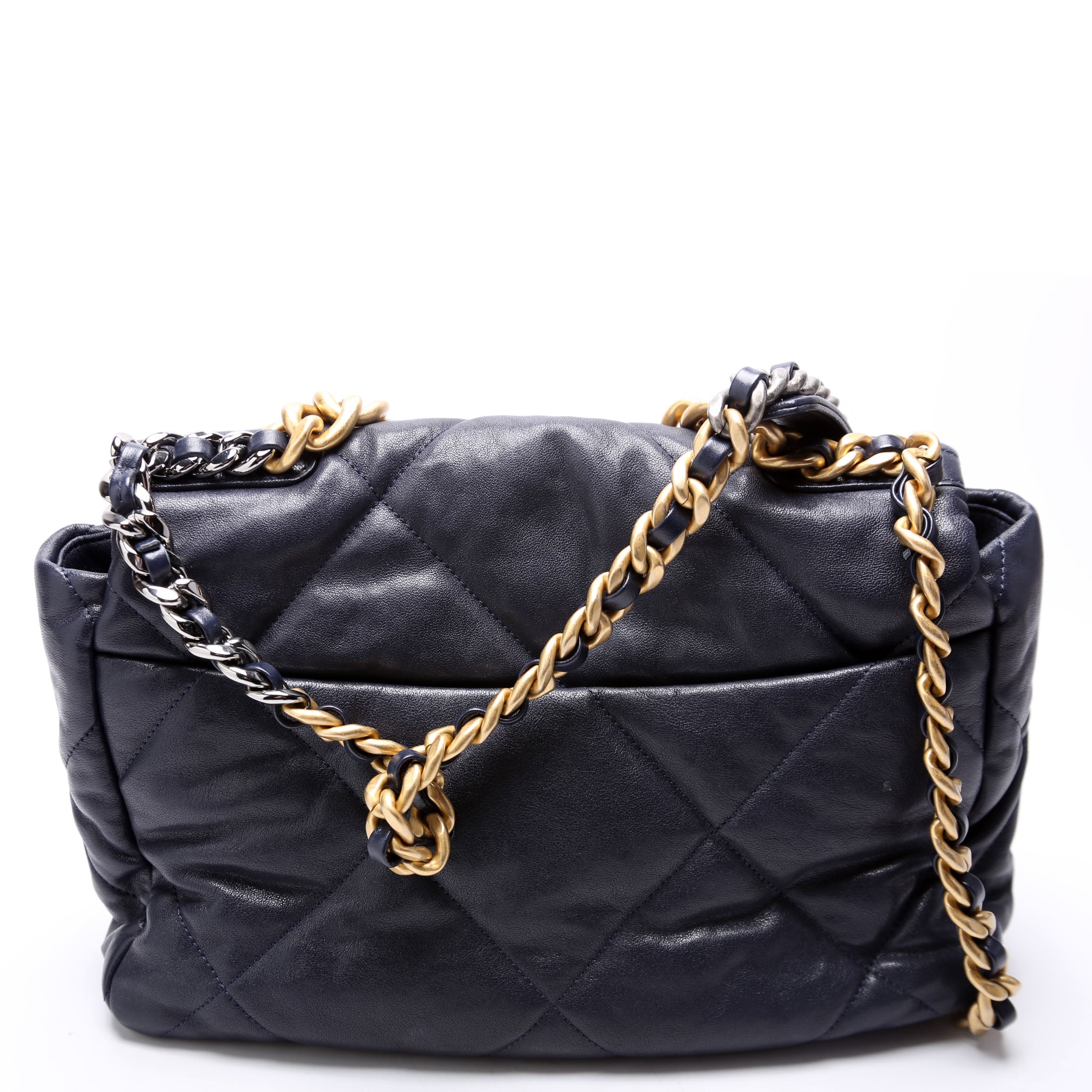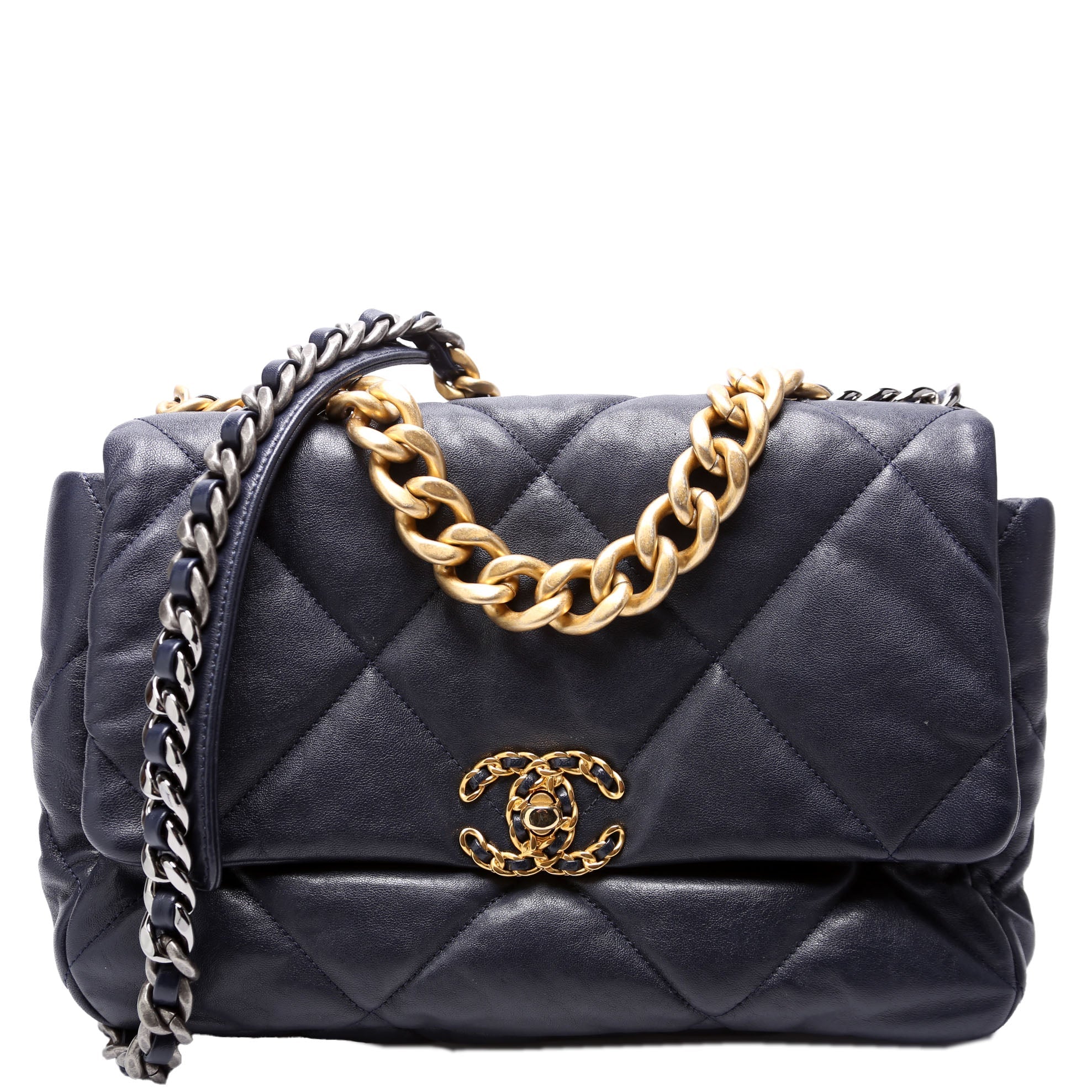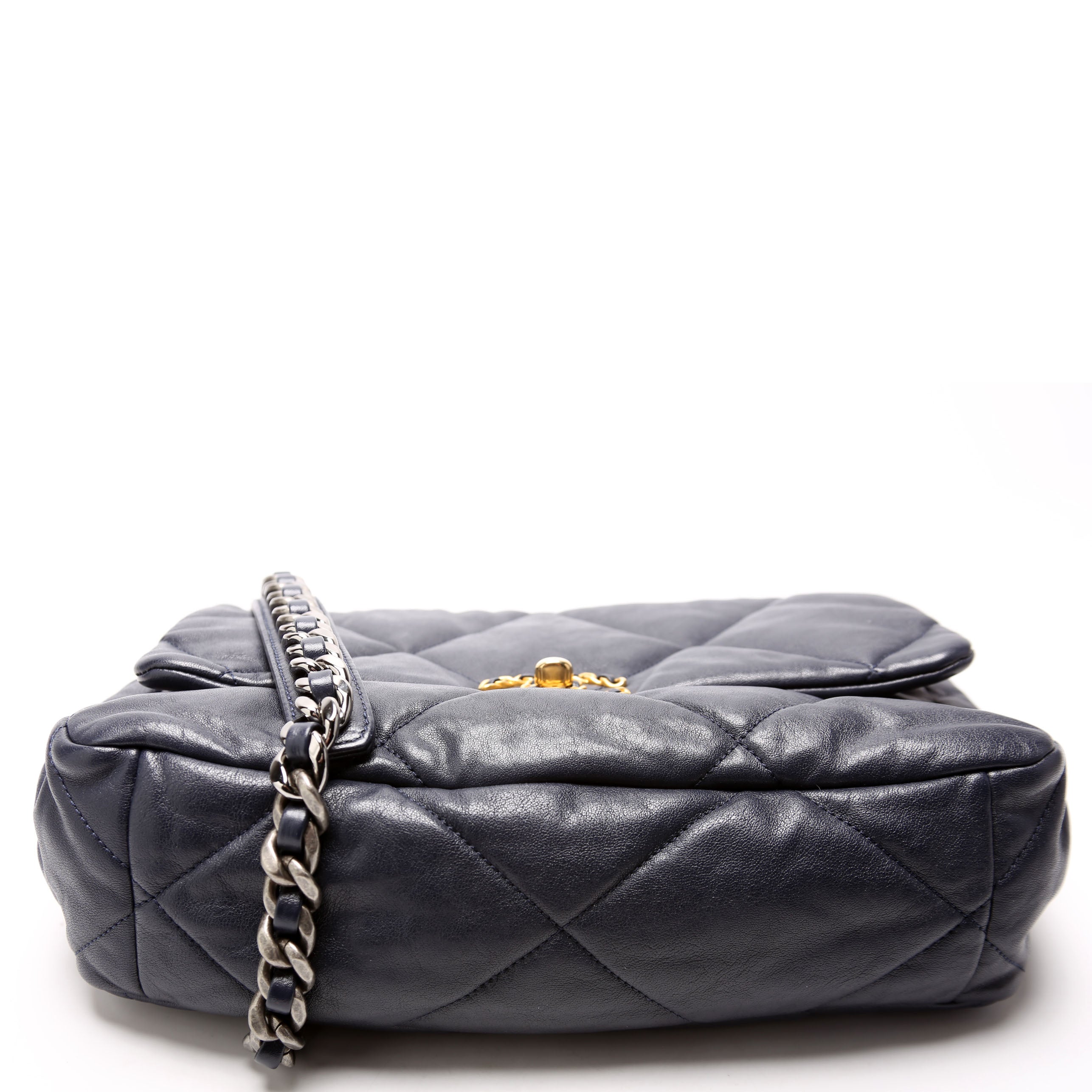 Chanel 19 Large Flap. The exterior is in the classic Chanel Quilted Goatskin leather.Â