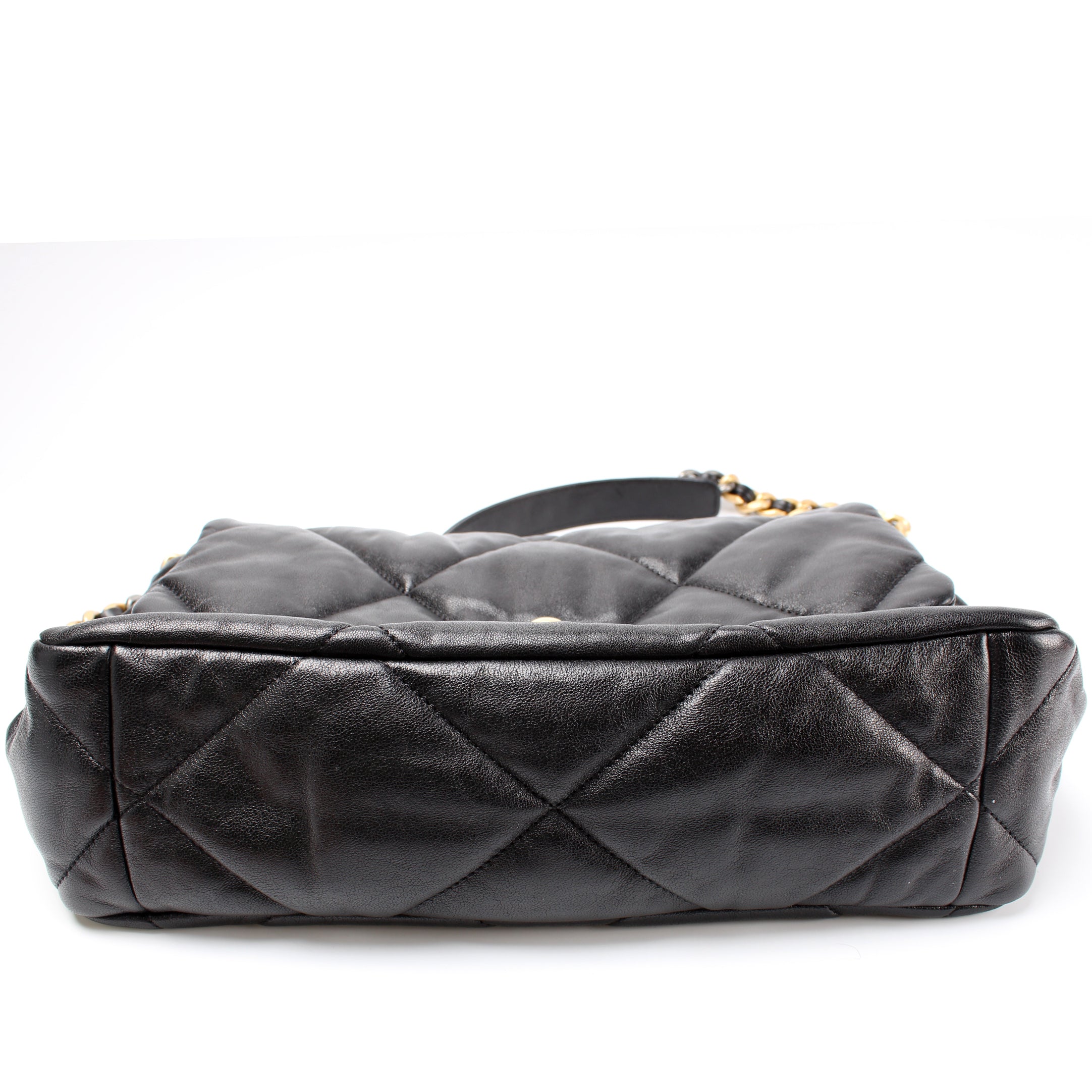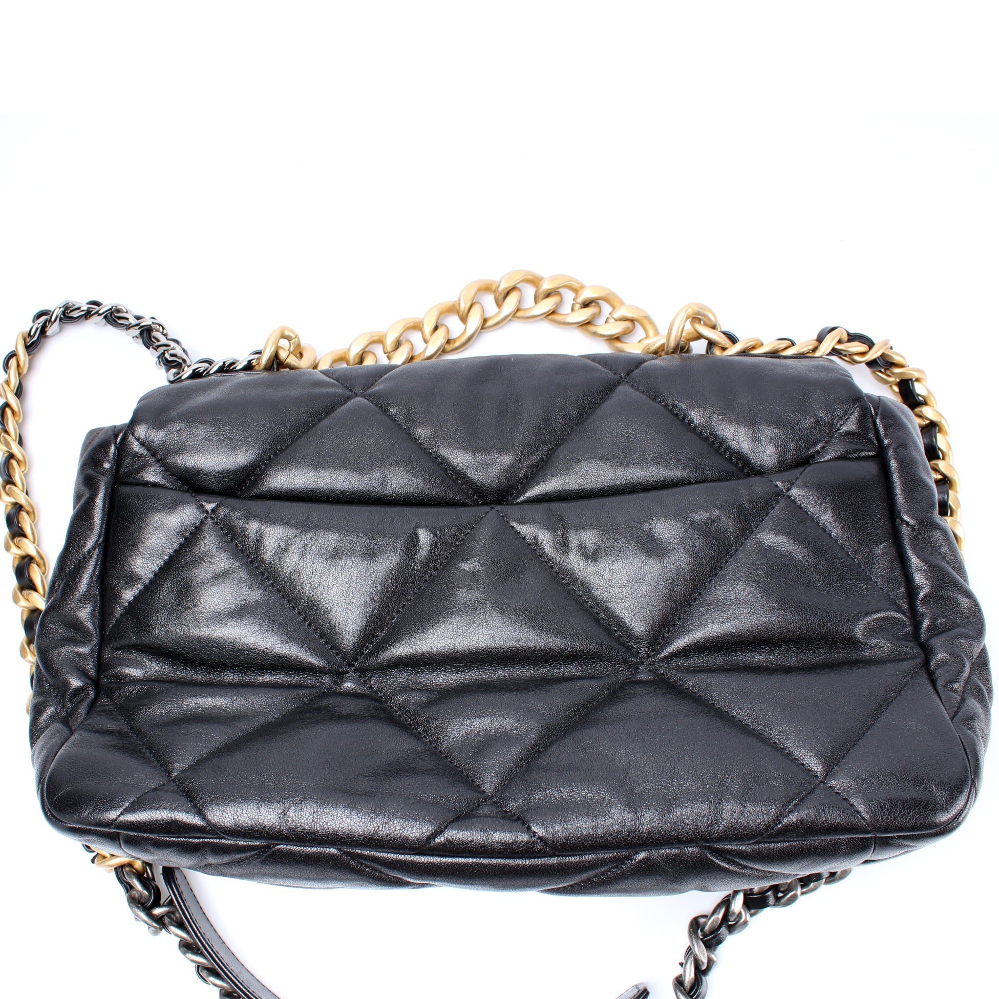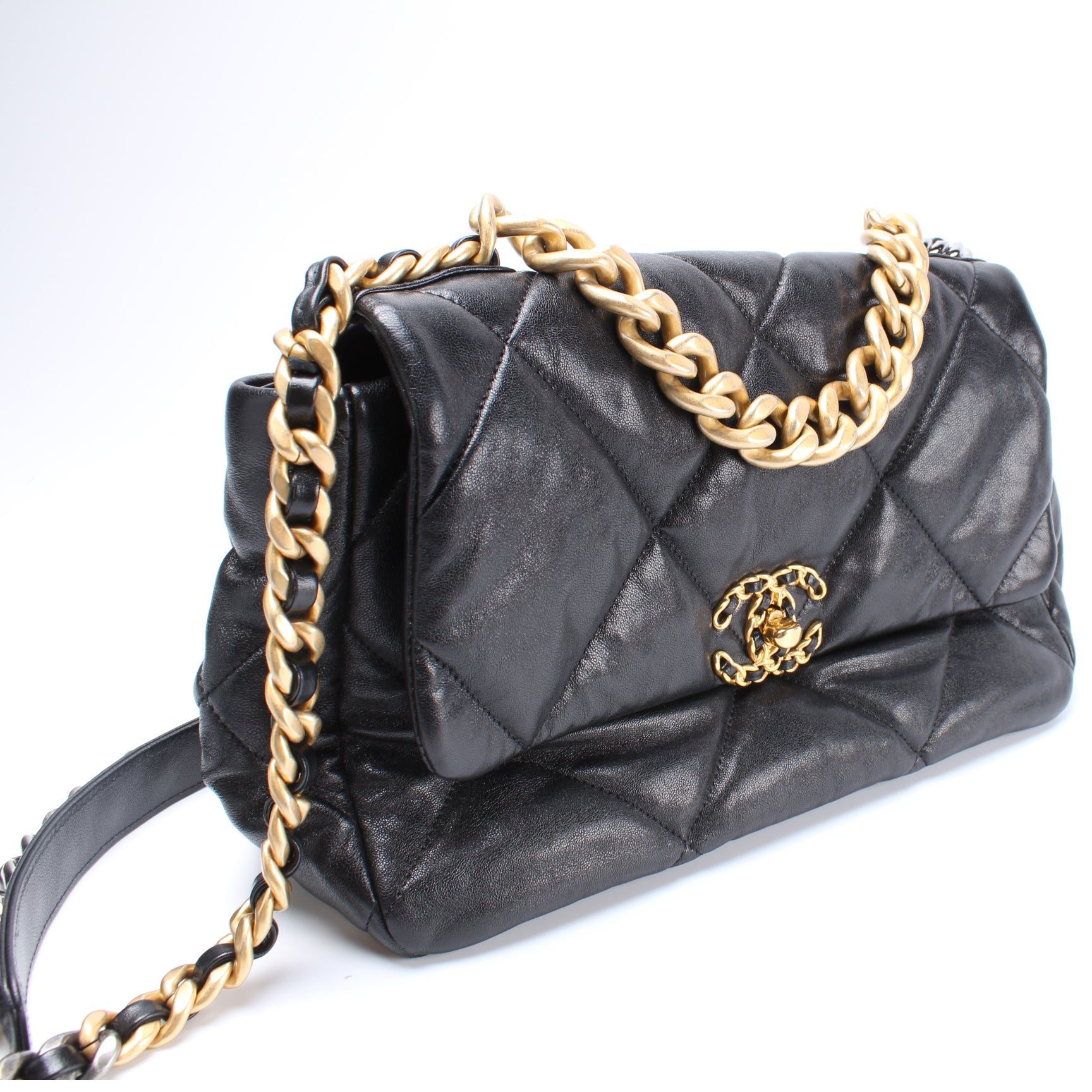 Chanel 19 Medium Flap. The exterior is in the Chanel Quilted goatskin.Â