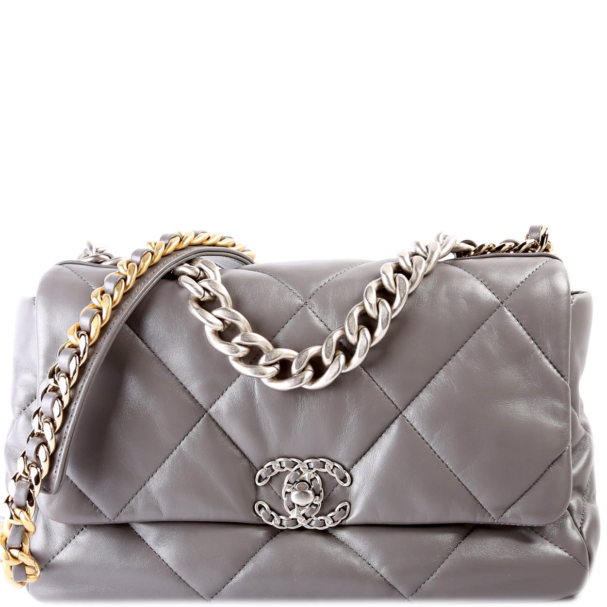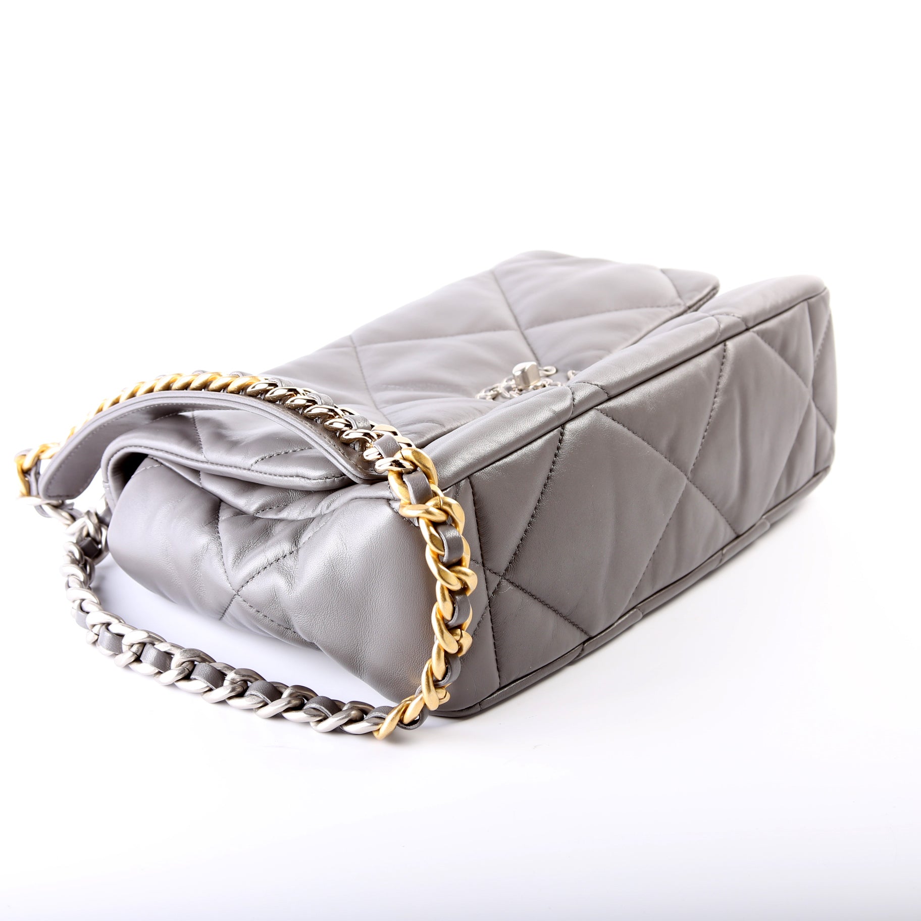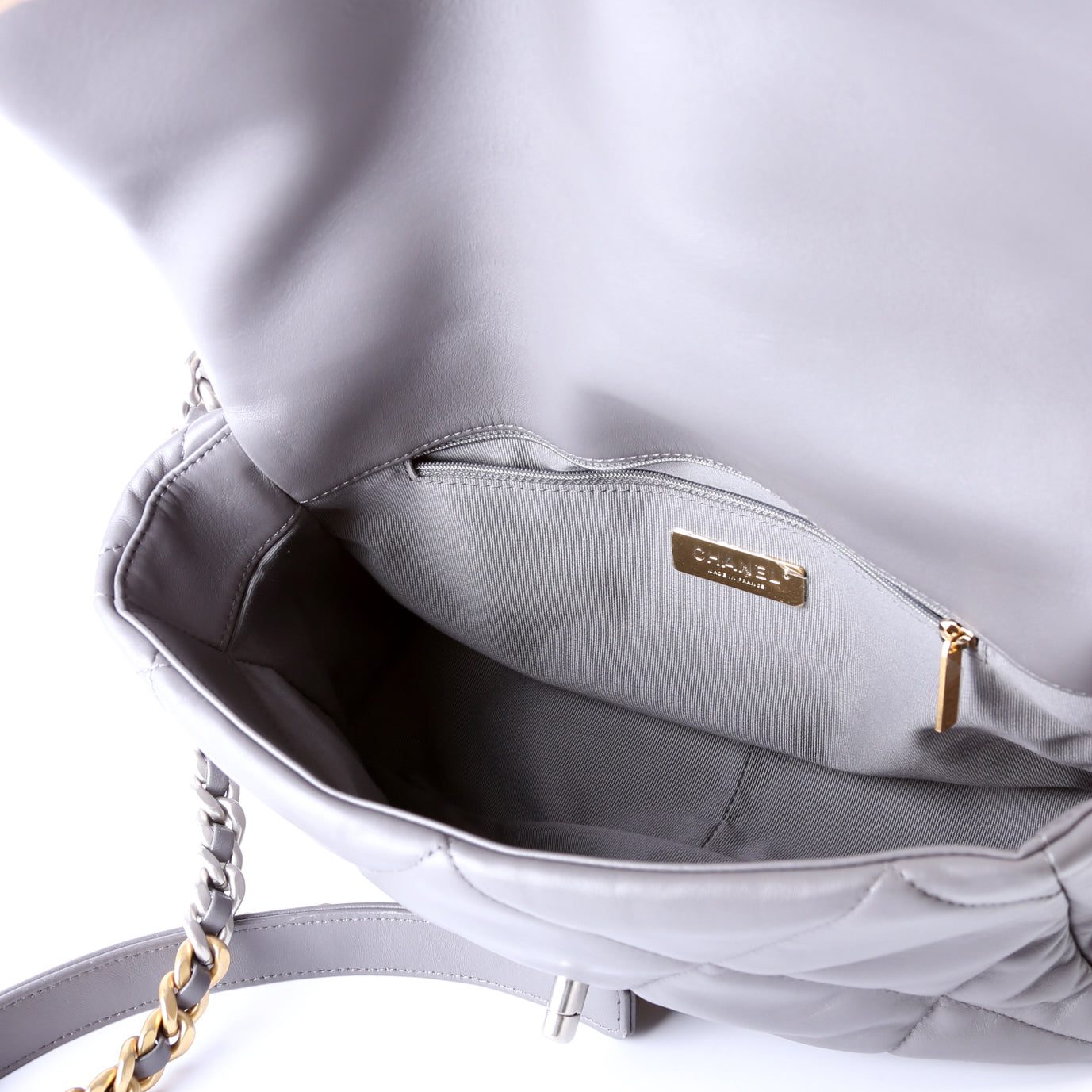 Chanel Quilted Goatskin 19 Large Flap 32+M. The exterior is in the classic Chanel Quilted Goatskin leather.Â
