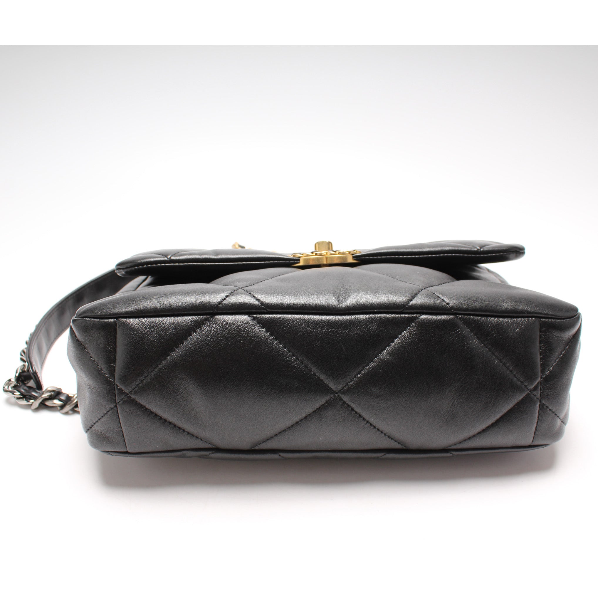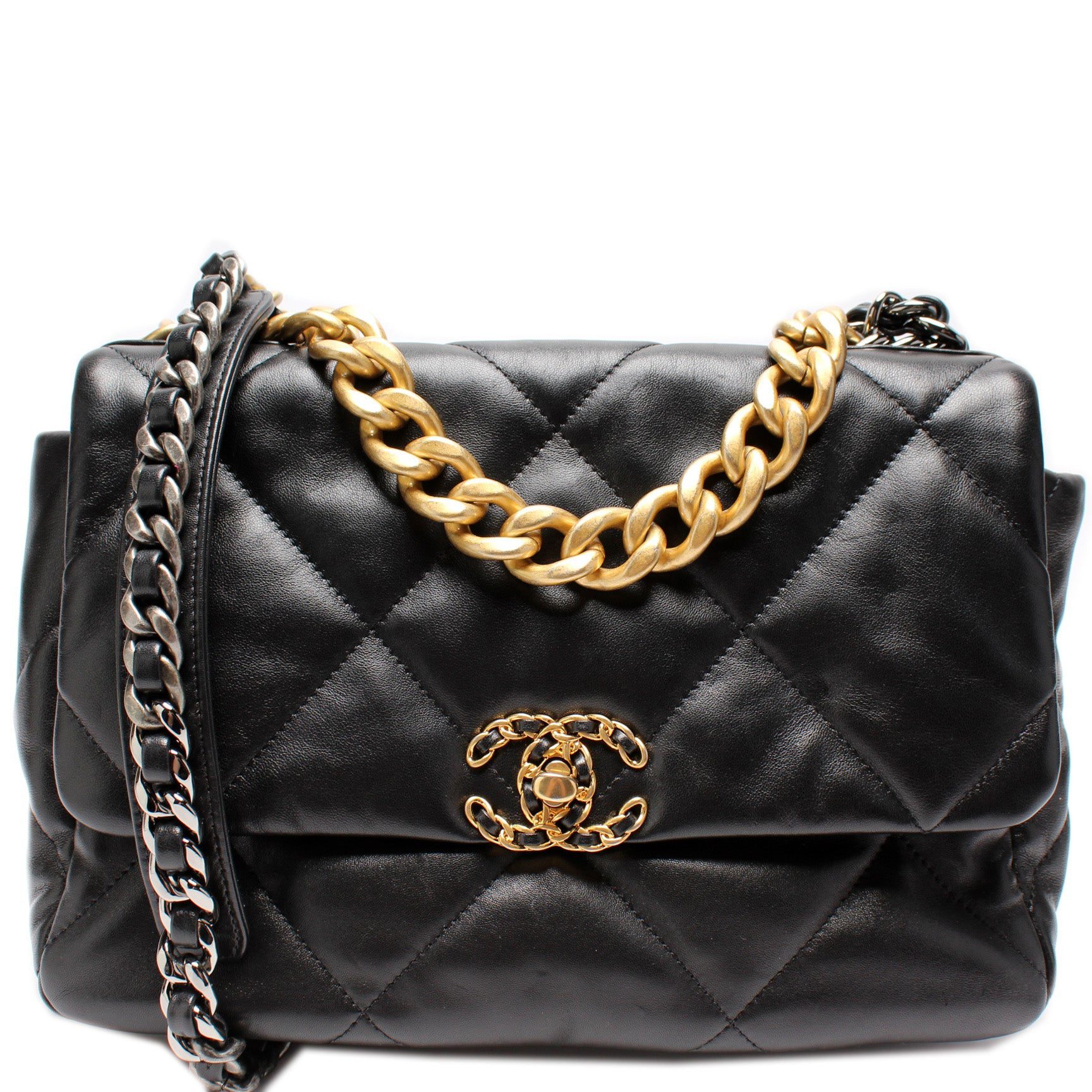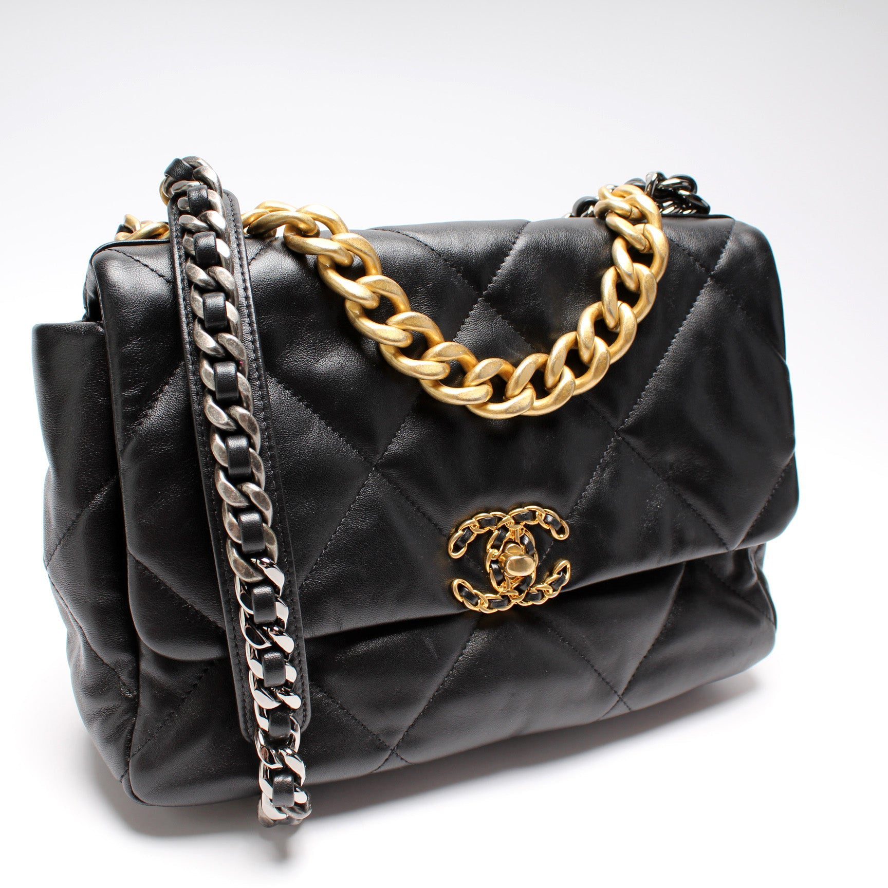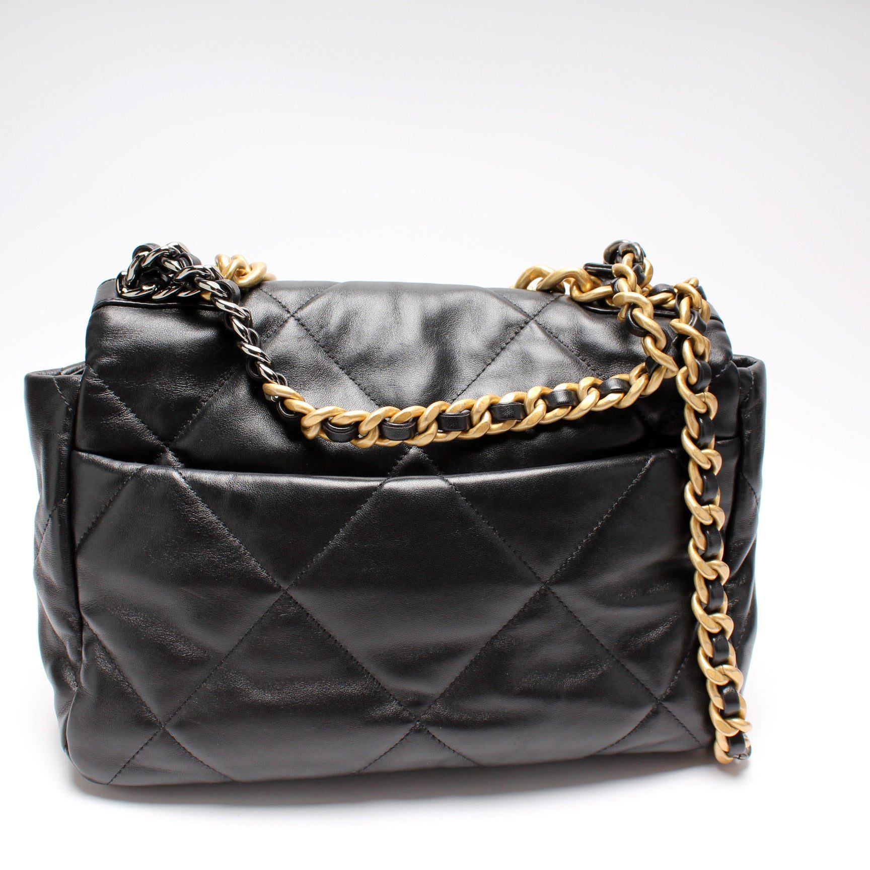 Chanel 19 Large Flap. The exterior is in the classic Chanel Quilted goatskin.Â