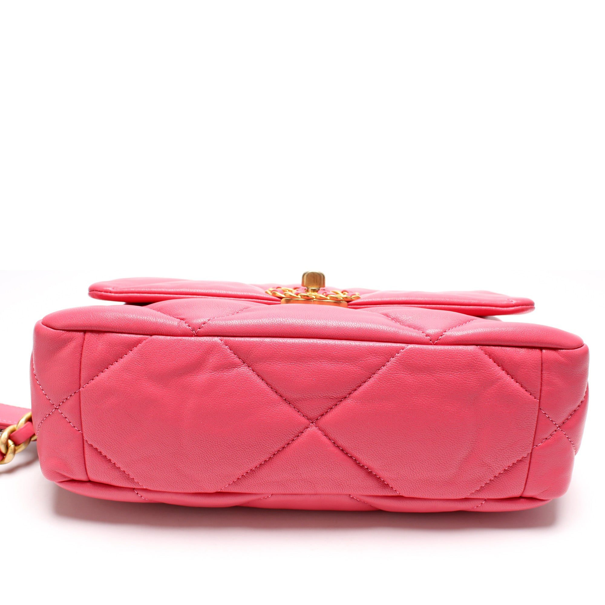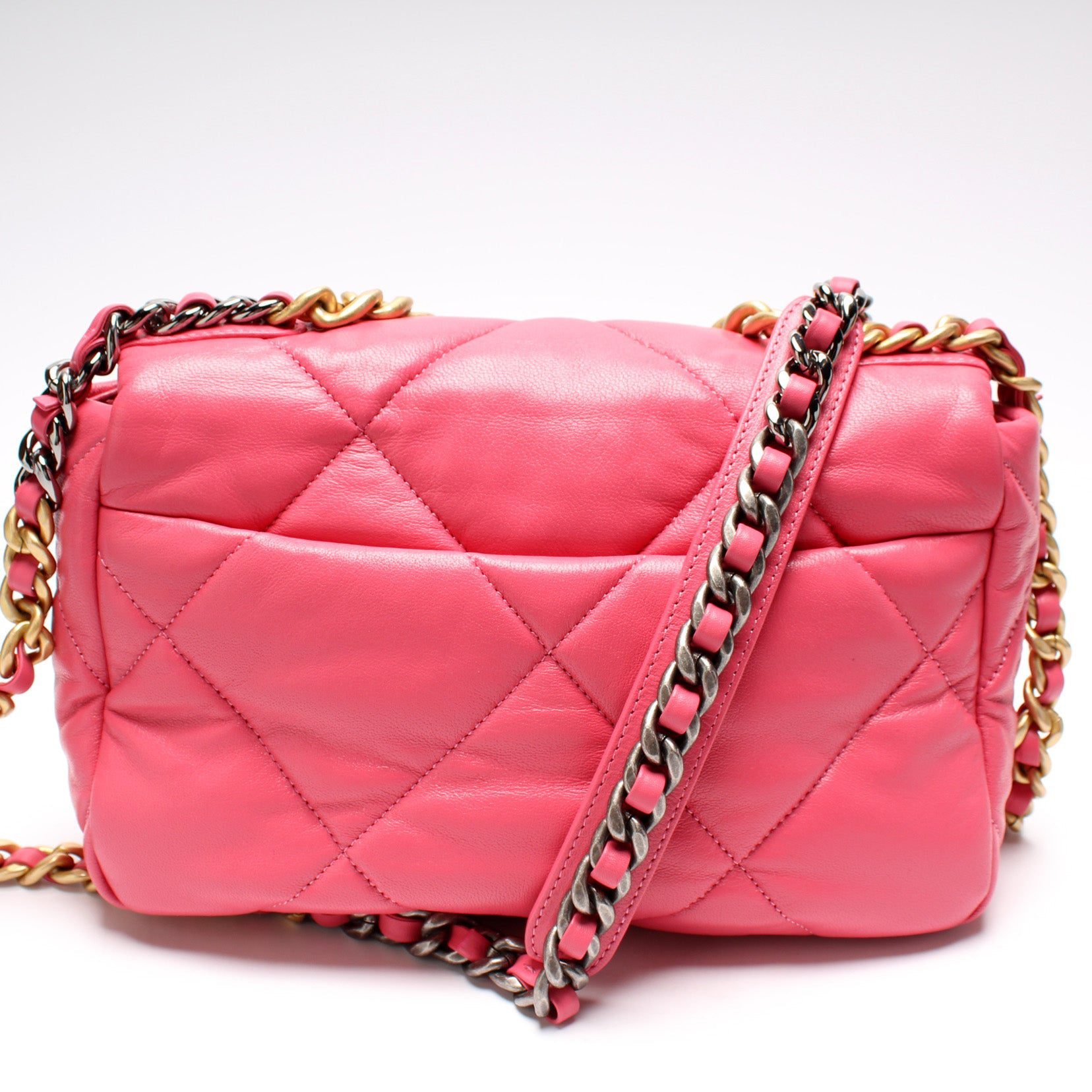 Chanel 19 Medium Flap. The exterior is in the Chanel Quilted goatskin.Â