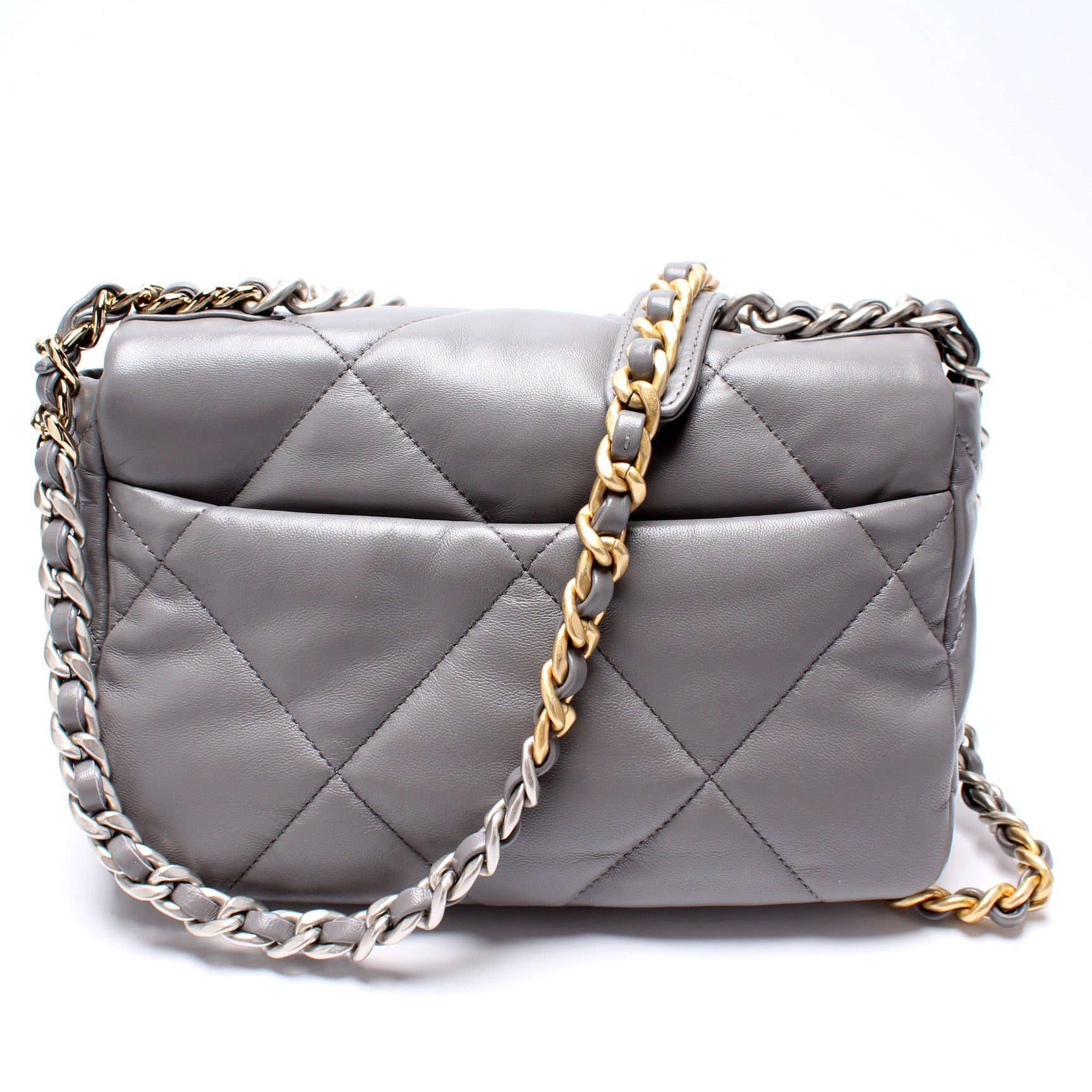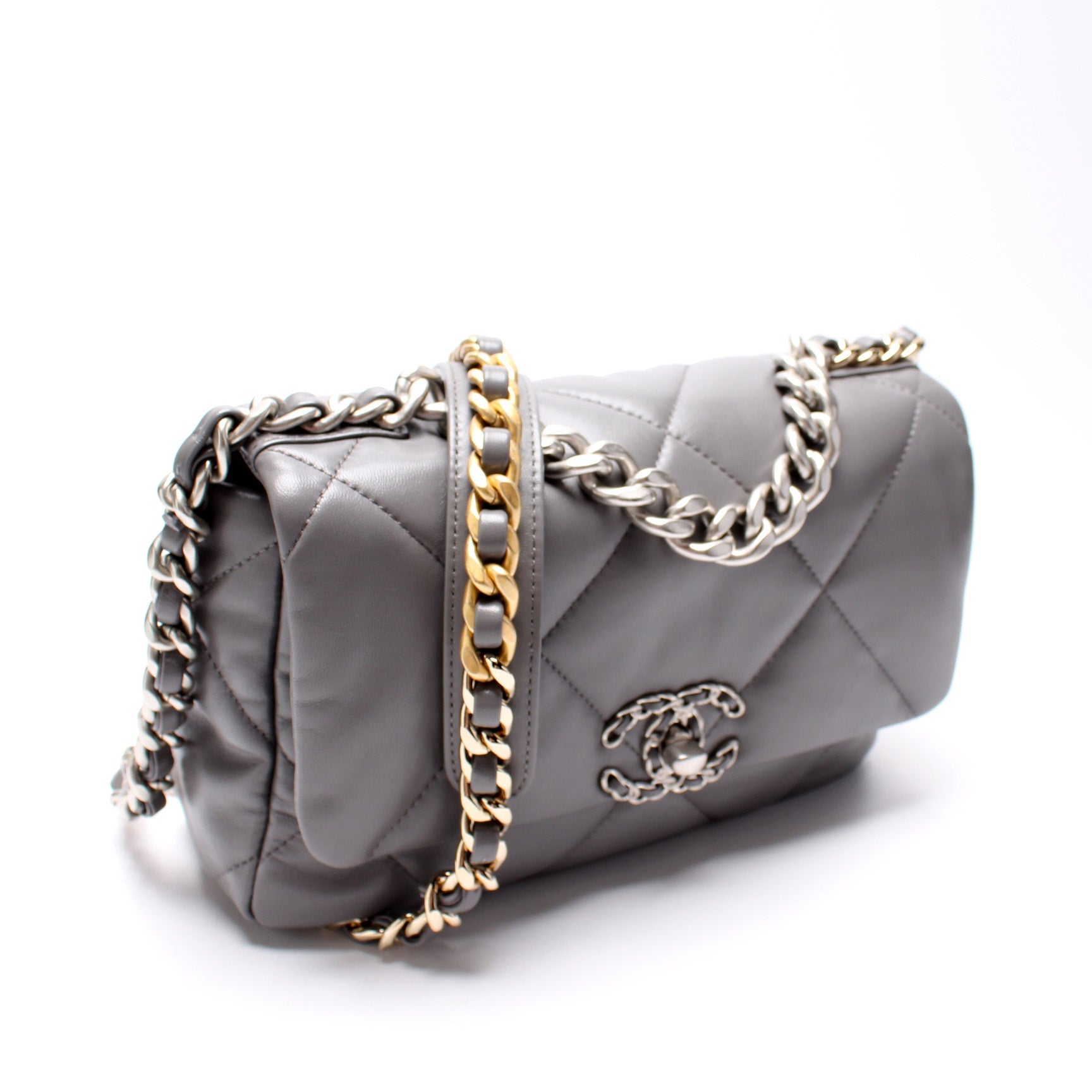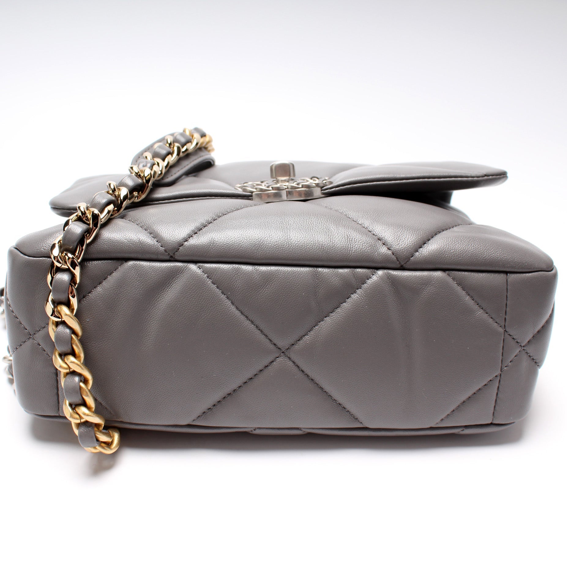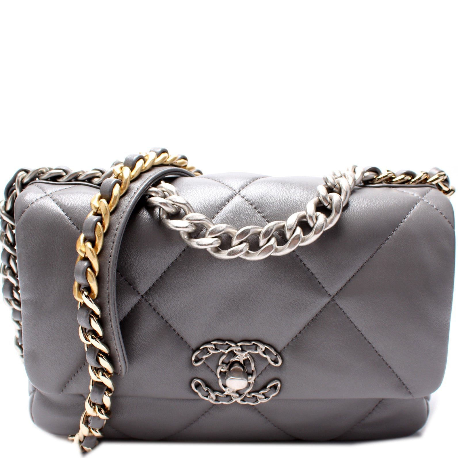 Chanel 19 Small Flap. The exterior is in the classic Chanel Quilted Goatskin leather.Â