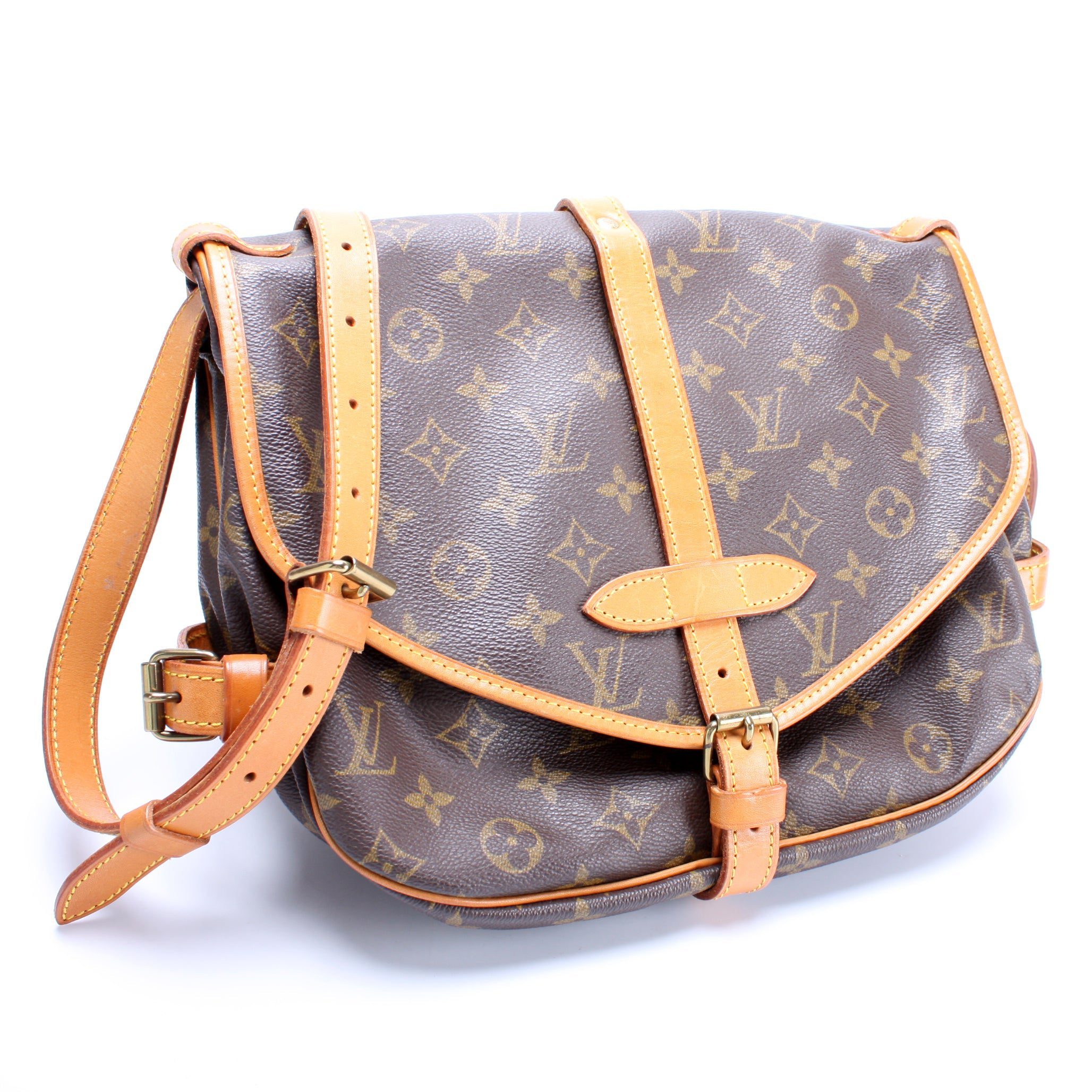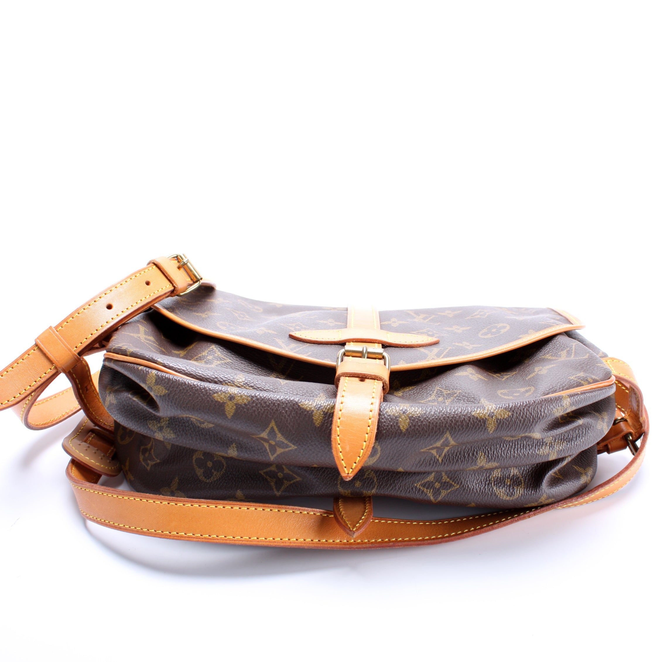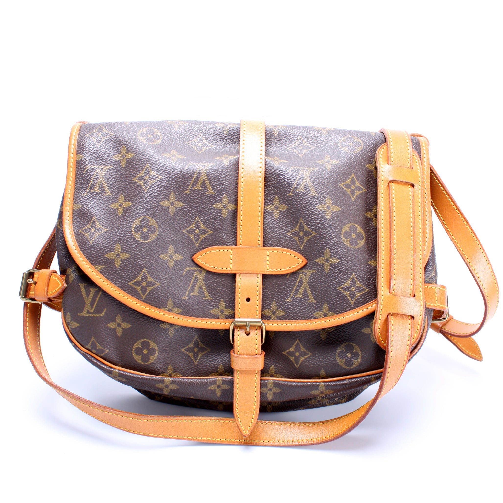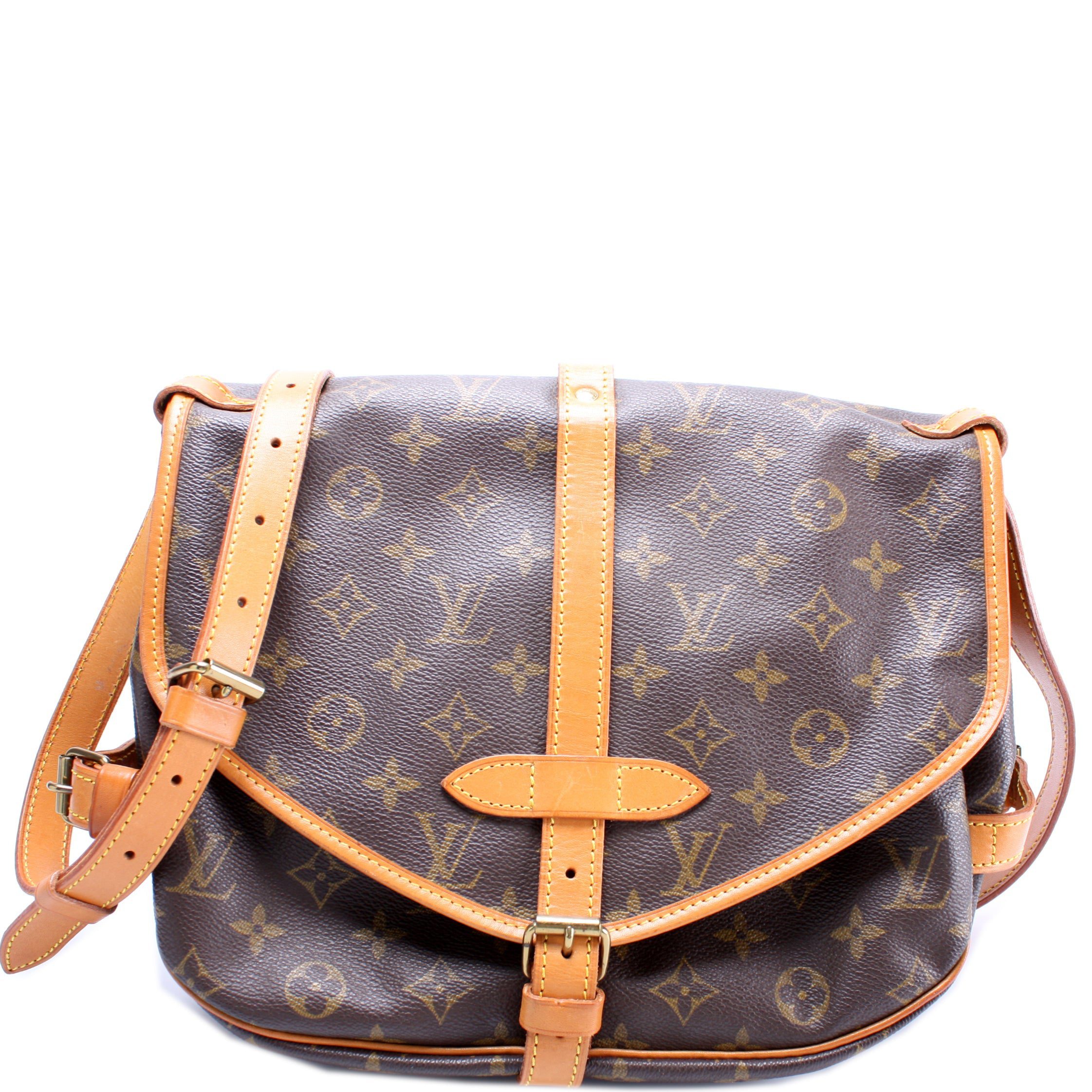Louis Vuitton Saumur 30. The exterior is in the classic Louis Vuitton Monogram coated canvas.Â