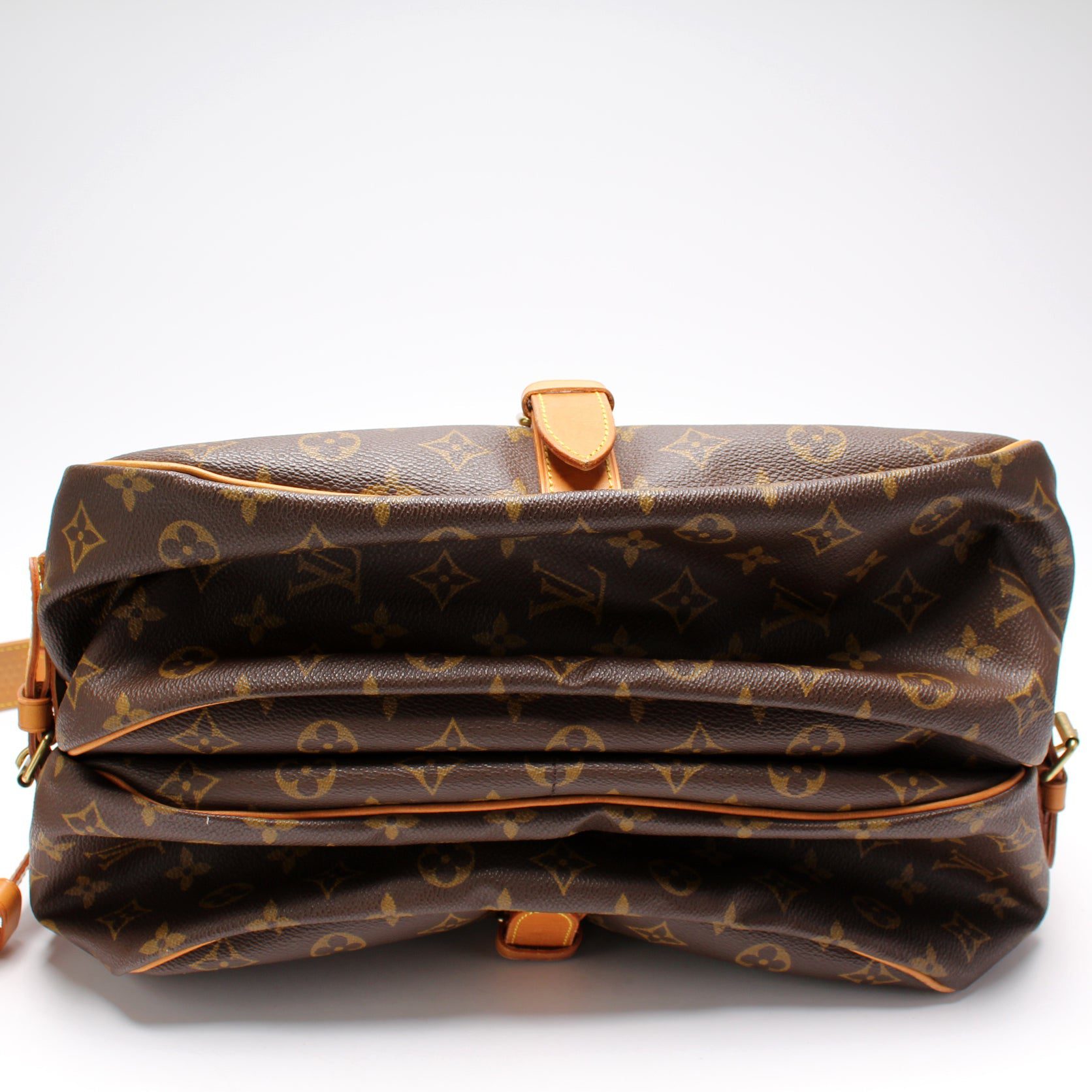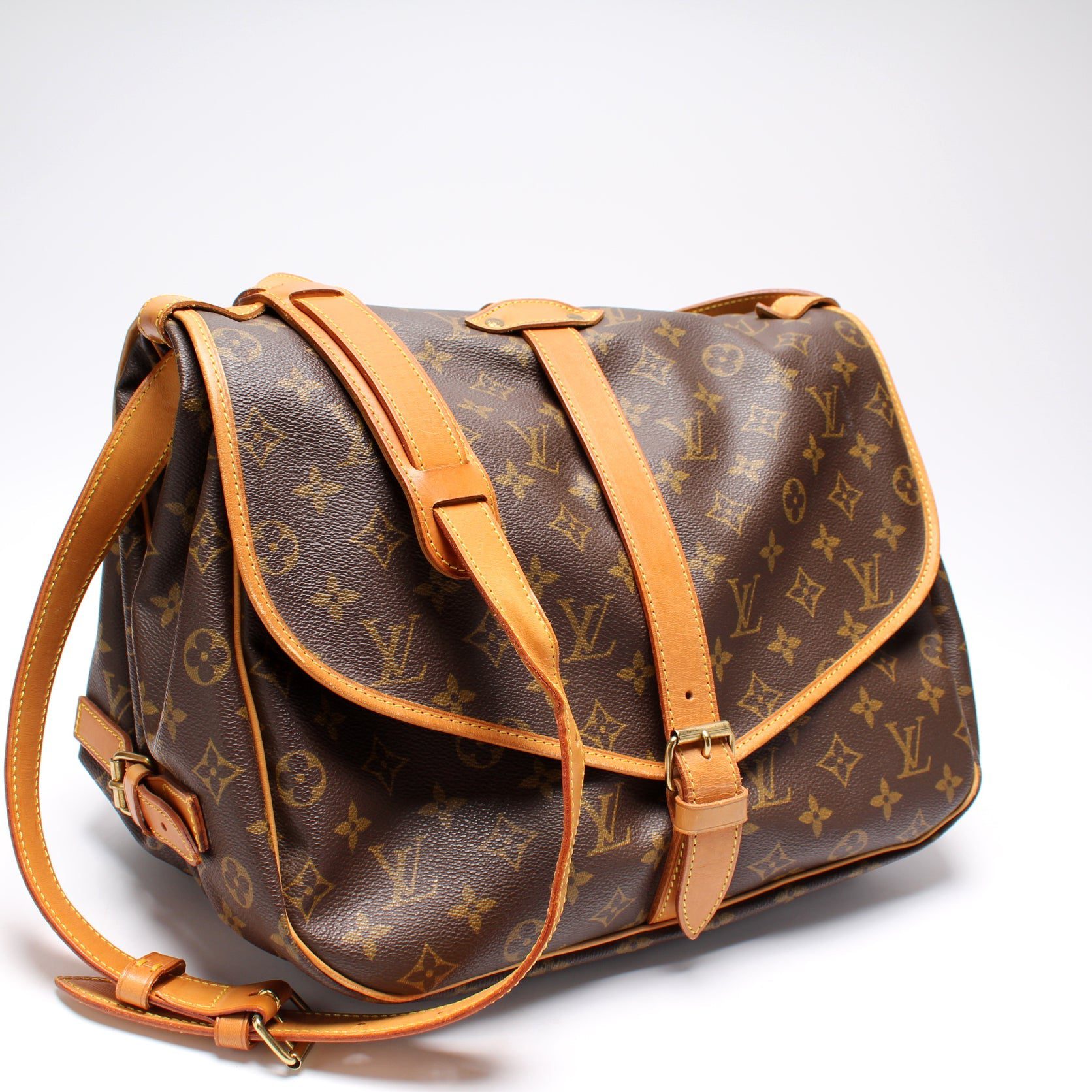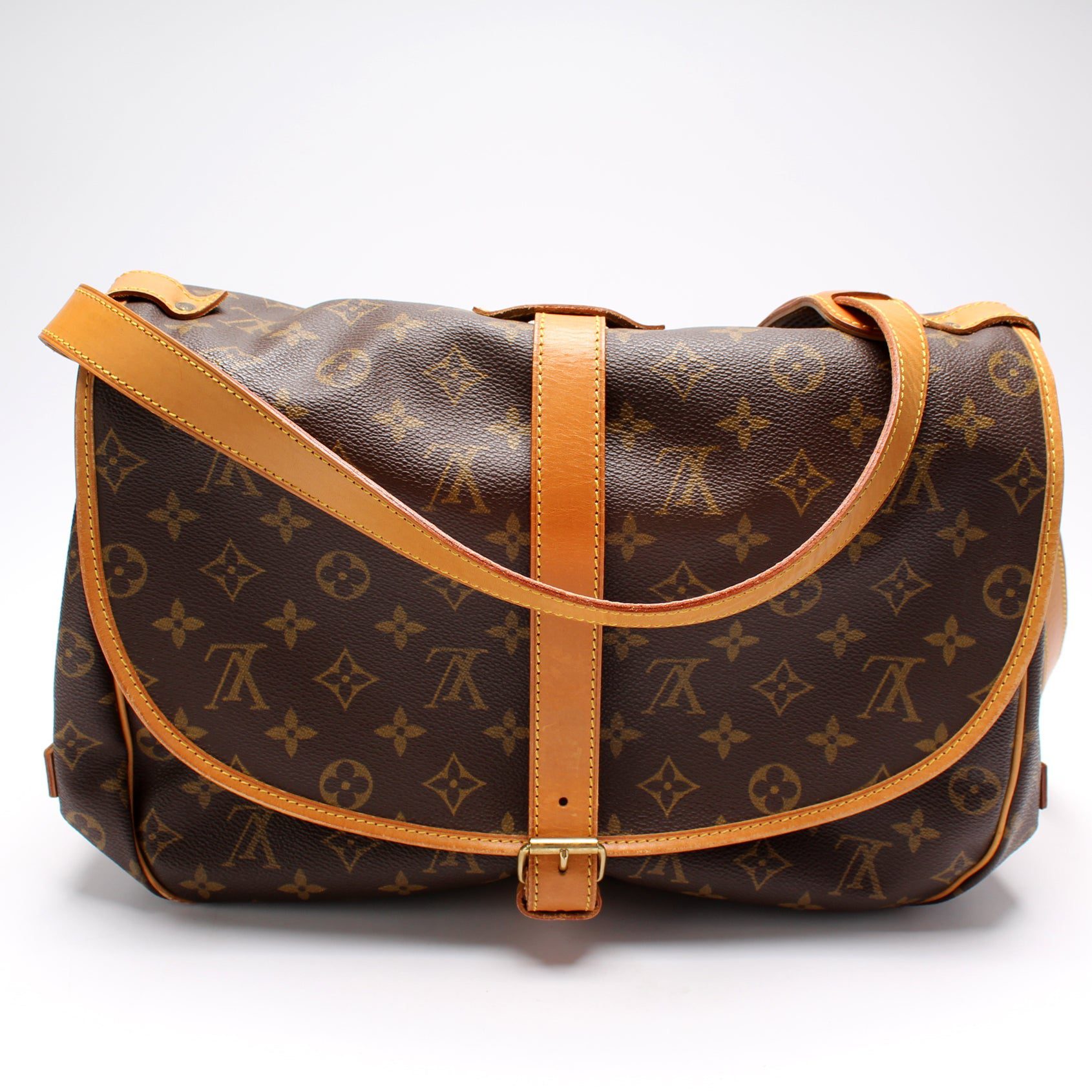 Louis Vuitton Saumur 35. The exterior is in the classic Louis Vuitton Monogram coated canvas.Â