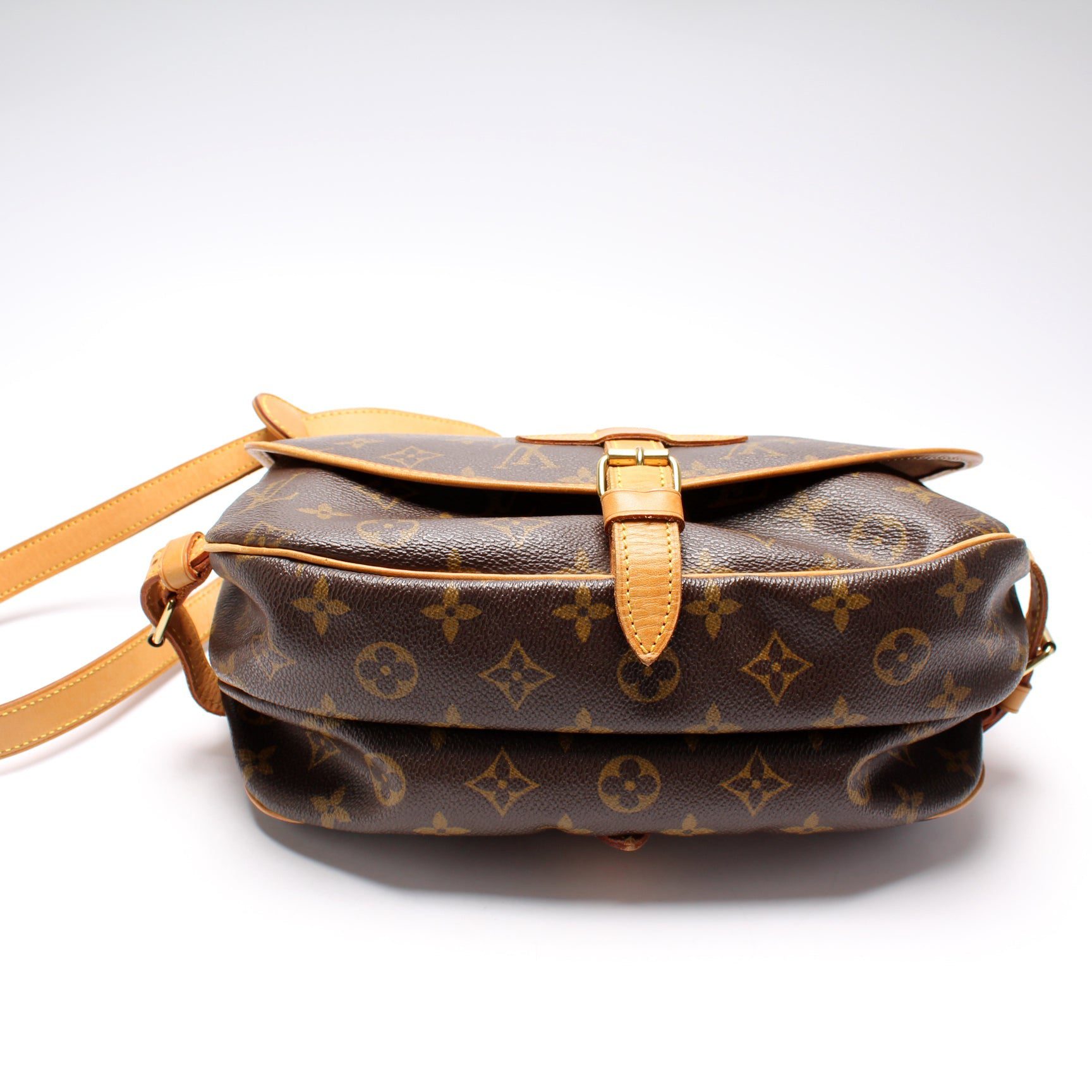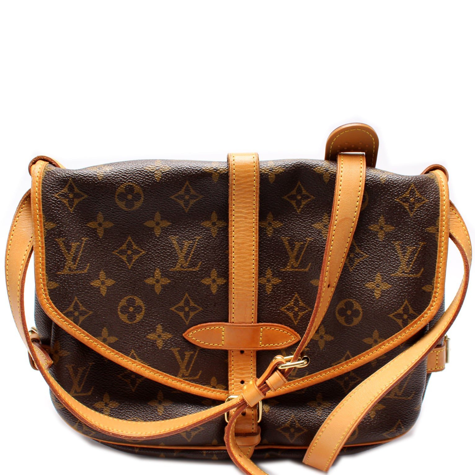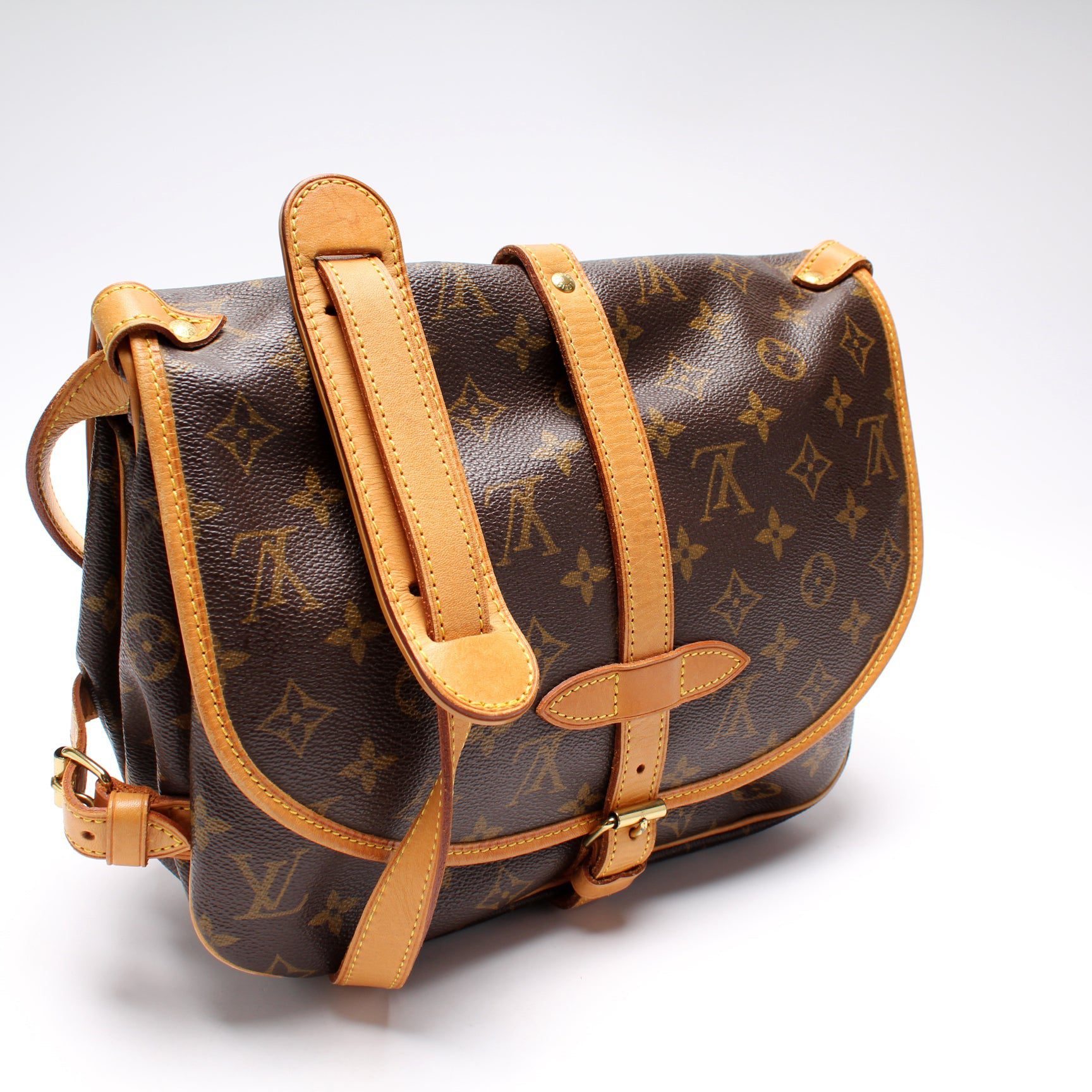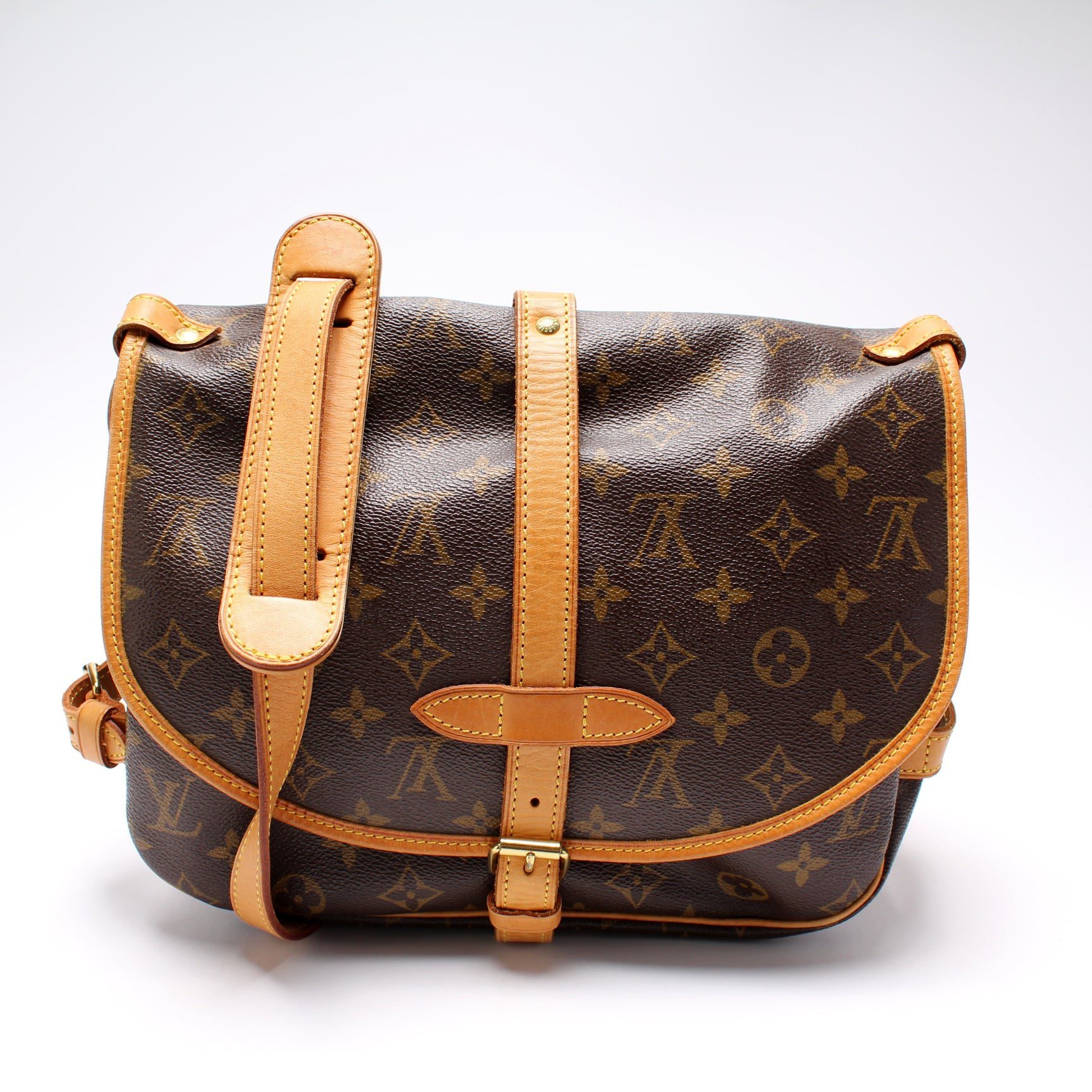 Louis Vuitton Saumur 30. The exterior is in the classic Louis Vuitton Monogram coated canvas.Â