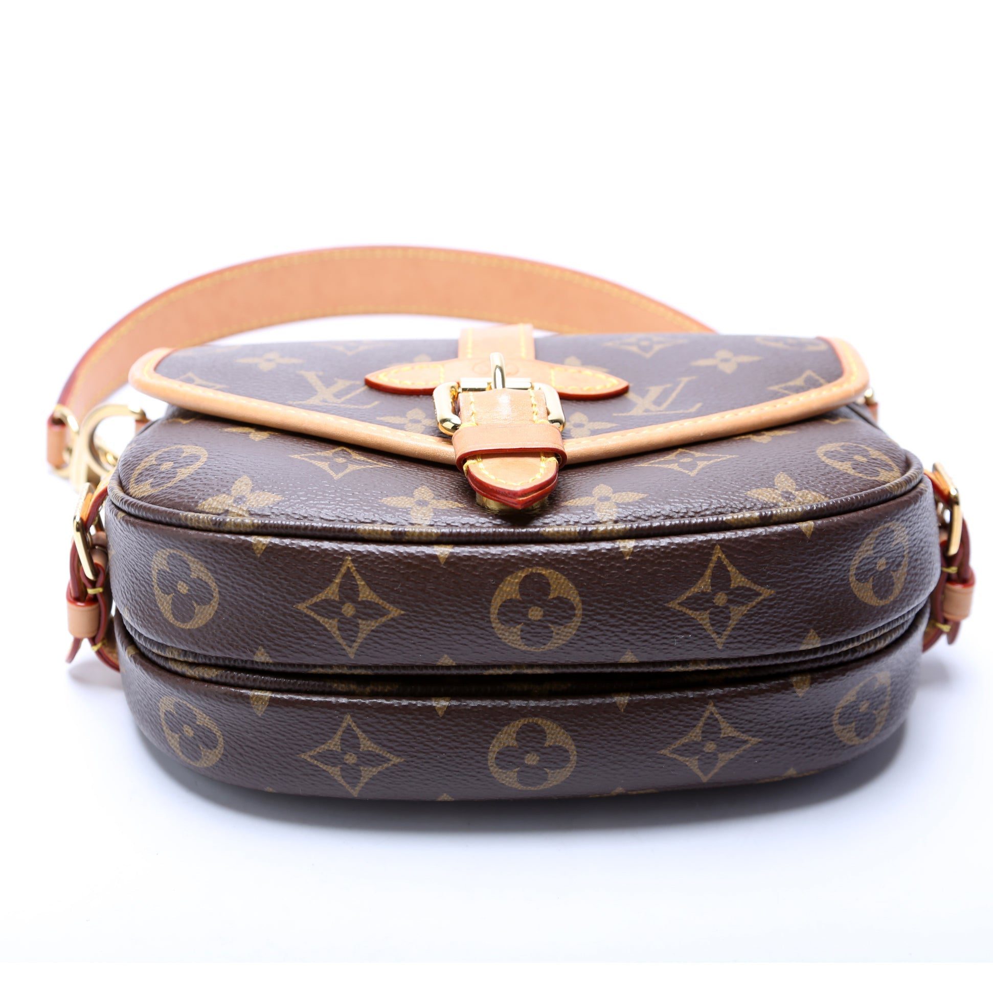 Louis Vuitton Saumur BB. The exterior is in the classic Louis Vuitton Monogram coated canvas.
