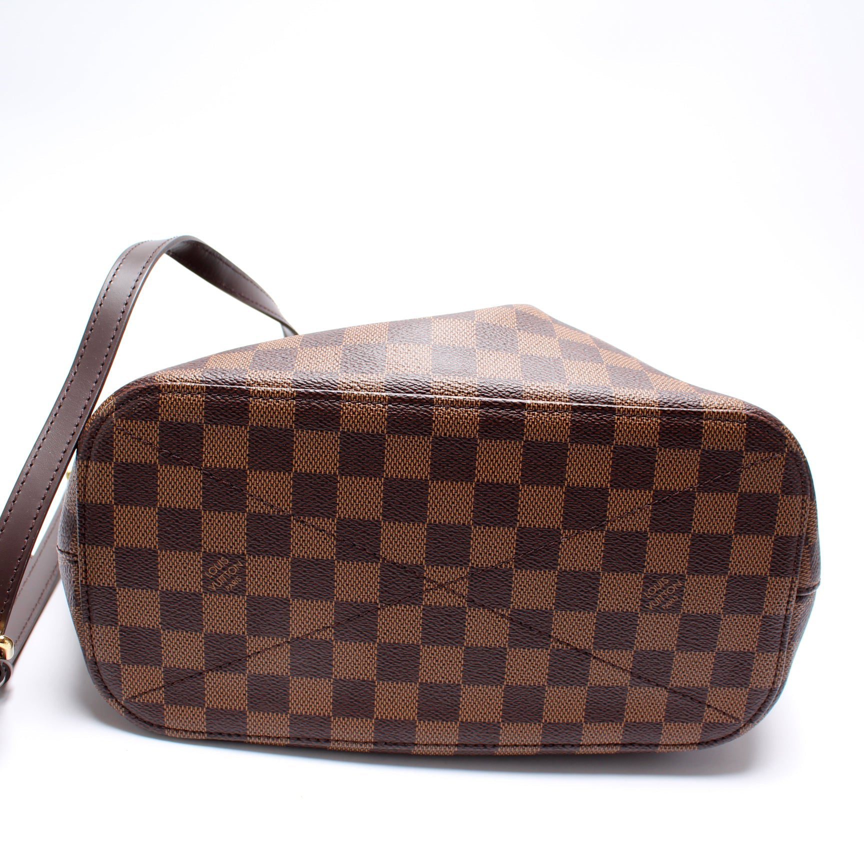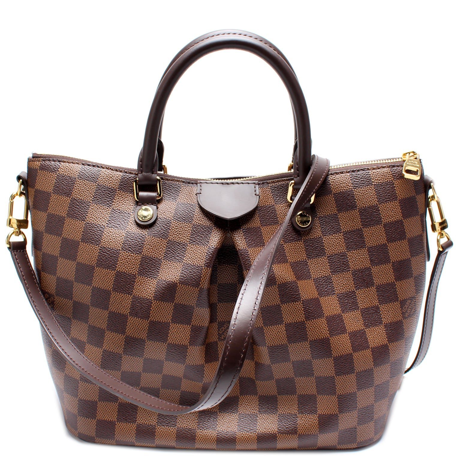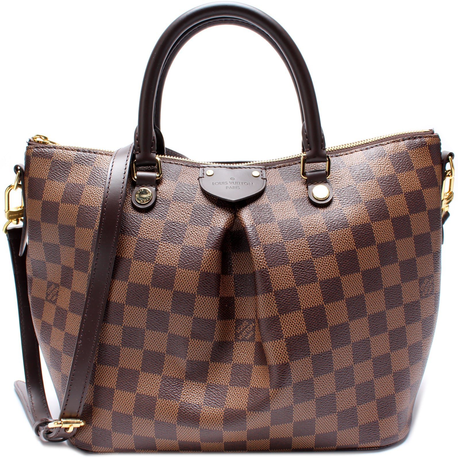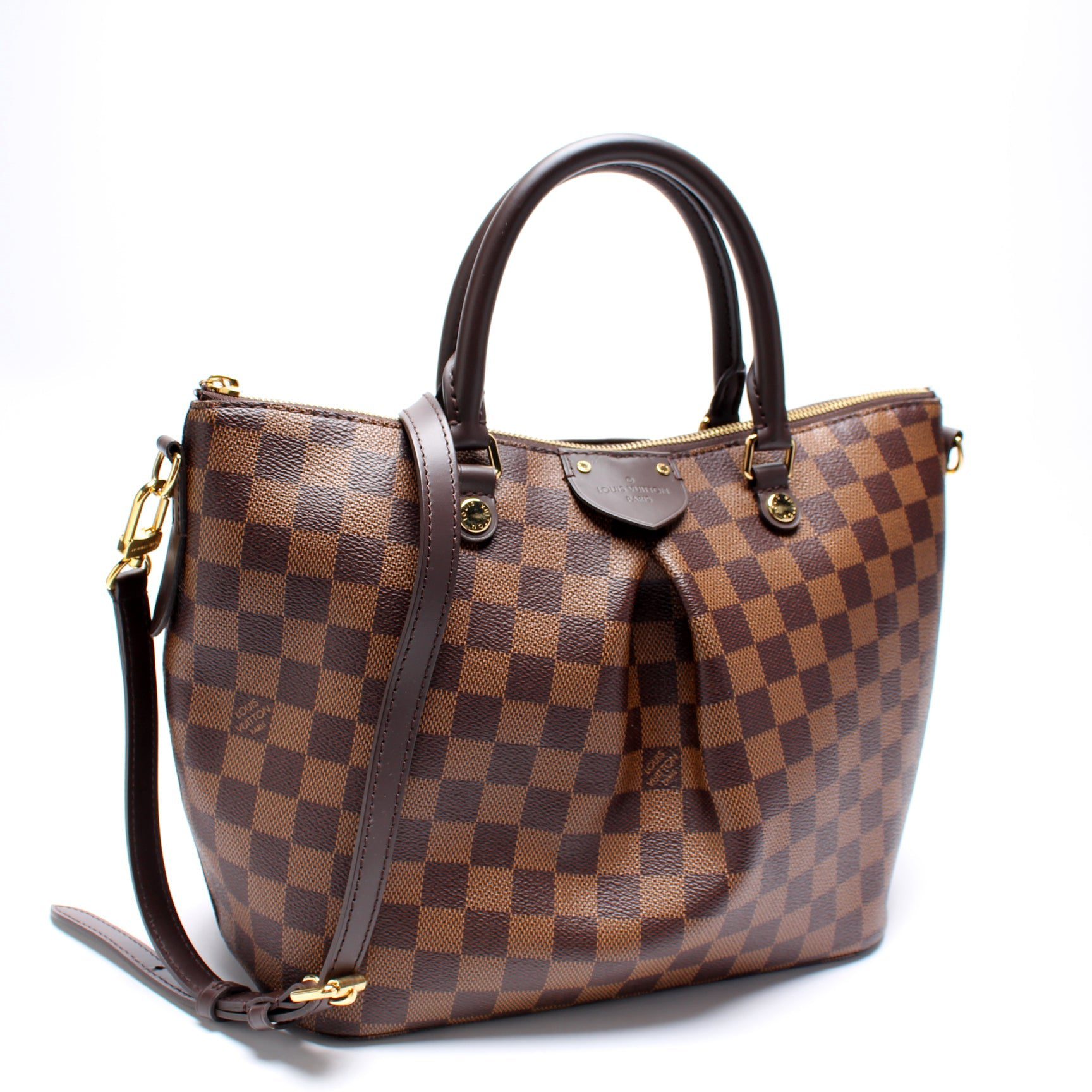 Louis Vuitton Siena MM. The exterior is in the classic Damier Ebene coated canvas.
