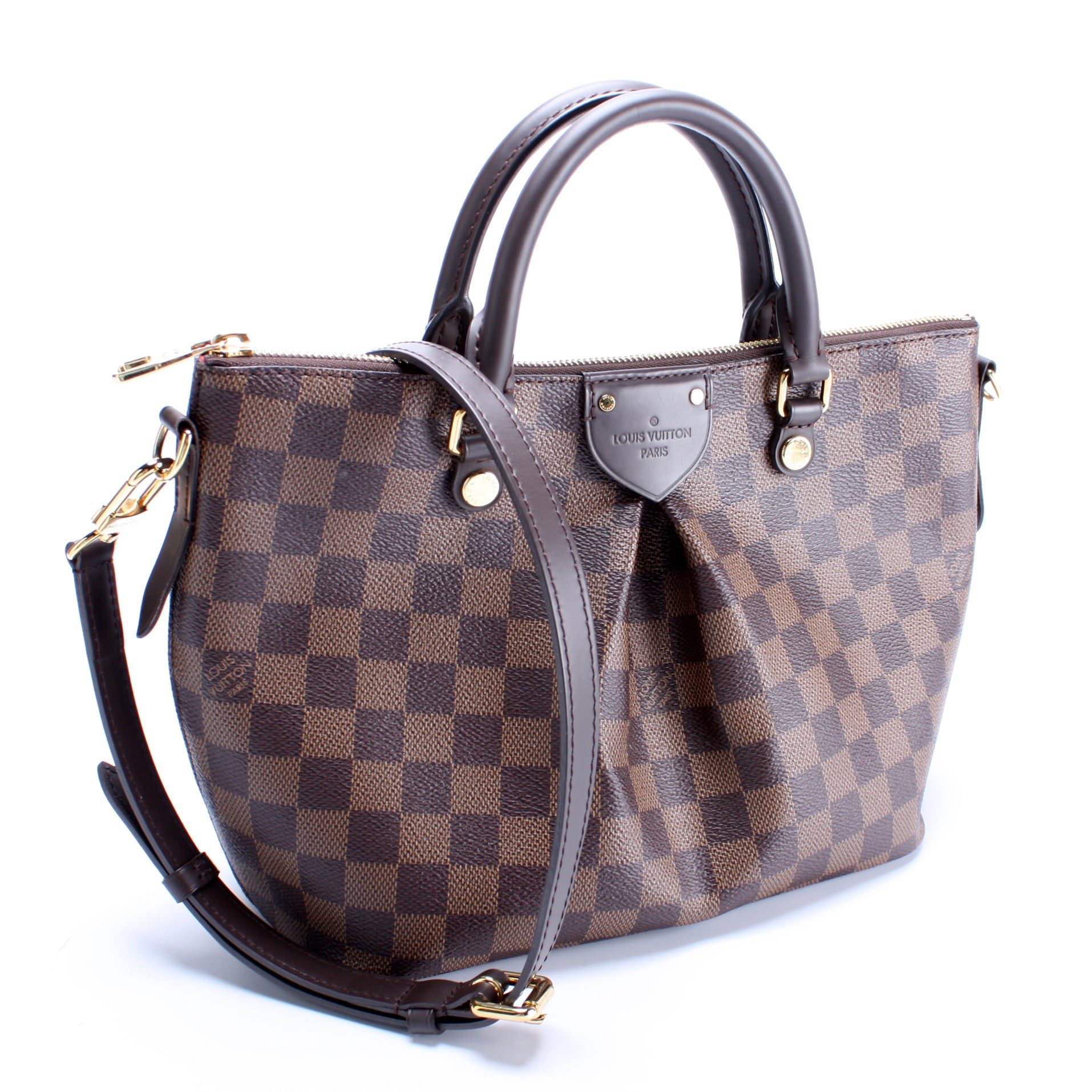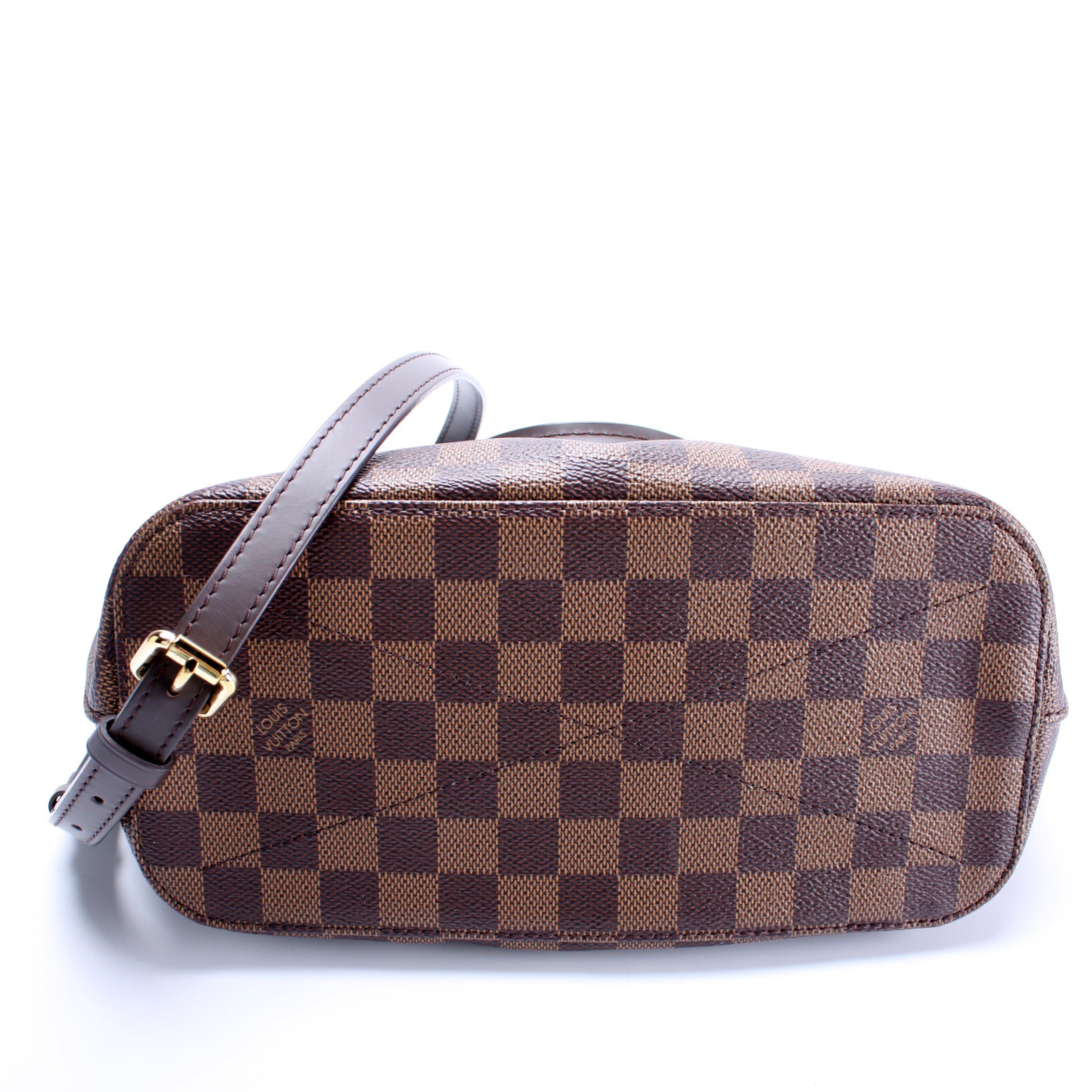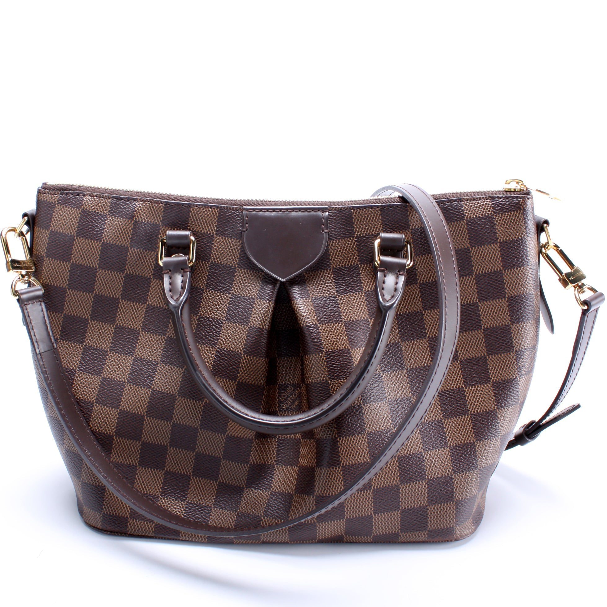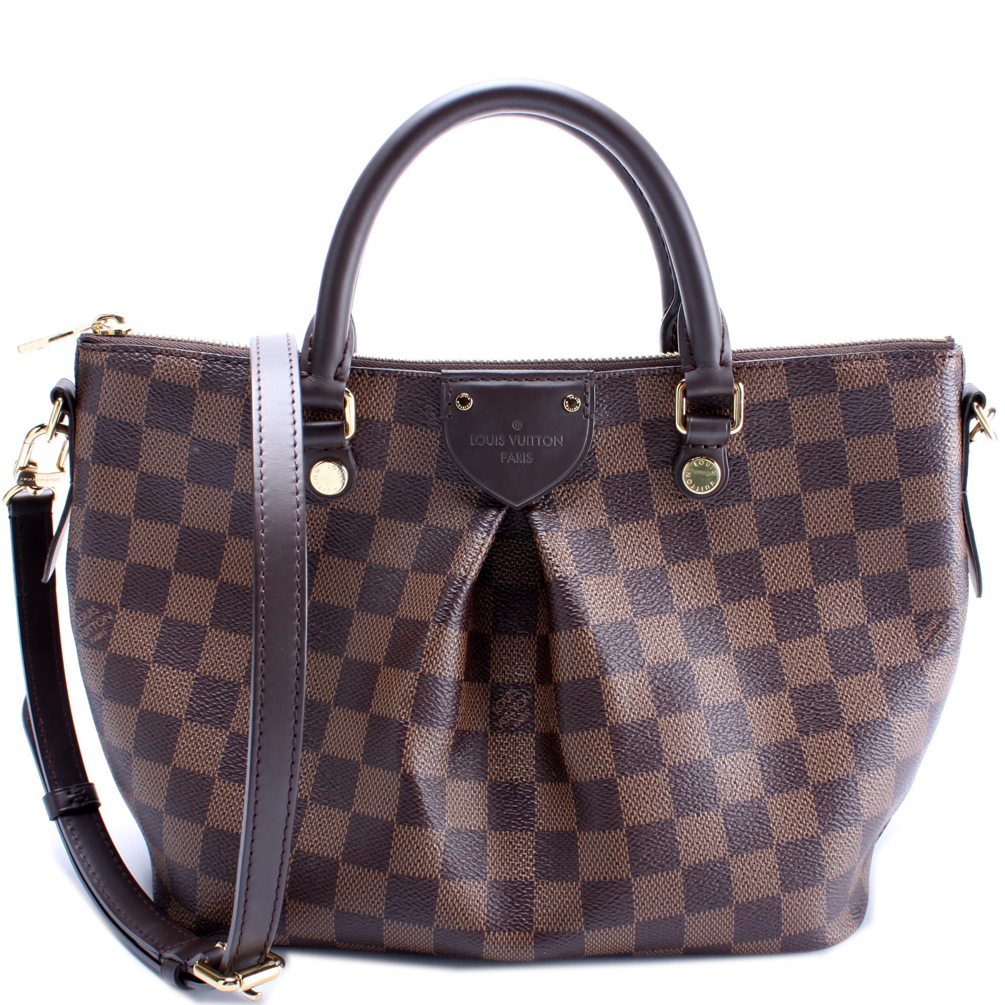 Louis Vuitton Siena PM. The exterior is in the classic Damier Ebene coated canvas. Â