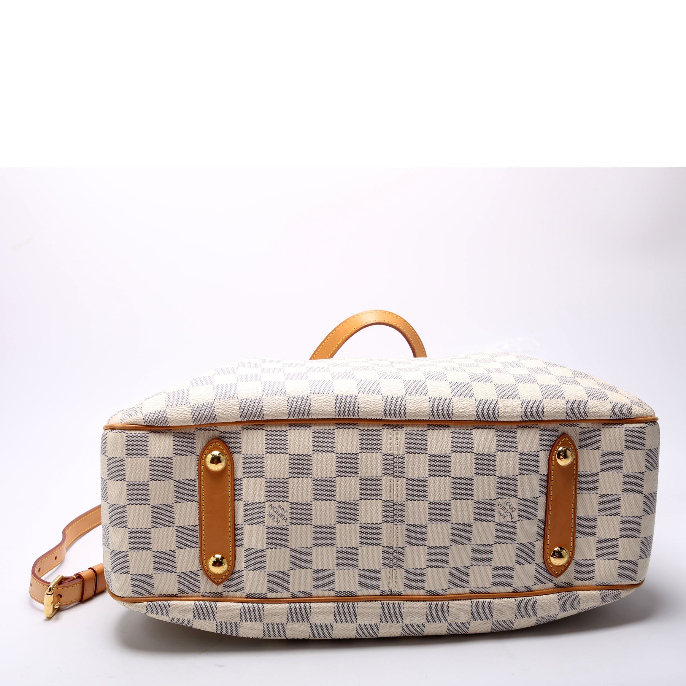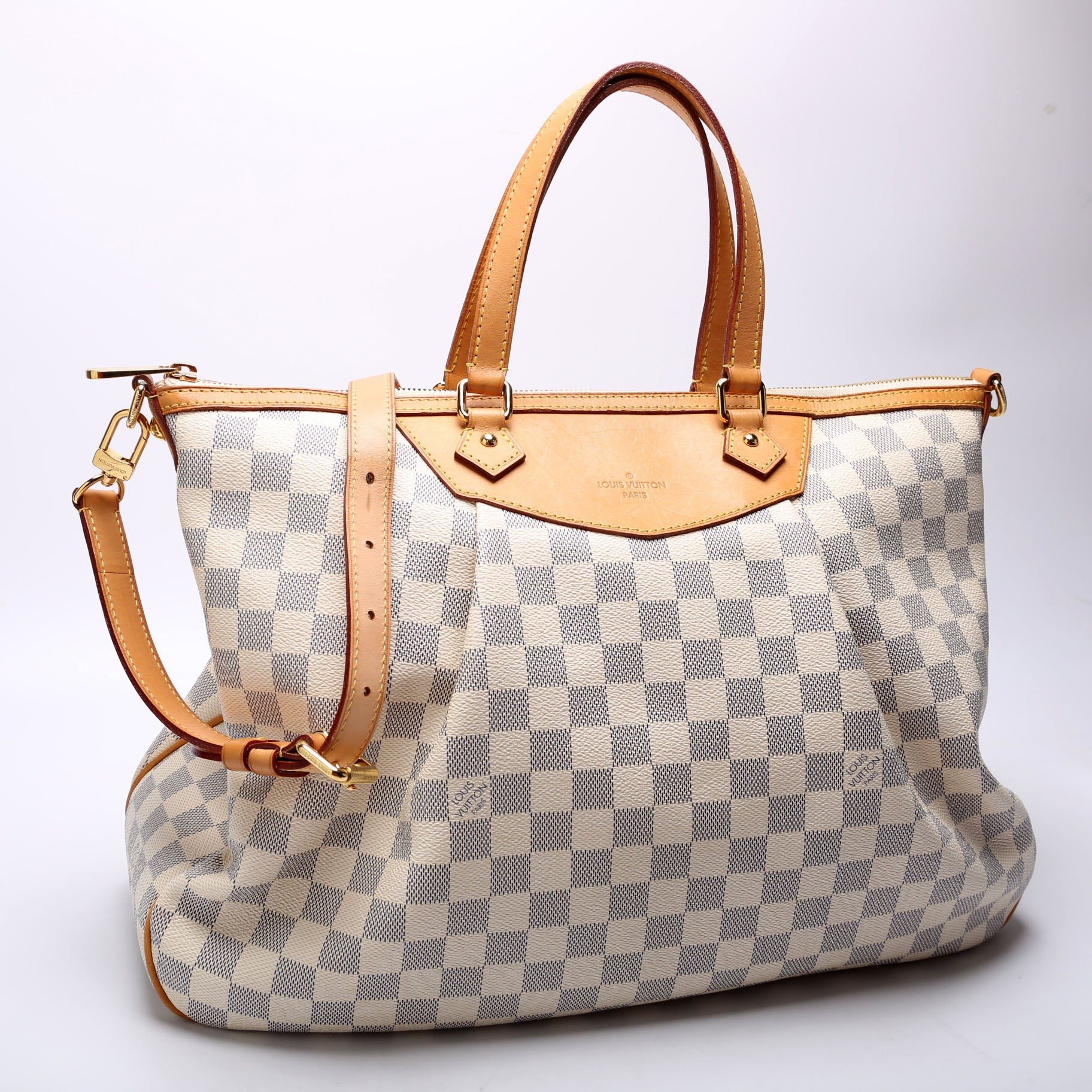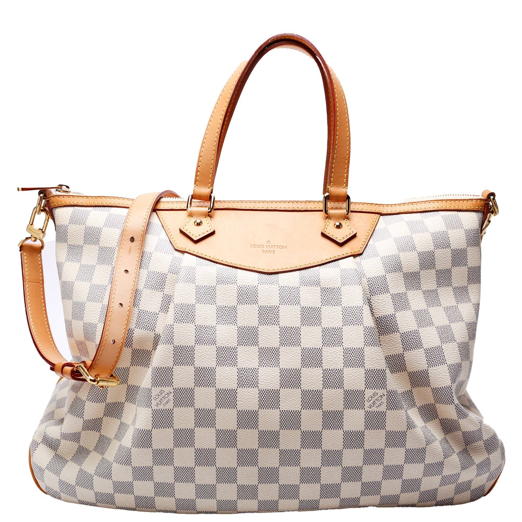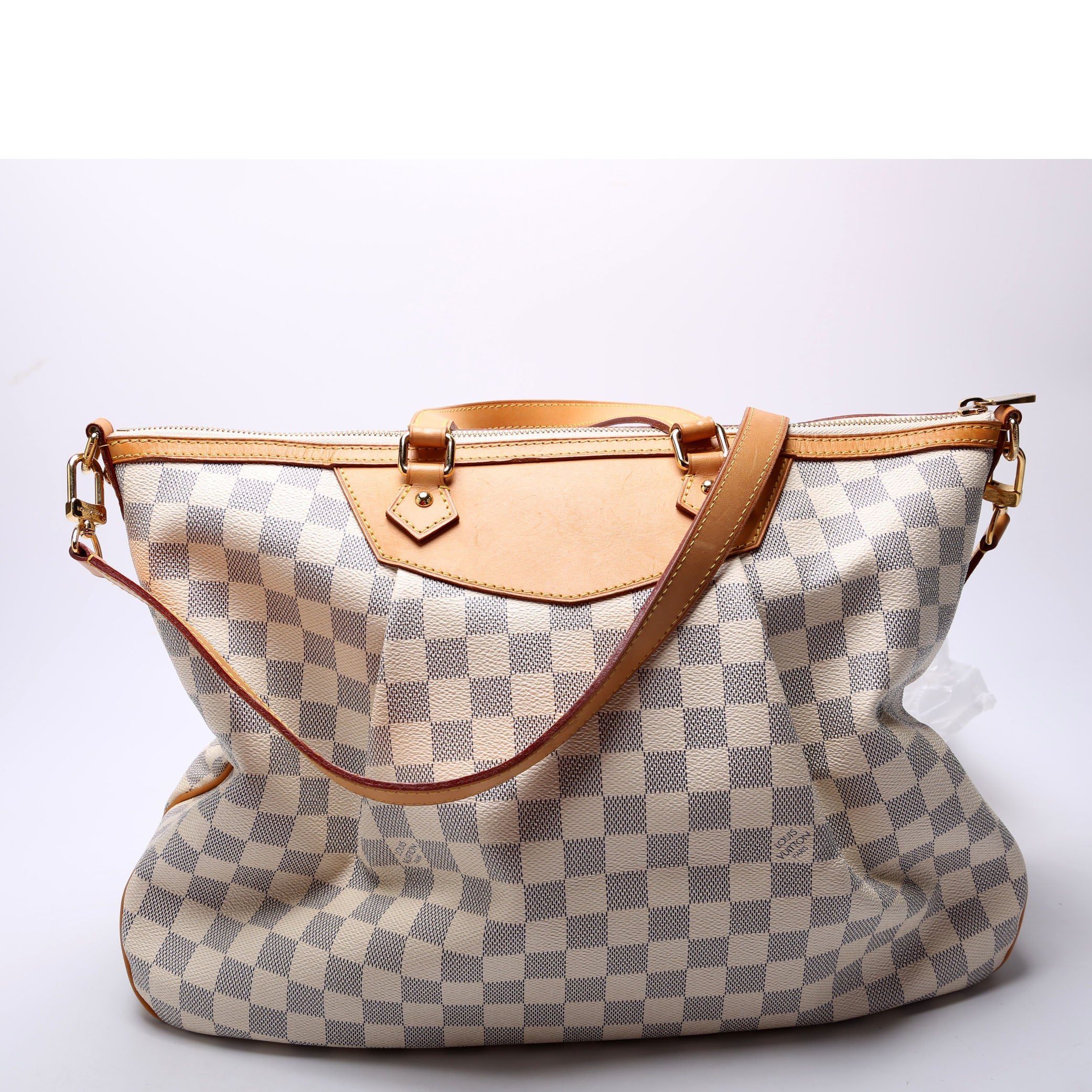 Louis Vuitton Siracusa GM . The exterior is in the classic Louis Vuitton Damier Azur coated canvas.Â