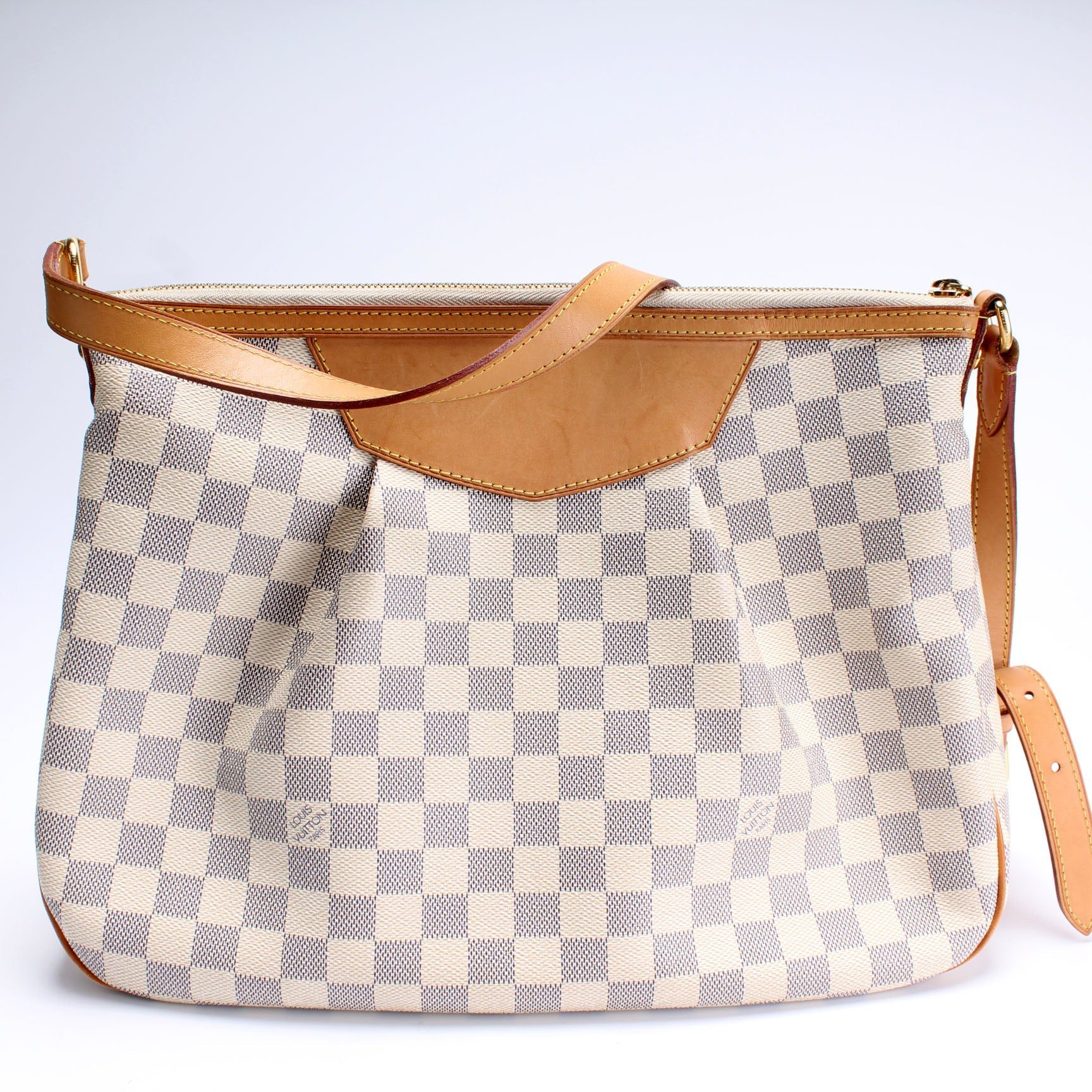 Louis Vuitton Siracusa MM�. The exterior is in the classic Louis Vuitton Damier Azur coated canvas.Â