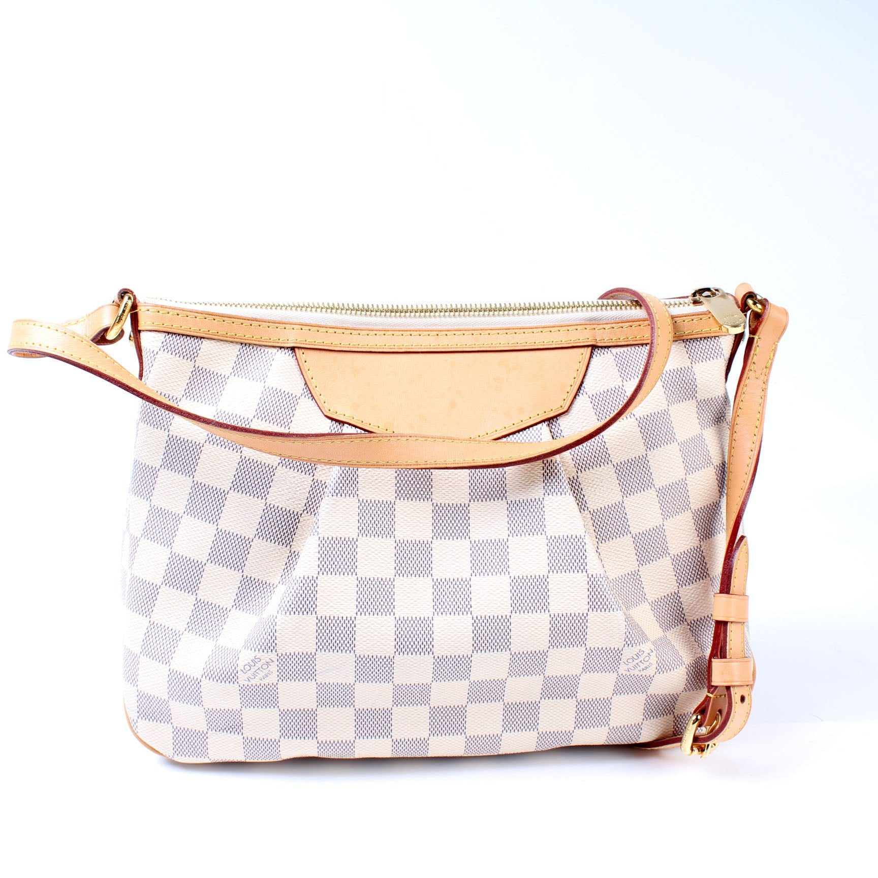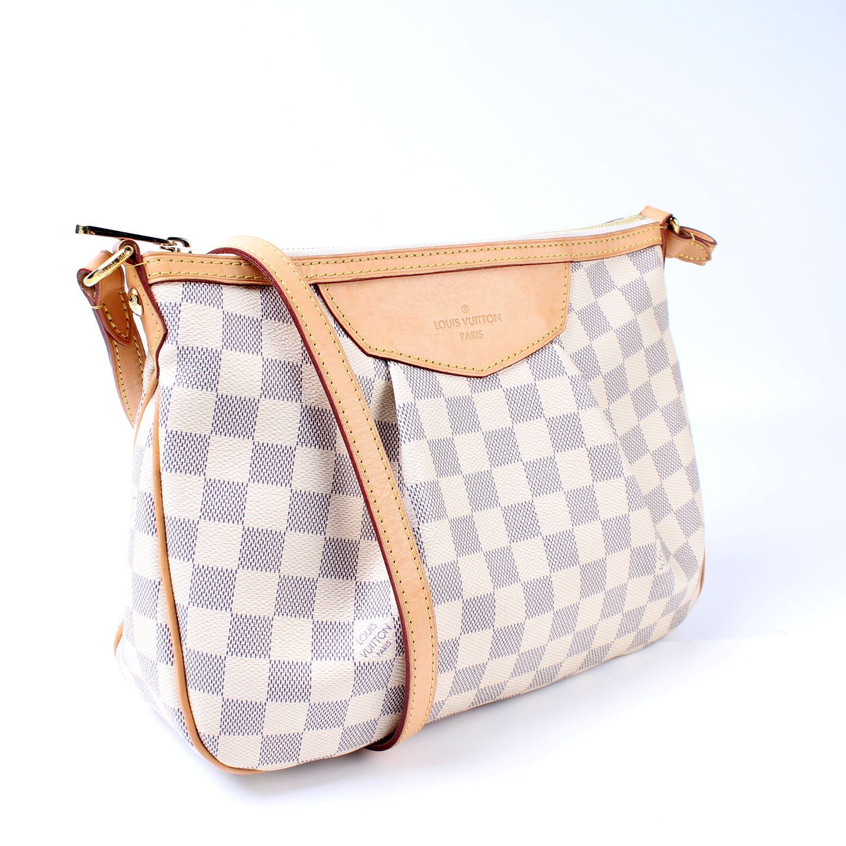 Louis Vuitton Siracusa PM�. The exterior is in the classic Louis Vuitton Damier Azur coated canvas.